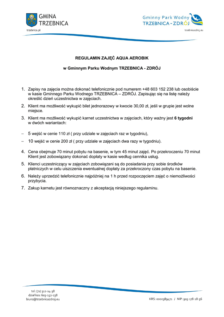 REGULAMIN ZAJĘĆ AQUA AEROBIK w Gminnym Parku Wodnym TRZEBNICA - ZDRÓJ 1. Zapisy na zajęcia można dokonać telefonicznie pod numerem +48 603 152 238 lub osobiście w kasie Gminnego Parku Wodnego TRZEBNICA – ZDRÓJ. Zapisując się na listę należy określić dzień uczestnictwa w zajęciach. 2. Klient ma możliwość wykupić bilet jednorazowy w kwocie 30,00 zł, jeśli w grupie jest wolne miejsce. 3. Klient ma możliwość wykupić karnet uczestnictwa w zajęciach, który ważny jest 6 tygodni w dwóch wariantach: 5 wejść w cenie 110 zł ( przy udziale w zajęciach raz w tygodniu), 10 wejść w cenie 200 zł ( przy udziale w zajęciach dwa razy w tygodniu). 4. Cena obejmuje 70 minut pobytu na basenie, w tym 45 minut zajęć. Po przekroczeniu 70 minut Klient jest zobowiązany dokonać dopłaty w kasie według cennika usług. 5. Klienci uczestniczący w zajęciach zobowiązani są do posiadania przy sobie środków płatniczych w celu uiszczenia ewentualnej dopłaty za przekroczony czas pobytu na basenie. 6. Należy uprzedzić telefonicznie najpóźniej na 1 h przed rozpoczęciem zajęć o niemożliwości przybycia. 7. Zakup karnetu jest równoznaczny z akceptacją niniejszego regulaminu.
