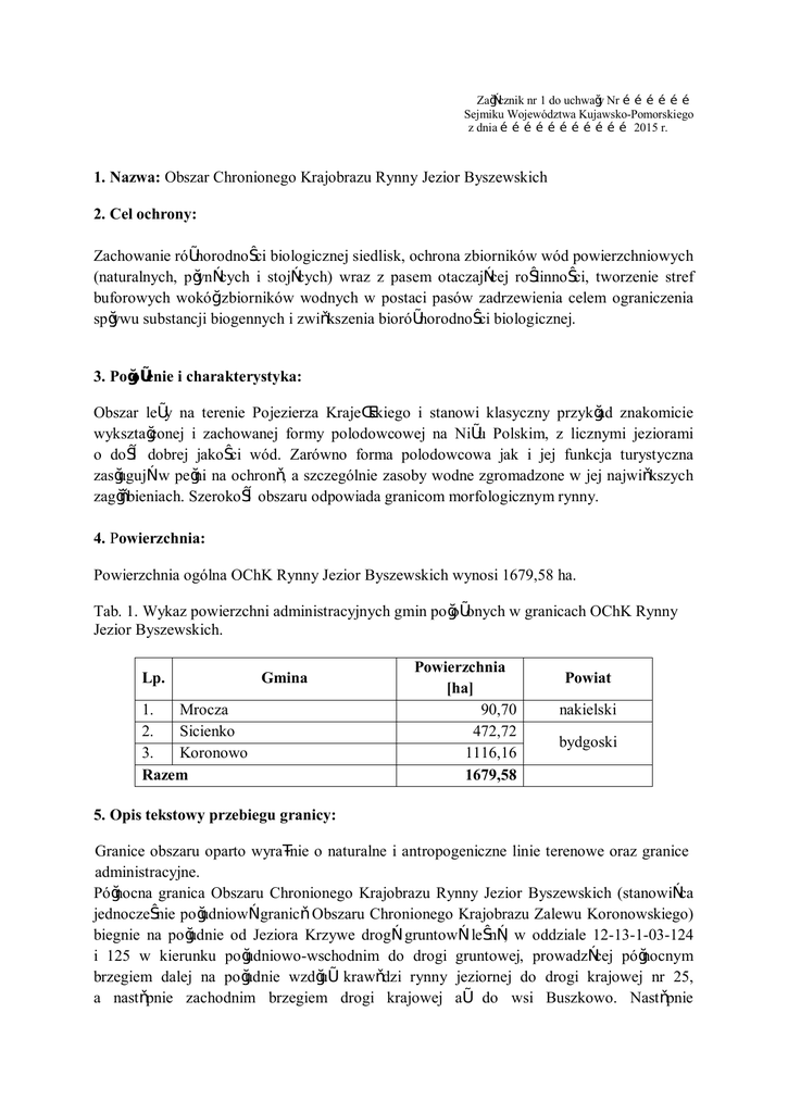 Załącznik nr 1 do uchwały Nr ……………… Sejmiku Województwa Kujawsko-Pomorskiego z dnia …………………………… 2015 r. 1. Nazwa: Obszar Chronionego Krajobrazu Rynny Jezior Byszewskich 2. Cel ochrony: Zachowanie różnorodności biologicznej siedlisk, ochrona zbiorników wód powierzchniowych (naturalnych, płynących i stojących) wraz z pasem otaczającej roślinności, tworzenie stref buforowych wokół zbiorników wodnych w postaci pasów zadrzewienia celem ograniczenia spływu substancji biogennych i zwiększenia bioróżnorodności biologicznej. 3. Położenie i charakterystyka: Obszar leży na terenie Pojezierza Krajeńskiego i stanowi klasyczny przykład znakomicie wykształconej i zachowanej formy polodowcowej na Niżu Polskim, z licznymi jeziorami o dość dobrej jakości wód. Zarówno forma polodowcowa jak i jej funkcja turystyczna zasługują w pełni na ochronę, a szczególnie zasoby wodne zgromadzone w jej największych zagłębieniach. Szerokość obszaru odpowiada granicom morfologicznym rynny. 4. Powierzchnia: Powierzchnia ogólna OChK Rynny Jezior Byszewskich wynosi 1679,58 ha. Tab. 1. Wykaz powierzchni administracyjnych gmin położonych w granicach OChK Rynny Jezior Byszewskich. Lp. Gmina 1. Mrocza 2. Sicienko 3. Koronowo Razem Powierzchnia [ha] 90,70 472,72 1116,16 1679,58 Powiat nakielski bydgoski 5. Opis tekstowy przebiegu granicy: Granice obszaru oparto wyraźnie o naturalne i antropogeniczne linie terenowe oraz granice administracyjne. Północna granica Obszaru Chronionego Krajobrazu Rynny Jezior Byszewskich (stanowiąca jednocześnie południową granicę Obszaru Chronionego Krajobrazu Zalewu Koronowskiego) biegnie na południe od Jeziora Krzywe drogą gruntową leśną, w oddziale 12-13-1-03-124 i 125 w kierunku południowo-wschodnim do drogi gruntowej, prowadzącej północnym brzegiem dalej na południe wzdłuż krawędzi rynny jeziornej do drogi krajowej nr 25, a następnie zachodnim brzegiem drogi krajowej aż do wsi Buszkowo. Następnie w Buszkowie przechodzi w drogę lokalną utwardzoną, której zachodnim skrajem biegnie dalej na południe, przechodząc na wysokości jeziora Wielkie Tobolno w drogę gruntową, która kończy się po dojściu do krótkiego odcinka drogi utwardzonej (prowadzącej dalej do wsi Byszewo) na wysokości północnego brzegu jeziora Piekło. Tutaj granica obszaru odbija na południowy wschód prowadząc po drodze gruntowej leśnej północną krawędzią kompleksu leśnego, do wysokości zabudowań w Skarbiewie, gdzie zmienia kierunek na północny wschód i biegnie dalej wzdłuż jeziora Żabno do jego północno-zachodniego brzegu. Następnie granicą zadrzewienia przebiega w kierunku północnym, a dalej wzdłuż terenu zadrzewionego przylegającego do wschodniej granicy Jeziora Żabno i Kamienne. Biegnie na południe, aby na wysokości południowo wschodniego brzegu jeziora Salno wkroczyć na drogę lokalną utwardzoną, dochodzącą do drogi wojewódzkiej nr 243 prowadzącej z Koronowa do Mroczy. Dalej granica obszaru biegnie na zachód wzdłuż północnej strony drogi nr 243, aż do wysokości Jeziora Proboszczowskiego w Byszewie, gdzie odbija na południowy wschód i drogą polną (wzdłuż działki ewidencyjnej 040304_5.0002.32) wzdłuż Jeziora Studziennego. W rejonie zabudowań w miejscowości Gogolin skręca na zachód i prowadzi dalej na południe przez sady, drogą polną wzdłuż Jeziora Wierzchucińskiego Małego do granicy gminy Mrocza, a stamtąd dalej na południowy zachód drogą polną, omijając od strony wschodniej Jezioro Wierzchucińskie Duże. Na wysokości kościoła w Wierzchucinku skręca na północny zachód i dalej północną stroną drogi gruntowej przecinającą tereny letniskowe, prowadzi w kierunku południowo-zachodnim do południowo-wschodniego brzegu Jeziora Słupowskiego. Dalej biegnie północną i zachodnią granicą ogrodów działkowych, dalej kompleksem leśnym w kierunku zachodnim, a następnie kawałkiem granicy administracyjnej gminy Sicienko i Mrocza, a dalej w kierunku północno-zachodnim wzdłuż południowych brzegów jezior: Słupowskiego i Dzwięrznowskiego. Dalej skręca na północ w drogę gruntową biegnącą do drogi wojewódzkiej, a następnie na wschód południowym skrajem drogi wojewódzkiej nr 243 do wysokości Jeziora Wierzchucińskiego Dużego, gdzie odbija na wschód i prowadzi wzdłuż zachodniego brzegu jezior mijając długi ciąg jezior, aż do drogi krajowej nr 25. Dalej biegnie jej wschodnim brzegiem do połączenia z zachodnim brzegiem jeziora Krzywe w punkcie wyjścia.