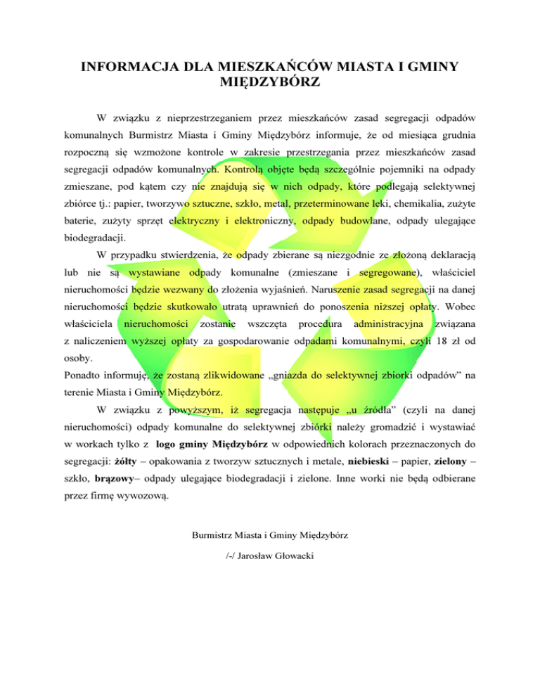 INFORMACJA DLA MIESZKAŃCÓW MIASTA I GMINY MIĘDZYBÓRZ