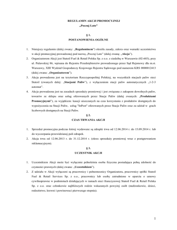 REGULAMIN AKCJI PROMOCYJNEJ „Poczuj Lato” § 1. POSTANOWIENIA OGÓLNE 1. Niniejszy regulamin (dalej zwany: „Regulaminem”) określa zasady, zakres oraz warunki uczestnictwa w akcji promocyjnej prowadzonej pod nazwą „Poczuj Lato” (dalej zwaną: „Akcja”). 2. Organizatorem Akcji jest Statoil Fuel & Retail Polska Sp. z o.o. z siedzibą w Warszawie (02-603), przy ul. Puławskiej 86, wpisana do Rejestru Przedsiębiorców prowadzonego przez Sąd Rejonowy dla m.st. Warszawy, XIII Wydział Gospodarczy Krajowego Rejestru Sądowego pod numerem KRS 0000012413 (dalej zwana: „Organizatorem”). 3. Akcja prowadzona jest na terytorium Rzeczypospolitej Polskiej, na wszystkich stacjach paliw sieci Statoil (zwanych dalej: „Stacjami Paliw”), z wyłączeniem stacji paliw automatycznych „1-2-3 automat”. 4. Akcja prowadzona jest na zasadach sprzedaży premiowej i jest związana z zakupem dowolnych paliw, towarów ze sklepu oraz usług oferowanych przez Stacje Paliw (dalej zwanych: „Produktami Promocyjnymi”), za wyjątkiem: kaucji uiszczanych na czas korzystania z produktów dostępnych do wypożyczenia na Stacji Paliw, usług "InPost" oferowanych przez Stacje Paliw oraz za udział w grach liczbowych dostępnych na Stacji Paliw. § 2. CZAS TRWANIA AKCJI 1. Sprzedaż promocyjna podczas której wydawane są zdrapki trwa od 12.06.2014 r. do 15.09.2014 r. lub do wyczerpania przewidzianej puli zdrapek. 2. Akcja trwa od 12.06.2013 r. do 31.12.2014 r. (okres sprzedaży premiowej wraz z postępowaniem reklamacyjnym). § 3. UCZESTNIK AKCJI 1. Uczestnikiem Akcji może być wyłącznie pełnoletnia osoba fizyczna posiadająca pełną zdolność do czynności prawnych (dalej zwana: „Uczestnikiem”). 2. Z udziału w Akcji wyłączeni są pracownicy i pełnomocnicy Organizatora, pracownicy spółki Statoil Fuel & Retail Services Sp. z o.o., pracownicy lub osoby zatrudnione w oparciu o umowy cywilnoprawne w podmiotach działających w ramach sieci franczyzowej Statoil Fuel & Retail Polska Sp. z o.o. oraz członkowie najbliższych rodzin wskazanych powyżej osób (małżonkowie, dzieci, rodzeństwo, krewni i powinowaci pierwszego stopnia). 1 § 4. ZASADY PROWADZENIA AKCJI 1. W celu wzięcia udziału w Akcji Uczestnik, w okresie o którym mowa w § 2. ust. 1, powinien dokonać jednorazowego, udokumentowanego jednym dowodem zakupu (paragon fiskalny, faktura VAT) zakupu na Stacji Paliw: a) dowolnego rodzaju paliwa, za kwotę co najmniej 100,00 PLN (słownie: sto złotych, 00/100 groszy) brutto, lub b) przynajmniej dwóch innych niż paliwo Produktów Promocyjnych oznaczonych w sposób określony w punkcie 1.1, z zastrzeżeniem powszechnie obowiązujących przepisów prawa, w szczególności ustawy z dnia 26 października 1982 r. o wychowaniu w trzeźwości i przeciwdziałaniu alkoholizmowi (Dz. U. 2012 r. poz. 1356). 2. Produktami Promocyjnymi innymi niż paliwo są wyłącznie towary i usługi dostępne na terenie Stacji Paliw, oznaczone logiem Akcji, umieszczonym na półce lub na dodatkowych ekspozycjach przy produkcie. Szczegółowy wykaz Produktów Promocyjnych dostępny jest na stronie internetowej www.statoil.pl. 3. Dokonanie zakupu według wytycznych wskazanych powyżej uprawnia do pobrania zdrapki. Zdrapka jest zadrukowaną kartką papieru o indywidualnym kodzie kreskowym oraz numerze ewidencyjnym, której część nadruku została zabezpieczona warstwą ochronną uniemożliwiającą odczytanie tekstu bez usunięcia tej warstwy (dalej zwana: Zdrapką). Pod warstwą ochronną umieszczono informacje o dwóch nagrodach do wyboru. 4. Jednorazowy zakup zgodnie z wymogami, o których mowa w ust. 1., stanowiący wielokrotność 100,00 PLN brutto za zakup paliwa lub jednorazowy zakup wielokrotności dwóch Produktów Promocyjnych innych niż paliwo, nie uprawniają do uzyskania więcej niż jednej Zdrapki. 5. W przypadku jednorazowego zakupu dowolnego rodzaju paliwa za co najmniej 100,00 PLN brutto oraz przynajmniej dwóch Produktów Promocyjnych innych niż paliwo, udokumentowanego jednym dowodem zakupu, Uczestnik jest uprawniony do otrzymania dwóch Zdrapek. 6. Uczestnik, który spełni warunki określone w § 4 ust. 1 otrzyma od pracownika Stacji Paliw Zdrapkę. Po usunięciu warstwy zabezpieczającej Zdrapki, Uczestnik zobaczy informację o dwóch nagrodach do wyboru (dalej: „Nagroda”): a) rabat w wysokości 10 groszy na zakup 1 litra paliwa Diesel Gold lub Suprema 98 lub SuperPlus 98, b) rabat w wysokości 25 % na program myjnia Premium. Zdrapki wydaje się wyłącznie na Stacji Paliw, na której dokonano zakupu Produktów Promocyjnych. Po odejściu od kasy wydanie Zdrapki nie jest możliwe. 7. Uczestnikowi przysługuje prawo do wzięcia udziału w Akcji dowolną ilość razy, przy czym dla uzyskania Zdrapki konieczne jest każdorazowe spełnienie wymogów określonych w § 4 pkt 1. 2 8. Wyczerpanie puli Zdrapek przewidzianych w Akcji przed upływem terminu, o którym mowa w § 2 ust. 1 Regulaminu oznacza zakończenie Akcji. § 5. NAGRODY 1. Ilość Zdrapek dostępnych w Akcji jest ograniczona. 2. Każda Zdrapka upoważnia do jednorazowego skorzystania z jednej z Nagród, wedle wyboru Uczestnika, w ten sposób, że rabat zostanie udzielony podczas dokonywania przez niego następnej transakcji nabycia paliwa lub skorzystania z usługi myjni na Stacji Paliw. 3. Uprawnienie do otrzymania Nagrody może zostać zrealizowane do dnia 31.10.2014 r. 4. W celu realizacji Nagrody Uczestnik zobowiązany jest przekazać pracownikowi Stacji Paliw zdrapkę, z usuniętą całą warstwą zabezpieczającą. 5. Przekazanie Zdrapki pracownikowi Stacji Paliw musi nastąpić przed dokonaniem płatności za zakup objęty zniżką wskazaną w Nagrodzie. Płatności za zakupy dokonywane kartą ROUTEX, UTA lub DKV nie są objęte zniżką wskazaną w Nagrodzie. 6. Nagroda w postaci rabatu w wysokości 10 groszy na zakup 1 litra paliwa Diesel Gold lub Suprema 98 dotyczy każdego litra paliwa zakupionego przez Ucze