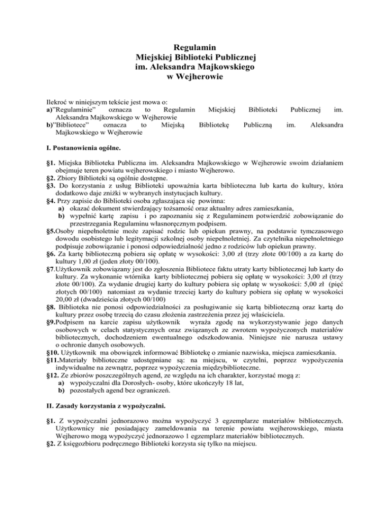 Regulamin Miejskiej Biblioteki Publicznej im. Aleksandra Majkowskiego w Wejherowie Ilekroć w niniejszym tekście jest mowa o: a)”Regulaminie” oznacza to Regulamin Miejskiej Aleksandra Majkowskiego w Wejherowie b)”Bibliotece” oznacza to Miejską Bibliotekę Majkowskiego w Wejherowie Biblioteki Publiczną Publicznej im. im. Aleksandra I. Postanowienia ogólne. §1. Miejska Biblioteka Publiczna im. Aleksandra Majkowskiego w Wejherowie swoim działaniem obejmuje teren powiatu wejherowskiego i miasto Wejherowo. §2. Zbiory Biblioteki są ogólnie dostępne. §3. Do korzystania z usług Biblioteki upoważnia karta biblioteczna lub karta do kultury, która dodatkowo daje zniżki w wybranych instytucjach kultury. §4. Przy zapisie do Biblioteki osoba zgłaszająca się powinna: a) okazać dokument stwierdzający tożsamość oraz aktualny adres zamieszkania, b) wypełnić kartę zapisu i po zapoznaniu się z Regulaminem potwierdzić zobowiązanie do przestrzegania Regulaminu własnoręcznym podpisem. §5.Osoby niepełnoletnie może zapisać rodzic lub opiekun prawny, na podstawie tymczasowego dowodu osobistego lub legitymacji szkolnej osoby niepełnoletniej. Za czytelnika niepełnoletniego podpisuje zobowiązanie i ponosi odpowiedzialność jedno z rodziców lub opiekun prawny. §6. Za kartę biblioteczną pobiera się opłatę w wysokości: 3,00 zł (trzy złote 00/100) a za kartę do kultury 1,00 zł (jeden złoty 00/100). §7.Użytkownik zobowiązany jest do zgłoszenia Bibliotece faktu utraty karty bibliotecznej lub karty do kultury. Za wykonanie wtórnika karty bibliotecznej pobiera się opłatę w wysokości: 3,00 zł (trzy złote 00/100). Za wydanie drugiej karty do kultury pobiera się opłatę w wysokości: 5,00 zł (pięć złotych 00/100) natomiast za wydanie trzeciej karty do kultury pobiera się opłatę w wysokości 20,00 zł (dwadzieścia złotych 00/100) §8. Biblioteka nie ponosi odpowiedzialności za posługiwanie się kartą biblioteczną oraz kartą do kultury przez osobę trzecią do czasu złożenia zastrzeżenia przez jej właściciela. §9.Podpisem na karcie zapisu użytkownik wyraża zgodę na wykorzystywanie jego danych osobowych w celach statystycznych oraz związanych ze zwrotem wypożyczonych materiałów bibliotecznych, dochodzeniem ewentualnego odszkodowania. Niniejsze nie narusza ustawy o ochronie danych osobowych. §10. Użytkownik ma obowiązek informować Bibliotekę o zmianie nazwiska, miejsca zamieszkania. §11.Materiały biblioteczne udostępniane są: na miejscu, w czytelni, poprzez wypożyczenia indywidualne na zewnątrz, poprzez wypożyczenia międzybiblioteczne. §12. Ze zbiorów poszczególnych agend, ze względu na ich charakter, korzystać mogą z: a) wypożyczalni dla Dorosłych- osoby, które ukończyły 18 lat, b) pozostałych agend bez ograniczeń. II. Zasady korzystania z wypożyczalni. §1. Z wypożyczalni jednorazowo można wypożyczyć 3 egzemplarze materiałów bibliotecznych. Użytkownicy nie posiadający zameldowania na terenie powiatu wejherowskiego, miasta Wejherowo mogą wypożyczyć jednorazowo 1 egzemplarz materiałów bibliotecznych. §2. Z księgozbioru podręcznego Biblioteki korzysta się tylko na miejscu. §3.Materiały biblioteczne wypożycza się na okres nieprzekraczający 30 dni. Jeżeli jednak zwrot materiałów bibliotecznych przypada na poniedziałek, święto, dzień wolny od pracy to materiały biblioteczne należy zwrócić przed tym dniem- w dniu pracy Biblioteki. § 4. Bibliotekarz może żądać zwrotu materiałów bibliotecznych przed terminem ustalonym w § 3, jeżeli stanowią one pozycje szczególnie poszukiwane. III. Zasady korzystania z czytelni. A. Postanowienia ogólne. § 1. Z czytelni może korzystać każdy zainteresowany posiadający kartę biblioteczną lub kartę do kultury. § 2. W czytelni obowiązuje cisza, zakaz spożywania napojów i posiłków oraz prowadzenia rozmów przez telefony komórkowe. § 3. Wnoszone do czytelni materiały własne należy zgłosić u dyżurnego bibliotekarza. § 4. Zabrania się wynoszenia materiałów bibliotecznych będących własnością Biblioteki, poza jej siedzibę. § 5. Z księgozbioru czytelni korzysta się wyłącznie na miejscu i za pośrednictwem bibliotekarza. §6. Na prośbę czytelnika, Biblioteka może sprowadzić książki z innych bibliotek. Materiały sprowadzone udostępniane są wyłącznie w czytelni. § 7. Czytelnik może zwracać się do dyżurnego bibliotekarza o informacje dotyczące książek, czasopism, o pomoc w korzystaniu z katalogów. § 8. Pracownicy Biblioteki są uprawnieni do dokonywania kontroli sposobu korzystania z materiałów bibliotecznych przez użytkownika. B. Postanowienia szczególne dla czytelni czasopism § 1. Z czytelni czasopism może korzystać każdy zainteresowany posiadający kartę biblioteczną lub kartę do kultury. § 2. W czytelni czasopism czytelnik wybiera samodzielnie jedynie bieżące numery czasopism i prasy, po czym informuje o tym pracownika biblioteki. C. Postanowienia szczególne dla czytelni internetowej. § 1. Z czytelni internetowej może korzystać każdy zainteresowany posiadający kartę biblioteczną lub kartę do kultury. § 2. Korzystanie ze sprzętu informatycznego będącego własnością Biblioteki, w tym z Internetu jest bezpłatne. § 3. Czas pracy na komputerach jest ograniczony i w danym dniu może trwać 60 minut. Czas pracy na komputerze może zostać przedłużony, w uzasadnionych przypadkach po decyzji pracownika Biblioteki § 4. Przy jednym stanowisku komputerowym nie mogą przebywać więcej niż 1 osoba. § 5. Praca na komputerach Biblioteki jest monitorowana. § 6. Informacji wyszukanych w licencjonowanych bazach danych nie można edytować, przetwarzać, zapisywać na komputerach Biblioteki. § 7. Zabrania się : a) samodzielnego instalowania oprogramowania, b) otwierania stron zawierających nielegalne oprogramowanie, treści pornograficzne, propagujące przemoc, rasizm 