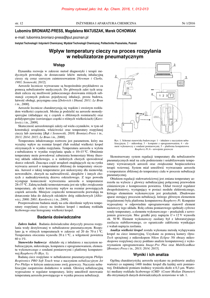 Prosimy cytować jako: Inż. Ap. Chem. 2016, 1, 012-013 str. 12 INŻYNIERIA I APARATURA CHEMICZNA Nr 1/2016 Lubomira BRONIARZ-PRESS, Magdalena MATUSZAK, Marek OCHOWIAK e-mail: [email protected] Instytut Technologii i Inżynierii Chemicznej, Wydział Technologii Chemicznej, Politechnika Poznańska, Poznań Wpływ temperatury cieczy na proces rozpylania w nebulizatorze pneumatycznym Wstęp Dynamika rozwoju w zakresie metod diagnostyki i terapii medycznych powoduje, że dostarczanie leków metodą inhalacyjną cieszy się coraz szerszym zainteresowaniem [Newman i Clarke, 1983; Sosnowski, 2012]. Aerozole lecznicze wytwarzane są bezpośrednio przykładowo za pomocą nebulizatorów medycznych. Do głównych zalet tych urządzeń zalicza się możliwość jednoczesnego dozowania różnych substancji czynnych podczas pojedynczej inhalacji, prosta budowa, łatwość obsługi, przystępna cena [Dolovich i Dhand, 2011; Le Brun i in., 2000]. Aerozole lecznicze charakteryzują się wąskim i swoistym rozkładem wielkości cząsteczek. Można je podzielić na aerozole monodyspersyjne (składające się z cząstek o zbliżonych rozmiarach) oraz polidyspersyjne (zawierające cząstki o różnych wielkościach) [Karolewicz i in., 2009]. Skuteczność aerozoloterapii zależy od wielu czynników, w tym od konstrukcji urządzenia, właściwości oraz temperatury rozpylanej cieczy lub zawiesiny [Bąk i Sosnowski, 2010; Broniarz-Press i in., 2013; 2014; 2015; Le Brun i in., 2000]. Temperatura inhalowanego roztworu jest parametrem, który ma wyraźny wpływ na rozmiar kropel i/lub rozkład wielkości kropel otrzymanych w wyniku rozpylania. Temperatura aerozolu u wylotu z nebulizatora w wyniku rozpylania spada o 10÷15 ºC. Obniżenie temperatury może powodować zaburzenia homeostazy błony śluzowej układu oddechowego, a u niektórych chorych spowodować skurcz oskrzeli. Znacząca część urządzeń znajdujących się na rynku wytwarza aerozol o temperaturze zbliżonej do temperatury otoczenia. Aerozol o takiej temperaturze jest niekorzystny dla niemowląt, noworodków, chorych na nadwrażliwość, alergików i innych chorych z nadreaktywnością drzewa oskrzelowego. Z tego powodu występuje konieczność wytworzenia aerozolu o temperaturze 28÷37 ºC. Zaletą techniki termostatowania jest nie tylko zwiększenie temperatury, ale także korzystny wpływ na rozmiar powstających cząstek aerozolu. Mniejsze cząsteczki termoaerozolu pozwalają na dotarczenie leku do dalszych odcinków dróg oddechowych [Alkiewicz, 2000; 2001; Karolewicz i in., 2009]. Przeprowadzone badania miały na celu określenie wpływu temperatury rozpylanej cieczy na średnice kropel i medianę rozkładu liczbowego oraz histogramy wielkości kropel. Badania doświadczalne Zakres badań. Badania doświadczalne dotyczyły procesu rozpylania wody destylowanej w nebulizatorze pneumatycznym. Rozpylano ją w różnych temperaturach w zakresie od 20 do 70 ± 1 ºC. Temperatura otoczenia wynosiła 20 ± 1 ºC, a wilgotność powietrza 60 ± 1%. Stanowisko badawcze składało się z inhalatora z naczyniem nebulizacyjnym, mikroskopu, komputera z oprogramowaniem, elementu wykonawczego z sondami pomiarowymi i platformy komputerowej Raspberry Pi (Rys. 1). Badaną ciecz rozpylano w nebulizatorze pneumatycznym Philips Respironics PRO Soft Touch wraz z naczyniem nebulizacyjnym Jet Pro Philips w którym umieszczono zwój grzewczy. Naczynie nebulizacyjne zaopatrzono dodatkowo w ustnik. Głowicę nebulizacyjną wyposażono w regulator temperatury, który umożliwił sterowanie temperaturą aerozolu powstającego w wyniku procesu nebulizacji. Rys. 1. Schemat stanowiska badawczego: 1 – inhalator z naczyniem nebulizacyjnym, 2 – mikroskop, 3 – komputer z oprogramowaniem, 4 – element wykonawczy z sondami pomiarowymi, 5 – platforma komputerowa Raspberry Pi; 6 – uzwojenie grzewcze Skonstruowany system regulacji temperatury dla nebulizatorów pneumatycznych miał na celu podniesienie i ustabilizowanie temperatury wytwarzanych aerozoli oraz zwiększenie bezpieczeństwa terapii wziewnej. System miał umożliwić wytwarzanie aerozolu o temperaturze zbliżonej do temperatury ciała w procesie nebulizacji pneumatycznej. Obiektem regulacji stałowartościowej jest zmiana temperatury aerozolu na wylocie z głowicy nebulizacyjnej połączonej przewodem ciśnieniowym z kompresorem powietrza. Układ tworzył regulator dwupołożeniowy, występujący w postaci modułu elektronicznego, którego elementem wykonawczym jest przekaźnik. Zbudowano aparat sterujący procesem nebulizacji, którego głównym elementem (regulatorem) była platforma komputerowa Raspberry Pi. Komputer wyposażony w odpowiednie oprogramowanie stanowił element nastawczy tego układu. Rolę członu pomiarowego spełniały cyfrowe sondy temperatury, a elementu wykonawczego – przekaźnik z uzwojeniem grzewczym. Moc grzałki przy napięciu U = 12 V wynosiła ok. 50 W. Element wykonawczy zasilany był z laboratoryjnego zasilacza stabilizowanego, co ograniczało zakłócenia wynikające z wahań napięcia zasilania. Analiza wielkości kropel została wykonana metodą wyłapywania kropel na ciecz immersyjną. Uzyskane za pomocą kamery OptaTech sprzężonej z mikroskopem Nikon Eclipse 50i obrazy mikroskopowe rozpylonej cieczy poddano analizie komputerowej z wykorzystaniem oprogramowania Image-Pro Plus oraz MultiScanBase [Broniarz-Press i in., 2013; 2014; 2015]. Wyniki i ich analiza Ogólną charakterystykę aerozolu uzyskano na podstawie analizy wartości co najmniej 1400 średnic kropel dla każdej serii pomiarowej. Dokładność pomiaru średnicy wyniosła około ± 0,3 µm. Wartości mediany rozkładu liczbowego (CMD (Count Median Diameter) dla otrzymanych danych doświadczalnych zestawiono w tab. 1. Prosimy cytować jako: Inż. Ap. Chem. 2016, 1, 012-013 Nr 1/2016 Tab. 1. INŻYNIERIA I APARATURA CHEMICZNA Charakterystyczne parametry opisujące proces rozpylania Temperatura cieczy tc, [ºC] L