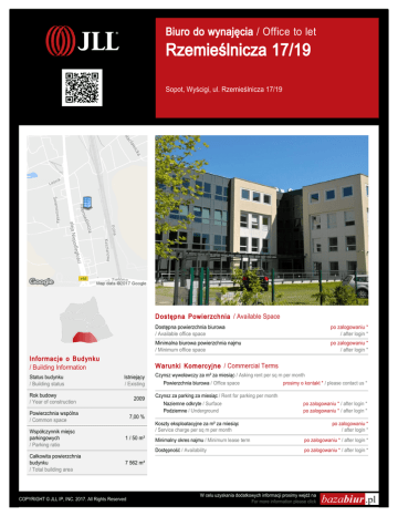 Biuro do wynajęcia / Office to let Rzemieślnicza 17/19 Sopot, Wyścigi, ul. Rzemieślnicza 17/19 Dostępna Powierzchnia / Available Space Informacje o Budynku / Building Information Status budynku / Building status Dostępna powierzchnia biurowa / Available office space po zalogowaniu * / after login * Minimalna biurowa powierzchnia najmu / Minimum office space po zalogowaniu * / after login * Warunki Komercyjne / Commercial Terms Istniejący / Existing Rok budowy / Year of construction 2009 Powierzchnia wspólna / Common space 7,00 % Czynsz wywoławczy za m² za miesiąc / Asking rent per sq m per month Powierzchnia biurowa / Office space prosimy o kontakt * / please contact us * Czynsz za parking za miesiąc / Rent for parking per month Naziemne odkryte / Surface Podziemne / Underground po zalogowaniu * / after login * po zalogowaniu * / after login * Koszty eksploatacyjne za m² za miesiąc / Service charge per sq m per month Współczynnik miejsc parkingowych / Parking ratio 1 / 50 m² Całkowita powierzchnia budynku / Total building area 7 562 m² COPYRIGHT © JLL IP, INC. 2017. All Rights Reserved po zalogowaniu * / after login * Minimalny okres najmu / Minimum lease term po zalogowaniu * / after login * Dostępność / Availability po zalogowaniu * / after login * W celu uzyskania dodatkowych informacji prosimy wejdź na For more information please click Dostępna Powierzchnia / Available Space Piętro / Floor Powierzchnia wolna / Vacant space Dostępność / Availability 0 prosimy o kontakt * / please contact us * prosimy o kontakt * / please contact us * 1 prosimy o kontakt * / please contact us * prosimy o kontakt * / please contact us * Razem / Total po zalogowaniu * / after login * Standardowe Wykończenie / Standard Fit-Out Typowy Plan Piętra / Typical Floor Plan Klimatyzacja / Air conditioning Podnoszone podłogi / Raised floor Podwieszany sufit / Suspended ceiling Okablowanie telefoniczne / Telephone cabling Okablowanie komputerowe / Computer cabling Okablowanie elektryczne / Power cabling Tryskacze / Sprinklers Czujniki dymu / Smoke detectors Wykładzina / Carpeting Podział powierzchni ściankami / Wall partitioning Recepcja / Reception Ochrona budynku / Security Kable światłowodowe / Fiber optics Uchylne okna / Openable windows W celu uzyskania dodatkowych informacji lub zorganizowania spotkania prosimy o kontakt: / For more information or to arrange a viewing please contact: +48 58 350 62 62 Niniejsze warunki mają charakter wyłącznie informacyjny i nie stanowią części wiążącej oferty lub umowy. / The Property Particulars are for information purposes only and do not form any part of binding offer or contract. COPYRIGHT © JLL IP, INC. 2017. All Rights Reserved W celu uzyskania dodatkowych informacji prosimy wejdź na For more information please click
