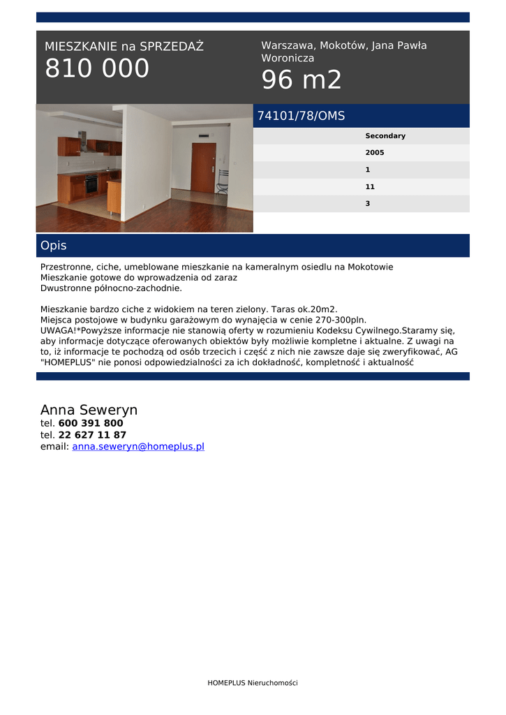 MIESZKANIE na SPRZEDAŻ 810 000 Warszawa, Mokotów, Jana Pawła Woronicza 96 m2 74101/78/OMS Secondary 2005 1 11 3 Opis Przestronne, ciche, umeblowane mieszkanie na kameralnym osiedlu na Mokotowie Mieszkanie gotowe do wprowadzenia od zaraz Dwustronne północno-zachodnie. Mieszkanie bardzo ciche z widokiem na teren zielony. Taras ok.20m2. Miejsca postojowe w budynku garażowym do wynajęcia w cenie 270-300pln. UWAGA!*Powyższe informacje nie stanowią oferty w rozumieniu Kodeksu Cywilnego.Staramy się, aby informacje dotyczące oferowanych obiektów były możliwie kompletne i aktualne. Z uwagi na to, iż informacje te pochodzą od osób trzecich i część z nich nie zawsze daje się zweryfikować, AG "HOMEPLUS" nie ponosi odpowiedzialności za ich dokładność, kompletność i aktualność Anna Seweryn tel. 600 391 800 tel. 22 627 11 87 email: [email protected] HOMEPLUS Nieruchomości Powered by TCPDF (www.tcpdf.org)