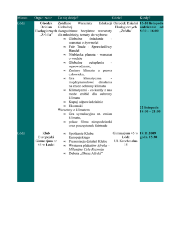 Miasto Organizator Łódź Ośrodek Źródlane Warsztaty Edukacji Ośrodek Działań Działań Globalnej Ekologicznych Ekologicznych dwugodzinne bezpłatne warsztaty „Źródła” „Źródła” dla młodzieży, tematy do wyboru: • Globalne śniadanie warsztat o żywności • Fair Trade - Sprawiedliwy Handel • Niebieska planeta - warsztat o wodzie • Globalne ocieplenie wprowadzenie, • Zmiany klimatu a prawa człowieka, • Gra klimatyczna międzynarodowe działania na rzecz ochrony klimatu • Klimatyczni - co każdy z nas może zrobić dla ochrony klimatu • Kupuj odpowiedzialnie • Ekoznaki Warsztaty z klimatem • Gra symulacyjna nt. zmian klimatu, • pokaz filmu niespodzianki oraz poczęstunek fairtrade Łódź Klub Europejski Gimnazjum nr 46 w Łodzi Co się dzieje? • • • • Gdzie? Kiedy? 16-20 listopada codziennie od 8:30 – 16:00 22 listopada 18:00 – 21:00 Gimnazjum 46 w 19.11.2009 Spotkanie Klubu Łódź godz. 15.30 Europejskiego Ul. Krochmalna Prezentacja działań Klubu 15 Wystawa plakatów Afryka – Milenijne Cele Rozwoju Debata „Obraz Afryki” Miasto Łódź Organizator Etnoinspiracje Co się dzieje? • Gdzie? Kiedy? PM 170 w Łodzi, 16.11.2009 – W ramach projektu Szkoła 22.11.2009r. „Urodziliśmy się Ty tam, ja tu – dzieciństwo i młodość w Podstawowa nr 34, Szkoła krajach Globalnego Południa Podstawowa nr 11, a polska rzeczywistość”, Szkoła który jest współfinansowany przez Fundację Edukacja dla Podstawowa nr 202 im. Jana Demokracji w ramach Pawła II w Łodzi, programu pomocy Specjalistyczna zagranicznej Ministerstwa Placówka Spraw Zagranicznych RP w Wsparcia 2009 r., odbędzie się 10 Dziennego wydarzeń organizowanych „Anielisko”, Dom przez szkoły, placówki Dziecka nr4 w biorące udział w naszym Łodzi, 21 LO im. projekcie B. Prusa w Łodzi, • prezentacje gier lub bajek 33 LO im. Armii inspirowanych Krajowej w Łodzi, wiadomościami zdobytymi 34 Liceum podczas warsztatów Ogólnokształcące przeprowadzonych przez im. Krzysztofa ETNOINSPIRACJE Kieślowskiego, 46 LO w Łodzi 16-22 listopada Ksawerów Gimnazjum w W ramach TEG odbędą się: Gimnazjum, ul. Ksawerowie Zachodnia 33 • lekcje wychowawcze na różne tematy z zakresu edukacji globalnej we wszystkich klasach • konkurs na plakat o tematyce globalnej • wystawa plakatów