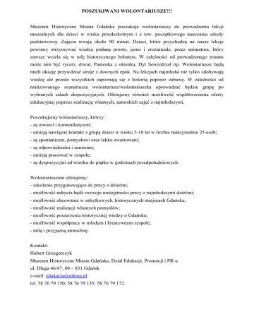 POSZUKIWANI WOLONTARIUSZE!!! Muzeum Historyczne Miasta Gdańska poszukuje wolontariuszy do prowadzenia lekcji muzealnych dla dzieci w wieku przedszkolnym i z tzw. początkowego nauczania szkoły podstawowej. Zajęcia trwają około 90 minut. Dzieci, które przychodzą na nasze lekcje powinny otrzymywać wiedzę podaną prosto, jasno i zrozumiale, przez animatora, który zawsze wciela się w rolę historycznego bohatera. W zależności od prowadzonego tematu może nim być rycerz, drwal, Panienka z okienka, Dyl Sowizdrzał itp. Wolontariusze będą mieli okazję przywdziać stroje z dawnych epok. Na lekcjach najmłodsi nie tylko zdobywają wiedzę ale przede wszystkich zapoznają się z historią poprzez zabawę. W zależności od realizowanego scenariusza wolontariusz/wolontariuszka oprowadzać będzie grupę po wybranych salach ekspozycyjnych. Oferujemy również możliwość współtworzenia oferty edukacyjnej poprzez realizację własnych, autorskich zajęć z najmłodszymi. Poszukujemy wolontariuszy, którzy: - są otwarci i komunikatywni; - umieją nawiązać kontakt z grupą dzieci w wieku 5-10 lat w liczbie maksymalnie 25 osób; - są spontaniczni, pomysłowi oraz lekko zwariowani; - są odpowiedzialni i sumienni; - umieją pracować w zespole; - są dyspozycyjni od wtorku do piątku w godzinach przedpołudniowych. Wolontariuszom oferujemy: - szkolenie przygotowujące do pracy z dziećmi; - możliwość nabycia bądź rozwoju umiejętności pracy z najmłodszymi dziećmi; - możliwość obcowania w zabytkowych, historycznych miejscach Gdańska; - możliwość realizacji własnych pomysłów; - możliwość poszerzenia historycznej wiedzy o Gdańsku; - możliwość współpracy w młodym i kreatywnym zespole; - miłą i przyjazną atmosferę. Kontakt: Hubert Grzegorczyk Muzeum Historyczne Miasta Gdańska, Dział Edukacji, Promocji i PR-u ul. Długa 46/47, 80 – 831 Gdańsk e-mail: [email protected] tel. 58 76 79 150; 58 76 79 135; 58 76 79 172.