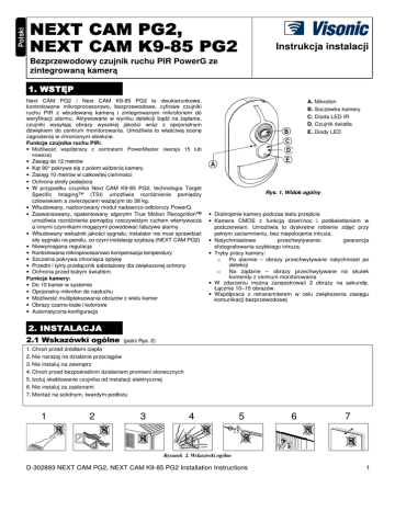 Polski NEXT CAM PG2, NEXT CAM K9 K9--85 PG2 Instrukcja instalacji Bezprzewodowy czujnik ruchu PIR PowerG ze zintegrowaną kamerą 1. WSTĘP Next CAM PG2 / Next CAM K9-85 PG2 to dwukierunkowe, kontrolowane mikroprocesorowo, bezprzewodowe, cyfrowe czujniki ruchu PIR z wbudowaną kamerą i zintegrowanym mikrofonem do weryfikacji alarmu. Aktywowane w wyniku detekcji bądź na żądanie, czujniki wysyłają obrazy wysokiej jakości wraz z opcjonalnym dźwiękiem do centrum monitorowania. Umożliwia to właściwą ocenę zagrożenia w chronionym obiekcie. Funkcje czujnika ruchu PIR: • Możliwość współpracy z centralami PowerMaster (wersja 15 lub A. Mikrofon B. Soczewka kamery C. Dioda LED IR D. Czujnik światła C D E nowsza) Zasięg do 12 metrów Kąt 90° pokrywa się z polem widzenia kamery Zasięg 10 metrów w całkowitej ciemności Ochrona strefy podejścia W przypadku czujnika Next CAM K9-85 PG2, technologia Target Specific Imaging™ (TSI) umożliwia rozróżnienie pomiędzy człowiekiem a zwierzęciem ważącym do 38 kg. • Wbudowany, nadzorowany moduł nadawczo-odbiorczy PowerG. • Zaawansowany, opatentowany algorytm True Motion Recognition™ umożliwia rozróżnienie pomiędzy rzeczywistym ruchem włamywacza a innymi czynnikami mogącymi powodować fałszywe alarmy. • Wbudowany wskaźnik jakości sygnału; instalator nie musi sprawdzać siły sygnału na panelu, co czyni instalację szybszą (NEXT CAM PG2) • Niewymagana regulacja • Kontrolowana mikroprocesorowo kompensacja temperatury • Szczelna pokrywa chroniąca optykę • Przedni i tylny przełącznik sabotażowy dla zwiększonej ochrony • Ochrona przed białym światłem. Funkcje kamery: • Do 10 kamer w systemie • Opcjonalny mikrofon do nasłuchu • Możliwość multipleksowania obrazów z wielu kamer • Obrazy czarno-białe i kolorowe • Automatyczna konfiguracja • • • • • E. Diody LED B A Rys. 1. Widok ogólny • Dostrojenie kamery podczas testu przejścia • Kamera CMOS z funkcją dzień/noc i podświetleniem w podczerwieni. Umożliwia to dyskretne robienie zdjęć przy pełnym zaciemnieniu, bez niepokojenia intruza. • Natychmiastowe przechwytywanie: gwarancja sfotografowania szybkiego intruza. • Tryby pracy kamery: o Po alarmie – obrazy przechwytywane natychmiast po detekcji o Na żądanie – obrazy przechwytywane na skutek komendy z centrum monitorowania • W zdarzeniu można zarejestrować 2 obrazy na sekundę. Łącznie 10–15 obrazów. • Współpraca z retransmiterem w celu zwiększenia zasięgu komunikacji bezprzewodowej 2. INSTALACJA 2.1 Wskazówki ogólne (patrz Rys. 2) 1. Chroń przed źródłami ciepła 2. Nie narażaj na działanie przeciągów 3. Nie instaluj na zewnątrz 4. Chroń przed bezpośrednim działaniem promieni słonecznych 5. Izoluj okablowanie czujnika od instalacji elektrycznej 6. Nie instaluj za zasłonami 7. Montaż na solidnym, twardym podłożu 1 2 3 4 5 6 7 Rysunek 2. Wskazówki ogólne D-302893 NEXT CAM PG2, NEXT CAM K9-85 PG2 Installation Instructions 1 Ważne! Czujnik Next CAM K9-85 PG2 jest odporny na ruch zwierząt do 38 kg poruszających się po podłodze lub znajdujących się na meblach pod warunkiem, że ich aktywność ma miejsce poniżej wysokości 1 m. Powyżej jednego metra odporność czujnika zmniejsza się do wagi 19 kg i maleje wraz ze zbliżaniem się zwierzęcia do czujnika. W związku z tym zalecane jest takie wybranie lokalizacji czujnika, która minimalizuje możliwość zbliżenia się zwierzęcia do czujnika. 2.2 Montaż Wskazówki: 1. Zamocuj czujnik w taki sposób, aby jego orientacja była prostopadła do oczekiwanej drogi ruchu włamywacza. 2. Przy instalacji czujnika na wysokości dwóch metrów, strefa martwa to 71 cm na 0 m i 16 cm na 1.5 m. 3 2 1 A 4 B 5 E C D Rysunek 3a. Montaż na ścianie 1. Wykręć śrubkę 2. Zdejmij pokrywę przednią 3. Włóż baterię i podłącz konektor baterii do gniazda 4. Przyłóż tylną część obudowy do podłoża i zaznacz miejsce na otwory montażowe 5. Wywierć dwa otwory (lub 3 dla ochrony tylnym przełącznikiem sabotażowym) i przykręć tylną część obudowy do ściany A. Konektor baterii B. Otwór do montażu z uchwytem BR-1 C. Otwory montażowe (do montażu bezpośrednio na podłożu) D. Wyłamywalna część obudowy UWAGA! TYLNY PRZEŁĄCZNIK SABOTAŻOWY NIE BĘDZIE CHRONIŁ URZĄDZENIA, JEŻELI WYŁAMYWALNA CZĘŚĆ OBUDOWY NIE JEST PRZYTWIERDZONA DO ŚCIANY PRZYNAJMNIEJ JEDNYM WKRĘTEM E. Otwory montażowe (3 z 6 – do montażu w narożniku). UWAGA! WYSTĘPUJE RYZYKO EKSPLOZJI PO UŻYCIU NIEWŁAŚCIWEJ BATERII. POZBĄDŹ SIĘ ZUŻYTEJ BATERII ZGODNIE Z ZALECENIAMI PRODUCENTA. 2 D-302893 NEXT CAM PG2, NEXT CAM K9-85 PG2 Installation Instructions 6. Załóż pokrywę. 7. Dokręć śrubkę. 6 7 Rysunek 3b. Zamknięcie czujnika 2.3. Zapis W celu zapisania czujnika w centrali, należy postępować wg procedury opisanej w instrukcji instalacji centrali PowerMaster, w części 02: URZADZ./LINIE. Ogólny opis procedury znajduje się również poniżej: Krok 1 Krok 2 Krok 3 Krok 4 Krok 5 Krok 6 Wejdź do trybu instalatora i wybierz 02: URZADZ./LINIE Wybierz opcję DODAJ URZADZ. Patrz Uwaga [1] Zapisz urządzenie wysyłając sygnał lub podaj jego nr ID Wybierz pożądany nr linii Skonfiguruj parametry położenia, typu linii i ustawienia dźwięku Skonfigu -ruj czujnik 02.URZADZ./LINIE DODAJ URZADZ. WYSLIJ SYGNAL lub WPROW. ID:XXX-XXXX L14:CZ.RUCHU+KAM Nr ID 140-XXXX ZMIEN PARAM. URZADZ. oznacza przesunięcie L14.LOKALIZACJA L14.TYP LINII L14.DZWIEK Patrz uw. [2] L14.USTAWIENIA i wciśnięcie Uwagi: [1] Jeżeli czujnik jest już zapisany, możesz zmienić jego parametry poprzez menu ZMIEN PARAM URZADZ. – patrz krok 2. [2] Wybierz opcję USTAWIENIA i postępuj zgodnie z paragrafem 2.4 poniżej w celu konfiguracji czujnika 2.4. Konfiguracja parametrów czujnika Wybierz opcję USTAWIENIA Opcja Dioda LED i postępuj zgodnie z opisem z tabeli poniżej: Instrukcja konfiguracji 