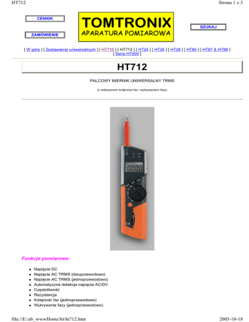 HT712 Strona 1 z 3 CENNIK SZUKAJ ZAMÓWIENIE [ W górę ] [ Zestawienie uniwersalnych ] [ HT710 ] [ HT712 ] [ HT24 ] [ HT26 ] [ HT28 ] [ HT85 ] [ HT87 & HT88 ] [ Seria HT500 ] HT712 PALCOWY MIERNIK UNIWERSALNY TRMS (z wskazaniem kolejności faz i wykrywaniem fazy) Funkcje pomiarowe: ! ! ! ! ! ! ! ! Napięcie DC Napięcie AC TRMS (dwuprzewodowo) Napięcie AC TRMS (jednoprzewodowo) Automatyczna detekcja napięcia AC/DV Częstotliwość Rezystancja Kolejność faz (jednoprzewodowo) Wykrywanie fazy (jednoprzewodowo) file://E:\zb_wwwHome\ht\ht712.htm 2005-10-18 HT712 Strona 2 z 3 ! ! ! Ciągłość z brzęczykiem Funkcja HOLD Automatyczny wyłącznik Opis HT712 jest profesjonalnym i nowoczesnym przyrządem pomiarowym przeznaczonym dla instalatorów, do pracy w terenie, gdzie operator wymaga dużej dokładności, łatwości obsługi oraz niewielkich wymiarów. Przyrząd HT712 wykonuje pomiary z automatyczną zmianą zakresów. Pomiar napięcia AC może być wykonywany opatentowaną metodą 1-przewodową, co pozwala na wygodne pomiary wykonywane jedna ręką. HT712 wykonuje również 1przewodowy pomiar kolejności faz oraz wykrywanie obecności fazy. Pomiar wykonuje się poprzez proste dotknięcie zaizolowanej części przewodu krótką czerwoną końcówką umieszczoną w górnej części obudowy. Dane techniczne Dokładność podano przy 23°C ±5° ±(wartość odczytana + ilość cyfr), <80%RH ! ! ! ! ! ! ! ! ! Napięcie DC " Zakres: 0,1÷599,9V " Rozdzielczość: 0,1V " Dokładność: ±(1,0% odczytu + 2cyfry) " Impedancja wejściowa: 1MΩ " Wytrzymałość: 600VACrms Napięcie AC " Zakres: 2÷599,9V " Rozdzielczość: 0,1V " Dokładność: ±(1,0% odczytu + 2cyfry) " Impedancja wejściowa: 1MΩ " Wytrzymałość: 600VACrms " Maksymalny współczynnik szczytu = 1,5 Napięcie AC (jednoprzewodowo) " Zakres: 50÷600V (*) " Rozdzielczość: 10V " Dokładność: ±(15% odczytu + 10V) " Impedancja wejściowa: 1MΩ " Wytrzymałość: 600VACrms " Maksymalny współczynnik szczytu = 1.5 " (*) Pomiar wykonywany w następujących standardowych warunkach: przyrząd trzymany mocno, standardowe obuwie, standardowa podłoga, etc. Częstotliwość " Zakres: 40,0 ÷ 69,9Hz " Rozdzielczość: 0,1Hz " Dokładność: ±(0,5% odczytu + cyfra) " Napięcie wejściowe: 2 ÷ 600V " Wytrzymałość: 660VACrms Wskazanie kolejności faz (jednoprzewodowo) " Zakres: 100 ÷ 600V (*) " Impedancja wejściowa: 1MΩ " Wytrzymałość: 600VACrms " (*) Pomiar wykonywany w następujących standardowych warunkach: przyrząd trzymany mocno, standardowe obuwie, standardowa podłoga, etc. Wyświetlacz: " LCD, 3 3/4 cyfry, licznik 1999, jednostki " Automatyczne wskazywanie polaryzacji " "OL" wskaźnik przepełnienia Funkcje " HOLD " Automatyczny wyłącznik zasilania Sygnalizacja rozładowania baterii Temperatura/Wilgotność pracy " 5°C do 40°C; <80%RH file://E:\zb_wwwHome\ht\ht712.htm 2005-10-18 HT712 Strona 3 z 3 ! ! ! ! ! ! ! Temperatura/Wilgotność magazynowania " -10°C do 60°C; <70%RH Informacje ogólne " Klasa izolacji: 2 (podwójna izolacja) " Maksymalna wysokość: 2000m " Stopień zapylenia: 2 Zasilanie " 2 x 1,5V baterie alkaliczna R03-AAA-UM4 " Czas pracy baterii: ok. 200 godzin Wymiary " 200 x 51 x 30 mm Waga " około 240g (razem z wewnętrznymi bateriami) Spełniane normy " LVD: EN61010-1 CAT IV 600V (do ziemi), 73/23/CEE " EMC: EN60326 (1997) + A1(1997), 89/336/CEE + zmiany 93/68/CEE Znak CE Informacja dla zamawiających Akcesoria na wyposażeniu Czerwona, krótka, końcówka pomiarowa Czarny przewód pomiarowy z końcówką Futerał transportowy Certyfikat z kalibracji Baterie Instrukcja obsługi Copyright (c) 2001, This Page was created by Tomtronix on October the 17th, 2005. [ Dom ] [ PROMOCJE ] [ MEGGER ] [ HT-ITALIA ] [ RYCOM ] [ PHENIX ] [ ACKSEN ] [ INNE ] [ PRASA ] [ DOWNLOAD ] Tomtronix, 92-318 Łódź, Al. Piłsudskiego 135, tel:(42) 676-06-33, fax:(42) 674-74-55, [email protected] file://E:\zb_wwwHome\ht\ht712.htm 2005-10-18