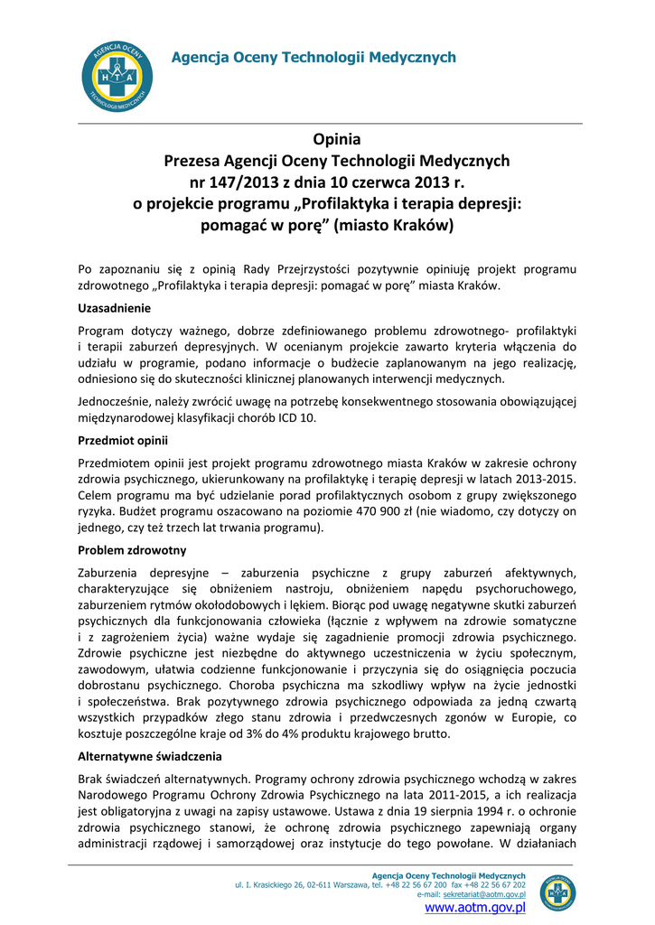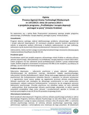 Agencja Oceny Technologii Medycznych Opinia Prezesa Agencji Oceny Technologii Medycznych nr 147/2013 z dnia 10 czerwca 2013 r. o projekcie programu „Profilaktyka i terapia depresji: pomagać w porę” (miasto Kraków) Po zapoznaniu się z opinią Rady Przejrzystości pozytywnie opiniuję projekt programu zdrowotnego „Profilaktyka i terapia depresji: pomagać w porę” miasta Kraków. Uzasadnienie Program dotyczy ważnego, dobrze zdefiniowanego problemu zdrowotnego- profilaktyki i terapii zaburzeń depresyjnych. W ocenianym projekcie zawarto kryteria włączenia do udziału w programie, podano informacje o budżecie zaplanowanym na jego realizację, odniesiono się do skuteczności klinicznej planowanych interwencji medycznych. Jednocześnie, należy zwrócić uwagę na potrzebę konsekwentnego stosowania obowiązującej międzynarodowej klasyfikacji chorób ICD 10. Przedmiot opinii Przedmiotem opinii jest projekt programu zdrowotnego miasta Kraków w zakresie ochrony zdrowia psychicznego, ukierunkowany na profilaktykę i terapię depresji w latach 2013-2015. Celem programu ma być udzielanie porad profilaktycznych osobom z grupy zwiększonego ryzyka. Budżet programu oszacowano na poziomie 470 900 zł (nie wiadomo, czy dotyczy on jednego, czy też trzech lat trwania programu). Problem zdrowotny Zaburzenia depresyjne – zaburzenia psychiczne z grupy zaburzeń afektywnych, charakteryzujące się obniżeniem nastroju, obniżeniem napędu psychoruchowego, zaburzeniem rytmów okołodobowych i lękiem. Biorąc pod uwagę negatywne skutki zaburzeń psychicznych dla funkcjonowania człowieka (łącznie z wpływem na zdrowie somatyczne i z zagrożeniem życia) ważne wydaje się zagadnienie promocji zdrowia psychicznego. Zdrowie psychiczne jest niezbędne do aktywnego uczestniczenia w życiu społecznym, zawodowym, ułatwia codzienne funkcjonowanie i przyczynia się do osiągnięcia poczucia dobrostanu psychicznego. Choroba psychiczna ma szkodliwy wpływ na życie jednostki i społeczeństwa. Brak pozytywnego zdrowia psychicznego odpowiada za jedną czwartą wszystkich przypadków złego stanu zdrowia i przedwczesnych zgonów w Europie, co kosztuje poszczególne kraje od 3% do 4% produktu krajowego brutto. Alternatywne świadczenia Brak świadczeń alternatywnych. Programy ochrony zdrowia psychicznego wchodzą w zakres Narodowego Programu Ochrony Zdrowia Psychicznego na lata 2011-2015, a ich realizacja jest obligatoryjna z uwagi na zapisy ustawowe. Ustawa z dnia 19 sierpnia 1994 r. o ochronie zdrowia psychicznego stanowi, że ochronę zdrowia psychicznego zapewniają organy administracji rządowej i samorządowej oraz instytucje do tego powołane. W działaniach Agencja Oceny Technologii Medycznych ul. I. Krasickiego 26, 02-611 Warszawa, tel. +48 22 56 67 200 fax +48 22 56 67 202 e-mail: [email protected] www.aotm.gov.pl Opinia Prezesa AOTM nr 147/2013 z dnia 10 czerwca 2013 r. z zakresu ochrony zdrowia psychicznego mogą uczestniczyć stowarzyszenia i inne organizacje społeczne, fundacje, samorządy zawodowe oraz grupy samopomocy pacjentów i ich rodzin, a także inne osoby fizyczne i prawne. A wydane na podstawie ww. ustawy Rozporządzenie Rady Ministrów z dnia 28 grudnia 2010 r. w sprawie Narodowego Programu Ochrony Zdrowia Psychicznego określiło strategię działań mających na celu ograniczenie występowania zagrożeń dla zdrowia psychicznego, poprawę jakości życia osób z zaburzeniami psychicznymi i ich bliskich oraz zapewnienie dostępności do świadczeń opieki zdrowotnej. Wnioski z oceny przeprowadzonej przez Agencję Promocja/strategia zdrowia psychicznego Wg zaleceń Radboud University Nijmegen każdy kraj powinien opracować i zrealizować wszechstronny plan działania w zakresie promocji zdrowia psychicznego i zapobiegania zaburzeniom psychicznym. Plan taki byłby głównym mechanizmem promowania zdrowia psychicznego, redukowania olbrzymich kosztów zdrowotnych i ekonomicznych związanych z zaburzeniami psychicznymi, oraz wzmacniania więzi społecznych. Tam, gdzie nie przewidziano wystarczających funduszy na wdrożenie tego planu działania, można je zidentyfikować poprzez specjalny Fundusz Zdrowia Psychicznego finansowany z podatków za tytoń i alkohol. W planach działania należy zwrócić uwagę na dziesięć obszarów (wspieranie rodzicielstwa i pierwszych lat życia, promowanie zdrowia psychicznego w szkołach, promocja zdrowia psychicznego w miejscu pracy, wspieranie zdrowego psychicznie starzenia się, zajmowanie się grupami zagrożonymi zaburzeniami psychicznymi, zapobieganie depresji i samobójstwom, zapobieganie przemocy i szkodliwemu używaniu substancji psychoaktywnych, zaangażowanie podstawowej i specjalistycznej opieki zdrowotnej, zmniejszenie upośledzenia społecznego i zapobieganie stygmatyzacji, nawiązanie współpracy z innymi sektorami) i pięć wspólnych zasad (pogłębianie wiedzy o zdrowiu psychicznym, wspieranie efektywnego wdrażania, rozwijanie kompetencji i szkolenie pracowników, włączanie do działania różnych podmiotów, ewaluacja wpływu polityki i programu). Zielona Księga przyjęta przez Unię Europejską w 2005 r. proponuje ustanowienie wspólnotowej strategii zdrowia psychicznego, która ma wnieść pozytywny wkład poprzez: stworzenie ram dla wymiany i współpracy pomiędzy Państwami Członkowskimi; pomoc w zwiększeniu spójności działań w sektorach związanych z polityką zdrowotną i innymi politykami w Państwach Członkowskich oraz na poziomie Wspólnoty oraz umożliwienie szerszym kręgom zainteresowanych stron zaangażowania się w opracowywanie rozwiązań. Dodatkowo w trakcie konferencji Unii Europejskiej w czerwcu 2008 r. „Europejski Pakt na rzecz zdrowia i dobrego samopoczucia psychicznego” podkreślono, że do przezwyciężenia problemów zdrowia psychicznego (najistotniejsze to depresje i samobójstwa) w Krajach Członkowskich mogą przyczynić się dodatkowe działania i wspólne akcje na pozio