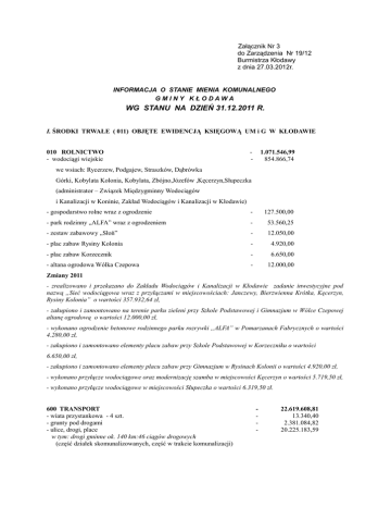Załącznik Nr 3 do Zarządzenia Nr 19/12 Burmistrza Kłodawy z dnia 27.03.2012r. INFORMACJA O STANIE MIENIA KOMUNALNEGO GMINY KŁODAWA WG STANU NA DZIEŃ 31.12.2011 R. I. ŚRODKI TRWAŁE ( 011) OBJĘTE EWIDENCJĄ KSIĘGOWĄ UM i G W KŁODAWIE 010 ROLNICTWO - wodociągi wiejskie - 1.071.546,99 854.866,74 we wsiach: Rycerzew, Podgajew, Straszków, Dąbrówka Górki, Kobylata Kolonia, Kobylata, Zbójno,Józefów ,Kęcerzyn,Słupeczka (administrator – Związek Międzygminny Wodociągów i Kanalizacji w Koninie, Zakład Wodociągów i Kanalizacji w Kłodawie) - gospodarstwo rolne wraz z ogrodzenie - 127.500,00 - park rodzinny „ALFA” wraz z ogrodzeniem - 53.560,25 - zestaw zabawowy „Słoń” - 12.050,00 - plac zabaw Rysiny Kolonia - 4.920,00 - plac zabaw Korzecznik - 6.650,00 - altana ogrodowa Wólka Czepowa - 12.000,00 Zmiany 2011 - zrealizowano i przekazano do Zakładu Wodociągów i Kanalizacji w Kłodawie zadanie inwestycyjne pod nazwą „Sieć wodociągowa wraz z przyłączami w miejscowościach: Janczewy, Bierzwienna Krótka, Kęcerzyn, Rysiny Kolonia” o wartości 357.932,64 zł, - zakupiono i zamontowano na terenie parku zieleni przy Szkole Podstawowej i Gimnazjum w Wólce Czepowej altanę ogrodową o wartości 12.000,00 zł, - wykonano ogrodzenie betonowe rodzinnego parku rozrywki „ALFA” w Pomarzanach Fabrycznych o wartości 4.280,00 zł, - zakupiono i zamontowano elementy placu zabaw przy Szkole Podstawowej w Korzeczniku o wartości 6.650,00 zł, - zakupiono i zamontowano elementy placu zabaw przy Gimnazjum w Rysinach Kolonii o wartości 4.920,00 zł, - wykonano przyłącze wodociągowe oraz modernizację szamba w miejscowości Kęcerzyn o wartości 5.719,50 zł, - wykonano przyłącze wodociągowe w miejscowości Słupeczka o wartości 6.319,50 zł. 600 TRANSPORT - wiata przystankowa - 4 szt. - grunty pod drogami - ulice, drogi, place w tym: drogi gminne ok. 140 km:46 ciągów drogowych (część działek skomunalizowanych, część w trakcie komunalizacji) - 22.619.608,81 13.340,40 2.381.084,82 20.225.183,59 Zmiany 2011 - na podstawie decyzji Wojewody Wielkopolskiego dokonano komunalizacji działek pod drogami i ulicami na łączną wartość 3.802,00 zł. 700 GOSPODARKA MIESZKANIOWA 900 GOSPODARKA KOMUNALNA - 5.881.085,85 - grunty komunalne w skład których wchodzą : - 3. 638.574,43 grunty rolne lasy i tereny zielone, ogródki działkowe, działki budowlane (budynki jednorodzy.) działki przem - hand. - 21,76 ha - wydzierżawione osobom fizycznym 10,17 ha 14,45 ha w zarządzie 15,73 ha w tym użytkowanie wieczyste 11,1 ha 4,65 ha w dzierżawie - chłodnia do przechowywania zwłok - kontenery - 6 szt. - ciągnik rolniczy POL-MOT - kanał deszczowy - kanał deszczowy ul. Aleja 1000-lecia - kanał deszczowy w ulicach : Barbary, Zawodnia, Zielona, Jasna, Niezłomnych, św. Ducha, Wyżynna, Lipowa, Gruntowa, Polna - zalicznikowa instalacja oświetlenia drogowego ul. Przedecka - tablice informacyjne szt. 4 - 35.000,00 16.065,00 137.860,00 267.360,00 221.286,02 - 1.459.779,98 95.160,52 9.999,90 Zmiany 2011 1/ dokonano sprzedaży nieruchomości za łączną kwotę 134.944,26 zł, 2/w wyniku komunalizacji, decyzji podziałowych oraz wykupu działek na stan środków trwałych przyjęto grunty o łącznej wartości 37.943,75 zł, 3/zakup działki o numerze geodezyjnym 858, pow. 0,0482 ha za kwotę 1.928,00 zł, 4/przyjęto na stan środków trwałych budowę zalicznikowej instalacji oświetlenia drogowego w miejscowości Kłodawa ul. Przedecka o wartości 95.160,52 zł 5/zakupiono i przyjęto na stan środków trwałych tablice informacyjne związane z promocją pozyskania środków finansowych z WRPO szt.4 o łącznej wartości 9.999,90 zł, Przewidywane dochody w dziale 700 w 2012 r. wynoszą 568.500,00 zł Dochody uzyskane za rok 2011 w dziale 700 wynoszą 485.471,35 zł 754 BEZPIECZEŃSTWO PUBLICZNE I OCHRONA PRZECIWPOŻAROWA 45.911,70 - sprzęt ratownictwa drogowego - aparat powietrzny BD96 AS szt. 2 - wrota garażowe - przemysłowa brama garażowa 14.530,20 7.918,00 15.563,51 7.899,99 - Zmiany 2011 - zakupiono i wykonano montaż przemysłowej bramy garażowej w budynku garażowym jednostki OSP Kłodawa o wartości 7.899,99 zł 801 OŚWIATA I WYCHOWANIE - - środki transportu ( 1 autobus dowożący dzieci do szkół) oraz mienie Gminy przekazane w użyczenie na okres 20 lat dla Stowarzyszenia „Z edukacją w Przyszłość” w Korzeczniku, 50 lat dla Stowarzyszenia „Przyjaciół Szkół Katolickich” prowadzącym szkoły podstawowe na terenie Gminy Kłodawa 1.154.668,33 289.140,08 - ogólna wartość budynków i innych środków trwałych - budynek szkoły w Dębinie - budynek kotłowni w Dębinie - biologiczna oczyszczalnia ścieków w Dębinie - piec C.O. w Dębinie Zmiany 2011 - 575.560,93 221.817,87 50.289,00 10.181,14 7.679,31 - sprzedaż autobusu szkolnego za kwotę 10.000,00 zł, - przyjęto na stan środków trwałych mienie po zlikwidowanej szkole podstawowej w Dębinie o łącznej wartości 289.967,32 zł 921 KULTURA I SZTUKA - budynki świetlic wiejskich - Świetlica w Bierzwiennie - Świetlica w Kęcerzynie - Świetlica w Słupeczce - zestaw zabawowy „MICHAŁ” - nakłady na modernizację świetlicy wiejskiej w Górkach - projektory kinowe AP 625 szt. 2 - - 187.294,60 124.571,44 3.000,00 2.633,00 7.200,00 29.890,16 20.000,00 Zmiany 2011 1/poniesiono nakłady na modernizację świetlicy wiejskiej w Górkach o wartości 29.890,16 zł, 2/zakup używanych projektorów kinowych AP 625 szt. 2o wartości 20.000,00 zł, 851 OCHRONA ZDROWIA - sprzęt medyczny - 48.064,49 - 48.064,49 Planowane dochody z tytułu dzierżawy sprzętu medycznego na rok 2012 r. wynoszą 10.000,00 zł. Dochody uzyskane z tytułu dzierżawy sprzętu medycznego za rok 2011 wynoszą 4.604,92 zł. 852 POMOC SPOŁECZNA - 27.255,84 - budynek garażowy - 27.255,84 926 KULTURA FIZYCZNA I SPORT - 2.381.804,21 - budynek klubowy - 250.997,33 - stadion sportowy wraz z ogrodzeniem - 112.413,91 
