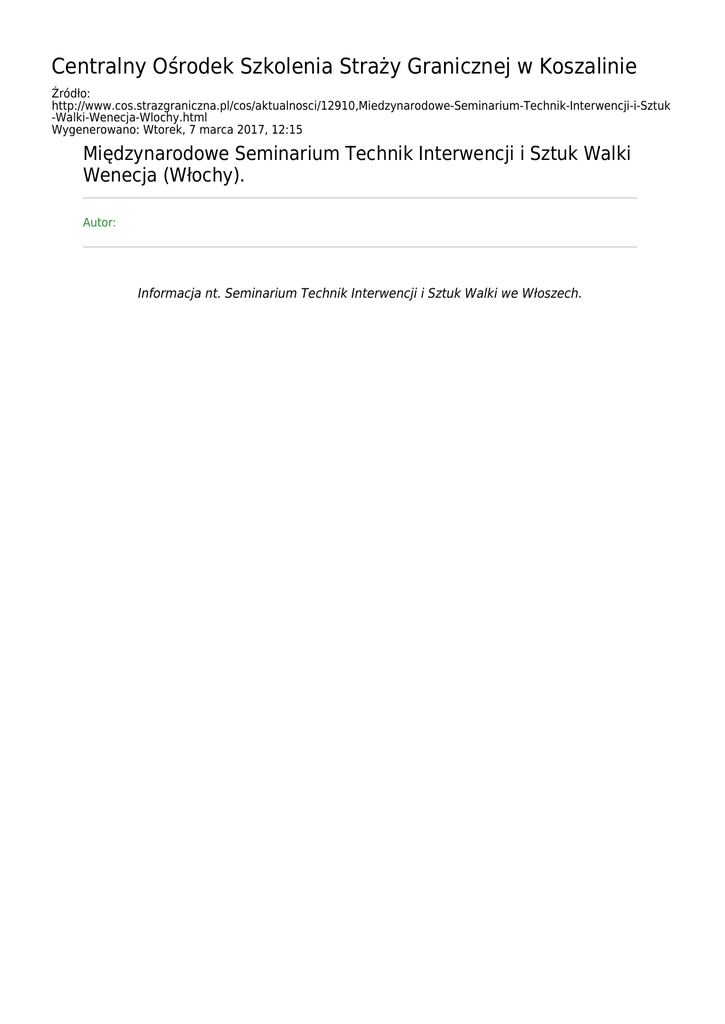 Centralny Ośrodek Szkolenia Straży Granicznej w Koszalinie Źródło: http://www.cos.strazgraniczna.pl/cos/aktualnosci/12910,Miedzynarodowe-Seminarium-Technik-Interwencji-i-Sztuk -Walki-Wenecja-Wlochy.html Wygenerowano: Wtorek, 7 marca 2017, 12:15 Międzynarodowe Seminarium Technik Interwencji i Sztuk Walki Wenecja (Włochy). Autor: Informacja nt. Seminarium Technik Interwencji i Sztuk Walki we Włoszech. W dniach od 27 do 28 października 2012 r. w Wenecji zorganizowano Międzynarodowe Seminarium Technik Interwencji i Sztuk Walki, na które zaproszono 52 mistrzów, reprezentujących różne style i systemy walki. W tym przedsięwzięciu polską Straż Graniczną reprezentował chor. SG Radosław Wiśniewski – starszy kontroler Zakładu Wychowania Fizycznego i Działań Specjalnych COSSG w Koszalinie. W Seminarium brali udział przedstawiciele formacji mundurowych i sektora prywatnego z USA, Wielkiej Brytanii, Niemiec, Węgier, Francji, Portugalii, Włoch, Hiszpanii, Meksyku oraz Polski. Gośćmi honorowymi byli wybitni mistrzowie sztuk walki: prof. James Mura, prof. Hans Ingebresten oraz prof. James Nichols. Udział w Seminarium stworzył okazję do wymiany doświadczeń z zakresu interwencji w formacjach mundurowych, nowych metod i trendów w tej dziedzinie. Chor. SG Radosław Wiśniewski zaprezentował techniki interwencyjne z zakresu szkoleń w COSSG oraz elementy opracowanego przez siebie, autorskiego systemu walki Defence Attack System – D.A.S, który uczestnicy seminarium wysoko ocenili demonstrowany system walki, podkreślająć jego uniwersalność, prostotę oraz efektywność. W szkoleniu wzięło udział ponad 600 adeptów sztuk walki. 2012/11/rozne_wenecja_1wen.JPG