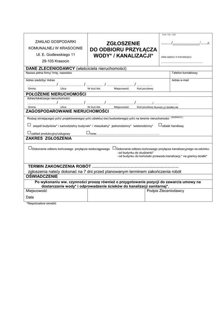 zgłoszenie do odbioru przyłącza wody* / kanalizacji