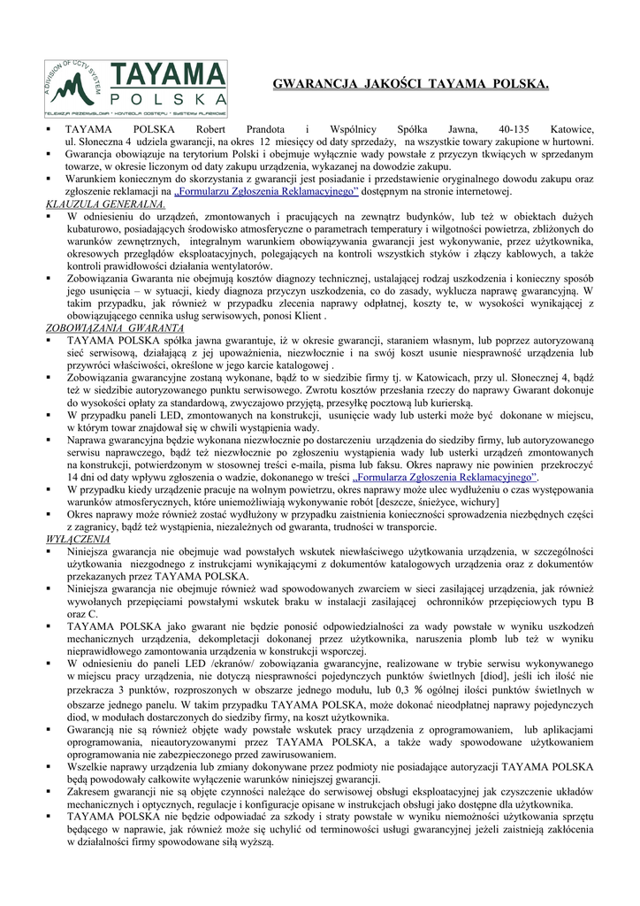GWARANCJA JAKOŚCI TAYAMA POLSKA. TAYAMA POLSKA Robert Prandota i Wspólnicy Spółka Jawna, 40-135 Katowice, ul. Słoneczna 4 udziela gwarancji, na okres 12 miesięcy od daty sprzedaży, na wszystkie towary zakupione w hurtowni. Gwarancja obowiązuje na terytorium Polski i obejmuje wyłącznie wady powstałe z przyczyn tkwiących w sprzedanym towarze, w okresie liczonym od daty zakupu urządzenia, wykazanej na dowodzie zakupu. Warunkiem koniecznym do skorzystania z gwarancji jest posiadanie i przedstawienie oryginalnego dowodu zakupu oraz zgłoszenie reklamacji na „Formularzu Zgłoszenia Reklamacyjnego” dostępnym na stronie internetowej. KLAUZULA GENERALNA. W odniesieniu do urządzeń, zmontowanych i pracujących na zewnątrz budynków, lub też w obiektach dużych kubaturowo, posiadających środowisko atmosferyczne o parametrach temperatury i wilgotności powietrza, zbliżonych do warunków zewnętrznych, integralnym warunkiem obowiązywania gwarancji jest wykonywanie, przez użytkownika, okresowych przeglądów eksploatacyjnych, polegających na kontroli wszystkich styków i złączy kablowych, a także kontroli prawidłowości działania wentylatorów. Zobowiązania Gwaranta nie obejmują kosztów diagnozy technicznej, ustalającej rodzaj uszkodzenia i konieczny sposób jego usunięcia – w sytuacji, kiedy diagnoza przyczyn uszkodzenia, co do zasady, wyklucza naprawę gwarancyjną. W takim przypadku, jak również w przypadku zlecenia naprawy odpłatnej, koszty te, w wysokości wynikającej z obowiązującego cennika usług serwisowych, ponosi Klient . ZOBOWIĄZANIA GWARANTA TAYAMA POLSKA spółka jawna gwarantuje, iż w okresie gwarancji, staraniem własnym, lub poprzez autoryzowaną sieć serwisową, działającą z jej upoważnienia, niezwłocznie i na swój koszt usunie niesprawność urządzenia lub przywróci właściwości, określone w jego karcie katalogowej . Zobowiązania gwarancyjne zostaną wykonane, bądź to w siedzibie firmy tj. w Katowicach, przy ul. Słonecznej 4, bądź też w siedzibie autoryzowanego punktu serwisowego. Zwrotu kosztów przesłania rzeczy do naprawy Gwarant dokonuje do wysokości opłaty za standardową, zwyczajowo przyjętą, przesyłkę pocztową lub kurierską. W przypadku paneli LED, zmontowanych na konstrukcji, usunięcie wady lub usterki może być dokonane w miejscu, w którym towar znajdował się w chwili wystąpienia wady. Naprawa gwarancyjna będzie wykonana niezwłocznie po dostarczeniu urządzenia do siedziby firmy, lub autoryzowanego serwisu naprawczego, bądź też niezwłocznie po zgłoszeniu wystąpienia wady lub usterki urządzeń zmontowanych na konstrukcji, potwierdzonym w stosownej treści e-maila, pisma lub faksu. Okres naprawy nie powinien przekroczyć 14 dni od daty wpływu zgłoszenia o wadzie, dokonanego w treści „Formularza Zgłoszenia Reklamacyjnego”. W przypadku kiedy urządzenie pracuje na wolnym powietrzu, okres naprawy może ulec wydłużeniu o czas występowania warunków atmosferycznych, które uniemożliwiają wykonywanie robót [deszcze, śnieżyce, wichury] Okres naprawy może również zostać wydłużony w przypadku zaistnienia konieczności sprowadzenia niezbędnych części z zagranicy, bądź też wystąpienia, niezależnych od gwaranta, trudności w transporcie. WYŁĄCZENIA Niniejsza gwarancja nie obejmuje wad powstałych wskutek niewłaściwego użytkowania urządzenia, w szczególności użytkowania niezgodnego z instrukcjami wynikającymi z dokumentów katalogowych urządzenia oraz z dokumentów przekazanych przez TAYAMA POLSKA. Niniejsza gwarancja nie obejmuje również wad spowodowanych zwarciem w sieci zasilającej urządzenia, jak również wywołanych przepięciami powstałymi wskutek braku w instalacji zasilającej ochronników przepięciowych typu B oraz C. TAYAMA POLSKA jako gwarant nie będzie ponosić odpowiedzialności za wady powstałe w wyniku uszkodzeń mechanicznych urządzenia, dekompletacji dokonanej przez użytkownika, naruszenia plomb lub też w wyniku nieprawidłowego zamontowania urządzenia w konstrukcji wsporczej. W odniesieniu do paneli LED /ekranów/ zobowiązania gwarancyjne, realizowane w trybie serwisu wykonywanego w miejscu pracy urządzenia, nie dotyczą niesprawności pojedynczych punktów świetlnych [diod], jeśli ich ilość nie przekracza 3 punktów, rozproszonych w obszarze jednego modułu, lub 0,3 % ogólnej ilości punktów świetlnych w obszarze jednego panelu. W takim przypadku TAYAMA POLSKA, może dokonać nieodpłatnej naprawy pojedynczych diod, w modułach dostarczonych do siedziby firmy, na koszt użytkownika. Gwarancją nie są również objęte wady powstałe wskutek pracy urządzenia z oprogramowaniem, lub aplikacjami oprogramowania, nieautoryzowanymi przez TAYAMA POLSKA, a także wady spowodowane użytkowaniem oprogramowania nie zabezpieczonego przed zawirusowaniem. Wszelkie naprawy urządzenia lub zmiany dokonywane przez podmioty nie posiadające autoryzacji TAYAMA POLSKA będą powodowały całkowite wyłączenie warunków niniejszej gwarancji. Zakresem gwarancji nie są objęte czynności należące do serwisowej obsługi eksploatacyjnej jak czyszczenie układów mechanicznych i optycznych, regulacje i konfiguracje opisane w instrukcjach obsługi jako dostępne dla użytkownika. TAYAMA POLSKA nie będzie odpowiadać za szkody i straty powstałe w wyniku niemożności użytkowania sprzętu będącego w naprawie, jak również może się uchylić od terminowości usługi gwarancyjnej jeżeli zaistnieją zakłócenia w działalności firmy spowodowane siłą wyższą. UPRAWNIENIA GWARANCYJNE Klient ma prawo żądać wymiany urządzenia na wolne od wad jeżeli w okresie gwarancyjnym autoryzowany przedstawiciel TAYAMA POLSKA dokonał trzech napraw istotnych, a urządzenie dalej wykazuje wady uniemożliwiające jego wykorzystywanie zgodnie z przeznaczeniem. w przypadku urządzeń składających się z powtarzalnych technicznie elementów [moduł