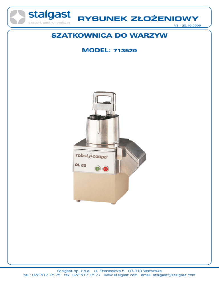 RYSUNEK ZŁOŻENIOWY V1 - 20.10.2009 SZATKOWNICA DO WARZYW MODEL: 713520 Stalgast sp. z o.o. ul. Staniewicka 5 03-310 Warszawa tel.: 022 517 15 75 fax: 022 517 15 77 www.stalgast.com email: [email protected] 1. Rysunek złożeniowy 27 02 03 01 04 28 05 29 06 07 08 30 09 31 10 12 33 32 34 30 35 36 44 45 12 Uwaga: dla urządzeń z 3 pierwszymi cyframi numeru seryjnego właściwe są: 11 13 14 15 16 17 194 43 317 14 46 37 38 41 40 39 17 42 18 19 20 47 21 48 22 49 23 50 24 51 25 52 26 -2- Nr 01 02 03 04 05 06 07 08 09 10 11 12 13 14 15 16 17 18 19 20 21 22 23 24 25 26 Nr kat. V713520-01 V713520-02 V713520-03 V713520-04 V713520-05 V713520-06 V713520-07 V713520-08 V713520-09 V713520-10 V713520-11 V713520-12 V713520-13 V713520-14 V713520-15 V713520-16 V713520-17 V713520-18 V713520-19 V713520-20 V713520-21 V713520-22 V713520-23 V713520-24 V713520-25 V713520-26 Opis Pokrywa - komplet Mocowanie pokrywy Prowadnica popychacza Ogranicznik popychacza Zatrzask pokrywy Czujnik magnetyczny Ścianka pokrywy demontowana Pokrywa górna Zatrzask pokrywy Odrzutnik - śmigło Wał transmisyjny - komplet Uszczelka (42x2 mm) Uszczelka i osłona wału Klin wału Wał transmisyjny Osłona łożyska Komplet łożysk Element mocowania silnika Płyta mocowania silnika Małe koło pasowe Klin wału Kondensator Silnik Obudowa silnika Płyta dolna obudowy silnika Nóżka Nr Nr kat. Opis 27 28 29 30 31 32 33 34 35 36 37 38 39 40 41 42 43 44 45 46 47 48 49 50 51 52 V713520-27 V713520-28 V713520-29 V713520-30 V713520-31 V713520-32 V713520-33 V713520-34 V713520-35 V713520-36 V713520-37 V713520-38 V713520-39 V713520-40 V713520-41 V713520-42 V713520-43 V713520-44 V713520-45 V713520-46 V713520-47 V713520-48 V713520-49 V713520-50 V713520-51 V713520-52 Popychacz Śruba mocująca Podkładka Łożysko ślizgowe Klucze do śruby mocującej Tarcza wyrzutowa Pręt blokujący Końcówka magnetyczna Pojemnik Pojemnik Przycisk zielony Przycisk czerwony Płyta czołowa Mocowanie płyty Ścianka mocowania płyty Płyta główna Wał transmisyjny - komplet Osłona wału Uszczelka wału Wał transmisyjny Pas transmisyjny Koło pasowe Przekaźnik Przewód zasilający Ogranicznik przewodu zasilającego Przewody elektryczne -3- 2. SCHEMAT ELEKTRYCZNY WAŻNE: Sprawdź, czy przewód, który umożliwia dostosowanie do napięcia zasilania jest we właściwym miejscu. niebieski czarny brązowy 200V - 200 (J14) 220 - 240V - 230 (J13) 380 - 415V - 400 (J12) 440V - 440 (J11) C - złącze ILS1 - wyłącznik bezpieczeństwa pokrywy ILS2 - wyłącznik bezpieczeństwa popychacza MO - silnik 3 fazowy SAR - wyłącznik SMA - włącznik - osłona termiczna silnika ZASILANIE WAŻNE: Sprawdź, czy przewód, który umożliwia dostosowanie do napięcia zasilania jest we właściwym miejscu. niebieski biały brązowy czarny czarny pomarańczowy C - złącze CD - kondensator ILS1 - wyłącznik bezpieczeństwa pokrywy ILS2 - wyłącznik bezpieczeństwa popychacza KD - przekaźnik startowy MO - silnik 3 fazowy SAR - wyłącznik SMA - włącznik - osłona termiczna silnika ZASILANIE -4-