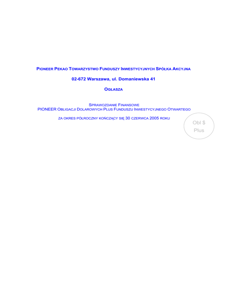 PIONEER PEKAO TOWARZYSTWO FUNDUSZY INWESTYCYJNYCH SPÓŁKA AKCYJNA 02-672 Warszawa, ul. Domaniewska 41 OGŁASZA SPRAWOZDANIE FINANSOWE PIONEER OBLIGACJI DOLAROWYCH PLUS FUNDUSZU INWESTYCYJNEGO OTWARTEGO ZA OKRES PÓŁROCZNY KOŃCZĄCY SIĘ 30 CZERWCA 2005 ROKU Obl $ Plus PIONEER OBLIGACJI DOLAROWYCH PLUS FUNDUSZ INWESTYCYJNY OTWARTY Sprawozdanie Finansowe za okres półroczny kończący się 30 czerwca 2005 roku Spis treści Wprowadzenie A. Fundusz Nazwa Funduszu i typ Funduszu Podstawy prawne działania, informacje rejestrowe Funduszu, data rozpoczęcia zbywania Jednostek Uczestnictwa Opis celu inwestycyjnego, specjalizacji Funduszu Opis stosowanych ograniczeń inwestycyjnych Funduszu Informacja o założeniu kontynuowania działalności B. Towarzystwo Funduszy Inwestycyjnych Firma Towarzystwa Funduszy Inwestycyjnych, siedziba i adres Dane rejestrowe Towarzystwa Funduszy Inwestycyjnych C. D. E. Okres sprawozdawczy i dzień bilansowy Biegły rewident funduszu Jednostki Uczestnictwa Zestawienie lokat Bilans Rachunek wyniku z operacji Zestawienie zmian w aktywach netto Noty objaśniające Nota - 1 Polityka rachunkowości funduszu Przepisy prawne regulujące rachunkowość Funduszu Zasady ujawniania i prezentacji informacji w sprawozdaniu finansowym Ujmowanie operacji dotyczących Funduszu w księgach rachunkowych Wycena aktywów i pasywów Funduszu Ustalanie Wartości Aktywów Netto i wyniku z operacji Wprowadzone w okresie sprawozdawczym zmiany stosowanych zasad rachunkowości, metod wyceny oraz sposobu sporządzania sprawozdania finansowego Zmiany w przepisach regulujących rachunkowość funduszu w roku 2005 Opis metodologii wyliczania wskaźnika WKC oraz wskaźnika SOP Nota - 2 Nota - 3 Nota - 4 Nota - 5 Nota - 6 Nota - 7 Nota - 8 Nota - 9 Nota - 10 Nota - 11 Nota - 12 Należności Funduszu Zobowiązania Funduszu Środki pieniężne i ich ekwiwalenty Ryzyka Instrumenty pochodne Transakcje przy zobowiązaniu się Funduszu lub drugiej strony do odkupu Kredyty i pożyczki Waluty i różnice kursowe Dochody i ich dystrybucja Koszty funduszu Dane porównawcze o Jednostkach Uczestnictwa Informacje dodatkowe A B C D E Informacje o znaczących zdarzeniach, dotyczących lat ubiegłych, ujętych w sprawozdaniu finansowym Informacje o znaczących zdarzeniach po dniu bilansowym Zestawienie oraz objaśnienie różnic związanych z prezentacją danych porównawczych Dokonane korekty błędów podstawowych Inne informacje Opodatkowanie Funduszu w pierwszym półroczu roku 2005 Podatek dochodowy od dochodu z tytułu odkupienia Jednostek Uczestnictwa Instytucje obsługujące Fundusz PIONEER OBLIGACJI DOLAROWYCH PLUS FUNDUSZ INWESTYCYJNY OTWARTY Sprawozdanie Finansowe za okres półroczny kończący się 30 czerwca 2005 roku Wprowadzenie A. Fundusz Nazwa Funduszu i typ Funduszu PIONEER Obligacji Dolarowych Plus Fundusz Inwestycyjny Otwarty Fundusz jest funduszem inwestycyjnym otwartym. Podstawy prawne działania, informacje rejestrowe Funduszu, data rozpoczęcia zbywania Jednostek Uczestnictwa Podstawy prawne działania Funduszu określa Ustawa z dnia 27 maja 2004 roku o funduszach inwestycyjnych (Dz. U. nr 146, poz. 1546). Statut PIONEER Obligacji Dolarowych Plus Funduszu Inwestycyjnego Otwartego zatwierdzony został decyzją Komisji Papierów Wartościowych i Giełd DFN1-4050/12-10/02-959 z dnia 26 marca 2002 roku o udzieleniu zezwolenia na utworzenie funduszu oraz zatwierdzeniu Statutu Funduszu i wyborze depozytariusza. Fundusz został wpisany do rejestru funduszy inwestycyjnych prowadzonego przez Sąd Okręgowy w Warszawie, VII Wydział Cywilny i Rejestrowy pod numerem RFJ 114 w dniu 11 kwietnia 2002 roku. Fundusz został utworzony w drodze zapisów polegających na dokonaniu wpłaty kwoty 4 milionów złotych przez PIONEER PEKAO Towarzystwo Funduszy Inwestycyjnych S.A. Cena nabycia Jednostki uczestnictwa w ramach zapisów wynosiła 40.00 zł. Data rozpoczęcia zbywania Jednostek Uczestnictwa: 2 maja 2002 roku. Zgodnie ze Statutem Fundusz został utworzony na czas nieograniczony. Opis celu inwestycyjnego, specjalizacji Funduszu Celem inwestycyjnym Funduszu jest wzrost wartości jego aktywów w wyniku wzrostu wartości lokat. Realizując cel inwestycyjny Fundusz może również, o ile nie jest to sprzeczne z założonym celem inwestycyjnym, podejmować działania mające na celu ochronę realnej wartości Aktywów Funduszu oraz osiąganie dochodu Funduszu z lokowania Aktywów Funduszu. Fundusz nie gwarantuje osiągnięcia celu inwestycyjnego. Aktywa Funduszu są lokowane głównie w dopuszczone do publicznego obrotu na rynku amerykańskim papiery wartościowe wierzycielskie oraz papiery wartościowe udziałowe uprzywilejowane w zakresie dywidendy, przy czym proporcja między lokatami Funduszu w poszczególne rodzaje papierów wartościowych będzie uzależniona od decyzji Funduszu podejmowanej z uwzględnieniem warunków ekonomicznych i sytuacji na rynku papierów wartościowych, jak również z uwzględnieniem limitów. Całkowita wartość lokat w dopuszczone do publicznego obrotu na rynku amerykańskim papiery wartościowe wierzycielskie oraz w papiery wartościowe udziałowe uprzywilejowane co do wypłaty dywidendy, będzie nie mniejsza niż 70 % wartości Aktywów Funduszu. Zarządzający dokonuje wyboru papierów wartościowych do portfela biorąc pod uwagę ryzyko inwestycyjne emitenta oceniane na podstawie ratingu uznanych międzynarodowych agencji ratingowych (np. Standard & Poor’s, Moody’s itp.). Fundusz koncentruje się na inwestowaniu w papiery wartościowe z ratingiem Standard & Poor’s na poziomie BB+ lub niższym (określanym także jako rating nie-inwestycyjny) lub z odpowiadającym mu ratingem innych uznanych agencji ratingowych. Zarządzający dąży do odzwierciedlenia polityki inwestycyjnej prowadzonej przez Pioneer High Yield Fund (fundusz inwestycyjny utworzony w 1998 roku w Bostonie i zarządzany przez Pioneer Global Asset Management) z uwzględnieniem przepisów Ustawy. -