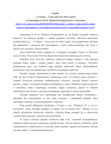 Projekt „ A Chance – Come and Let's Meet Again” w Gimnazjum nr 20 im. Młodych Europejczyków w Szczecinie http://www.mmszczecin.pl/483182/2014/6/8/projekt--a-chance--come-and-lets-meetagain-w-gimnazjum-nr--im-mlodych-europejczykow-w-szczecinie?category=news Gimnazjum nr 20 im. Młodych Europejczyków po raz kolejny otrzymało wsparcie finansowe na realizację projektu w ramach programu Comenius. Głównym założeniem przedsięwzięcia pt. „ A Chance – Come and Let's Meet Again” jest propagowanie tolerancji dla odmienności i akceptacji dla różnorodności, a także rozpowszechnianie idei życia w pokoju oraz przyjaźni z innymi ludźmi. Nasze partnerskie szkoły znajdują się w Hiszpanii, Portugalii, Turcji, we Włoszech oraz na Litwie. W styczniu 2014 roku dołączyła też placówka mieszcząca się w Grecji. Wspólnie, przez dwa lata, będziemy realizować kolejne zadania w celu lepszego poznania kultur, religii i tradycji państw, które biorą udział w projekcie. Wszystkie podejmowane przez nas działania mają sprzyjać budowaniu relacji międzyludzkich, zacieśnianiu więzi oraz promowaniu wrażliwości na problemy społeczne. Przemoc, agresja, nietolerancja na stałe wpisały się w pejzaż współczesnego świata. Stały się one trwałymi komponentami codziennego życia. Na każdym kroku słyszymy o wojnach, krwawych protestach, demonstracjach ulicznych, starciach kibiców podczas meczów, a także o rywalizacji pomiędzy nastolatkami w szkole. Młodzież wychowywana jest w atmosferze braku wzajemnego szacunku, ciągłej rywalizacji, pogoni za dobrami materialnymi, jak również w poczuciu nieustannego zagrożenia ze strony innych ludzi. Ważnym aspektem życia społecznego jest kształtowanie postaw zrozumienia i akceptacji dla różnorodności, co jest ściśle związane z założeniami projektu, który realizujemy wspólnie z naszymi partnerami z zagranicy. Ezop, grecki bajkopisarz pochodzący z Frygii w Azji Mniejszej (VI w. p.n.e.), powiedział: „Czym skorupka nasiąknie za młodu, tym na starość trąci”. Dlatego też my, dorośli, powinniśmy wskazywać młodzieży właściwą drogę, pomagać jej w odkrywaniu wartości, które stanowią o naszym człowieczeństwie. W trakcie realizacji projektu uczniowie będą m.in. wymieniali korespondencję, wspólnie wykonywali prace plastyczne, gazetki ścienne, tworzyli albumy, kalendarze, kartki okolicznościowe, sadzili drzewa, wystawiali sztuki teatralne, organizowali koncerty. Wezmą oni także udział w rozgrywkach sportowych. Do innych zadań związanych z uczestnictwem w programie Comenius należy dokumentowanie podjętych działań i publikowanie przygotowanych materiałów na stronie internetowej. Kolejnym celem projektu jest pogłębianie wiedzy w zakresie posługiwania się nowoczesnymi technologiami informacyjno – komunikacyjnymi. Znajomość narzędzi TIK pozwala na szybką wymianę wiadomości oraz dzielenie się z innymi swoją wiedzą i doświadczeniami. Sprzyja również poszukiwaniu, selekcjonowaniu, gromadzeniu, a także przetwarzaniu informacji. Ważnym elementem naszego projektu jest też doskonalenie umiejętności komunikowania się z pozostałymi jego uczestnikami w języku angielskim. Bezpośrednie kontakty podczas wizyt roboczych w państwach, w których mieszczą się partnerskie szkoły, motywują uczniów do podjęcia pracy samokształceniowej opartej między innymi na bogaceniu zasobu słownictwa, co korzystnie wpływa na rozwijanie ich kompetencji językowych. W ramach projektu zaplanowaliśmy również wizyty zagraniczne u naszych partnerów. Pierwsza z nich odbyła się na przełomie listopada i grudnia 2013 roku. Udaliśmy się wówczas do Turcji. Dzięki wyjazdowi poznaliśmy uczniów i nauczycieli ze szkoły w Ellibaş Köyü (prowincja Bartin). Zostaliśmy przez nich ciepło przyjęci. Bardzo dobrze czuliśmy się w ich towarzystwie. Wspólne zajęcia, rozmowy, a także zabawy uświadomiły nam, że mimo różnic językowych oraz kulturowych jesteśmy takimi samymi ludźmi, borykamy się z podobnymi problemami, dzielimy się z innymi swoją radością, troszczymy się o bliskich, zabiegamy o osobiste szczęście. W marcu 2014 roku złożyliśmy wizytę Hiszpanom. Podczas jednego ze spotkań uczestniczyliśmy w koncercie pieśni ludowych. Kolejną wyprawę odbyliśmy do Włoch. Przebywaliśmy tam od 5 do 9 maja 2014 roku. W trakcie pobytu w tym pięknym kraju podziwialiśmy okoliczne miejscowości. Mieliśmy także okazję obejrzeć przedstawienie teatralne pt. „World in our Dreams”. Wyrażamy głębokie przekonanie, że dalsza współpraca z młodzieżą oraz nauczycielami z zaprzyjaźnionych szkół będzie układała się pomyślnie i przyniesie nam wszystkim wiele korzyści. Udział w programie Comenius jest doskonałym sposobem na pogłębianie wiedzy na temat innych państw, ich kultury, tradycji oraz religii, ale także na promocję naszej szkoły, miasta, regionu i kraju w różnych zakątkach świata. Podczas wielu różnych spotkań uczniowie zaangażowani w realizację projektu mają możliwość uczestniczenia w wymianie doświadczeń ze swoimi rówieśnikami, a poza tym uczą się oni kreatywności i przedsiębiorczości. We wrześniu 2014 roku w Gimnazjum nr 20 będziemy gościć naszych partnerów z zagranicy. Do Szczecina przybędzie delegacja złożona z uczniów oraz ich opiekunów. Z niecierpliwością oczekujemy tej niecodziennej wizyty. Mamy nadzieję, że pobyt w Polsce dostarczy zaproszonym osobom wielu niezapomnianych wrażeń. Katarzyna Nowicka Lidia Wójcicka - Górka