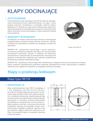 ODDYMIANIE I ZABEZPIECZENIA PPOŻ. KLAPY ODCINAJĄCE ZASTOSOWANIE Przeciwpożarowe klapy odcinające typu RK150 służą do zabezpieczania pomieszczeń przed rozprzestrzenianiem się ognia i dymu poprzez przewody wentylacyjne w przypadku wybuchu pożaru. Nadrzędną ich funkcją jest zapewnienie deklarowanej odporności ogniowej przegrody w przypadku pożaru poprzez automatyczne lub zdalne zamknięcie otworu powstałego w miejscu przejścia instalacji przez przegrodę. WARIANTY WYKONANIA W zależności od rodzaju zastosowanego elementu utrzymującego przegrodę klapy w pozycji otwartej, sposobu otwierania i zamykania klapy oraz wyposażenia, rozróżnia się następujące warianty ich wykonania: Klapa typu RK150 WARIANT HO - podstawowy wariant klapy z ręcznie otwieraną i samoczynnie zamykaną przegrodą odcinającą oraz mechanicznym wyzwalaczem termicznym opartym na szklanym lub lutowanym termoelemencie. Rozlutowanie się termoelementu lutowanego lub pęknięcie termoelementu szklanego pod wpływem przekroczenia temperatury powoduje zamknięcie się klapy. WARIANT HE - podstawowy wariant klapy (HO) rozbudowany o wyłącznik krańcowy zainstalowany na klapie dający możliwość sygnalizowania zamknięcia przegrody odcinającej lub innego wykorzystania w układach sterowania (np. wyłączenie wentylatora w przypadku zamknięcia się klapy). Klapy o przekroju kołowym Klapy typu RK150 KONSTRUKCJA Klapy przeciwpożarowe typu RK150 występują w i 4-ch wielkościach (Dn=100; Dn=125; Dn=160 i Dn=200 mm). Długość klapy zawsze wynosi 150 mm. Korpus klapy posiada mufowe lub nyplowe połączenie z instalacją wentylacyjną. Napęd przegrody klap umieszczony jest wewnątrz korpusu. Klapy mogą być wyposażone w wyzwalacz termiczny dostosowany do zadziałania w temperaturach 72±5°C lub 90±5°C. Klapa osadzona może być w pionowej lub poziomej przegrodzie ogniowej. W przypadku innego usytuowania klapy względem przegrody ogniowej, musi być spełniona ciągłość odporności ogniowej na odcinku od przegrody klapy do przegrody ogniowej (ściany lub stropu). 2 ODDYMIANIE I ZABEZPIECZENIA PPOŻ 1 W wykonaniu standardowym klapy przeciwpożarowe typu RK150 o przekroju kołowym składają się z jednoczęściowego korpusu perforowanego wykonanego z blachy ocynkowanej, przegrody odcinającej wykonanej z ognioodpornej płyty Promatect zawieszonej na czopach, uszczelki wentylacyjnej i pęczniejącej, wyzwalacza termicznego, sprężyny zamykającej oraz elementów dodatkowych takich jak zaczepy i ogranicznik przegrody odcinającej dla położenia zamkniętego. Na indywidualne zamówienie możliwe jest wykonanie klapy V370 w wykonaniu specjalnym: - klapy do pracy w środowisku atmosferycznym lub narażone na bezpośrednie oddziaływanie wody lub mrozu POWIERZCHNIAEFEKTYWNAORAZWARTOŚĆWSPÓŁCZYNNIKAf1 KLAPY PRZECIWPOŻAROWE TYPU RK150 Dn 100 125 160 200 Aef [m ] 0,00457 0,00813 0,01475 0,02457 f1 [%] 31,8 25,5 19,9 15,9 2 MONTAŻ KLAP Montaż klap powinien odpowiadać jednemu z przedstawionych w DTR oraz Aprobacie Technicznej wariantów zabudowy Kierunek przepływu powietrza przez klapę jest bez znaczenia dla sposobu jej montażu (przed lub za przegrodą) Montaż klap może odbywać się w oddzieleniu ogniowym pionowym Zastosowane materiały montażowe i sposób podwieszenia winien uniemożliwić nieumyślną zmianę położenia klapy względem oddzielenia ogniowego Klapa musi być połączona z instalacją wentylacji bez jakichkolwiek naprężeń, w sposób trwały i szczelny Z obu stron zabudowanej klapy wewnątrz podłączonych przewodów wentylacyjnych musi być wolna przestrzeń umożliwiająca pełne otwarcie przegrody odcinającej Instalację elektryczną sygnalizacji, oraz zasilania elementów napędu należy wykonać zgodnie ze schematami ideowymi dla odpowiedniego wariantu wykonania klapy Po zainstalowaniu elementu w przegrodzie ogniowej (w zależności od wariantu zabudowy, klapa lub kanał), wykonać doszczelnienie pomiędzy przegrodą ogniową a zamontowanym elementem wg przyjętego wariantu zabudowy. Po doszczelnieniu należy sprawdzić, czy klapa działa poprawnie i czy elementy napędu klapy nie zostały zabrudzone. Jeżeli tak to należy je oczyścić We wcześniej przygotowanym otworze, element ( kanał lub klapa), umieszczony w przegrodzie ogniowej ( w zależności od wariantu zabudowy klapy ) ustawić centrycznie zapewniając jednocześnie jego współosiowość z montowanym ciągiem wentylacyjnym oraz dostęp do obsługi Przegroda odcinająca w pozycji zamkniętej, na całym obwodzie ma przylegać do kątowników oporowych znajdujących się wewnątrz obudowy zamontowanej klapy Oś obrotu przegrody dla klap ma być ustawiona w płaszczyźnie poziomej 2 ODDYMIANIE I ZABEZPIECZENIA PPOŻ WARIANTY ZABUDOWY KLAP W zależności od projektowanego sposobu usytuowania klapy w stosunku do oddzielenia ogniowego rozróżniamy warianty zabudowy: W oddzieleniu ogniowym Dla oddzielenia ogniowego klasy EI120 minimalna grubość przegrody wynosi: Oddzielenie wykonane z betonu - 110 mm Oddzielenie murowane z bloczków z betonu komórkowego - 115 mm Oddzielenie murowane z cegły pełnej - 120 mm Oddzielenie typu lekkiego np. gipsowo-kartonowe - 125 mm SCHEMATY IDEOWE INSTALACJI ELEKTRYCZNEJ SCHEMATPOŁĄCZEŃWYŁĄCZNIKAKRAŃCOWEGOKLAPYPRZECIWPOŻAROWEJ WARIANT HE ODDYMIANIE I ZABEZPIECZENIA PPOŻ 3 KLAPY ODCINAJĄCE OPORY PRZEPŁYWU KLAPTYPU RK150W ZALEŻNOŚCI ODf1IW: POZIOMPOWIERZCHNIOWEGOCIŚNIENIAAKUSTYCZNEGOLPAW ZALEŻNOŚCI OD f1 I W : ZALEŻNOŚĆ k1 OD FKL / F0 LwA = LpA + k1 [dB(A)] gdzie: k1 - poprawka w dB określona z wykresu w zależności od stosunku Fkl/F0 Fkl - powierzchnia przekroju klapy, m2 F0 - powierzchnia odniesienia równa 1 m2 4 2 ODDYMIANIE I ZABEZPIECZENIA PPOŻ ODDYMIANIE I ZABEZPIECZENIA PPOŻ 3 PRODUKTY OPCJONALNE Produkty opcjonalne: klapa odcinająca VD370 do systemów wielostrefowej wentylacji pożarowej, klapa odcinająca RK370, klapa odcinająca RK370M, klapa
