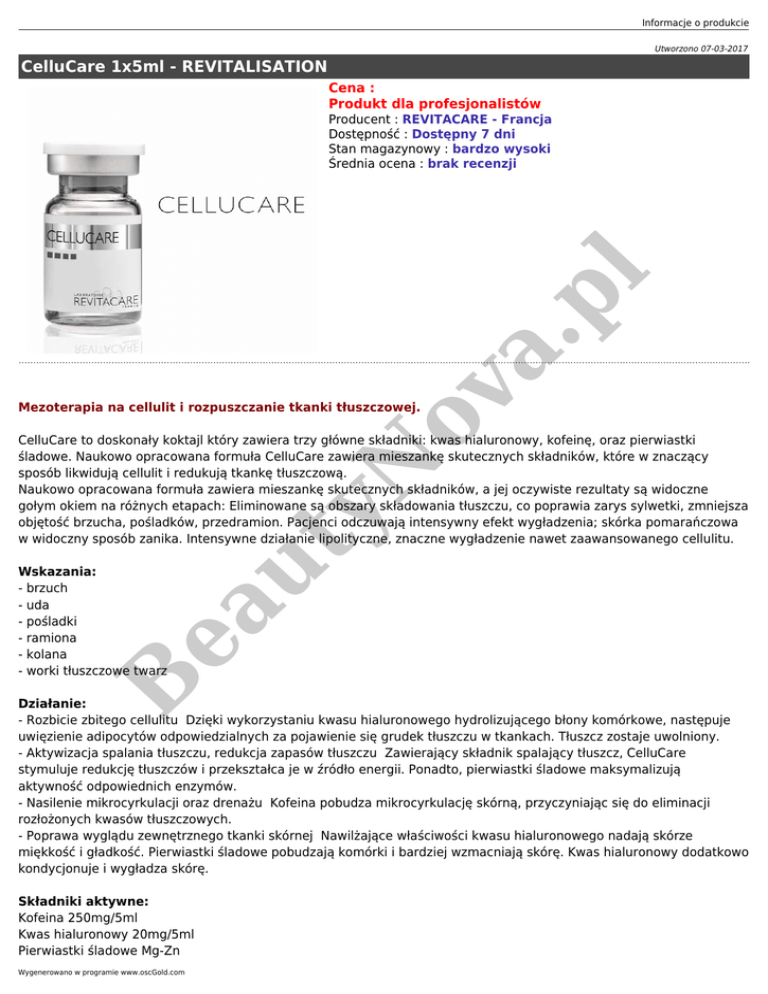 Informacje o produkcie Utworzono 07-03-2017 CelluCare 1x5ml - REVITALISATION Cena : Produkt dla profesjonalistów ov a. pl Producent : REVITACARE - Francja Dostępność : Dostępny 7 dni Stan magazynowy : bardzo wysoki Średnia ocena : brak recenzji Mezoterapia na cellulit i rozpuszczanie tkanki tłuszczowej. B ea Wskazania: - brzuch - uda - pośladki - ramiona - kolana - worki tłuszczowe twarz ut yN CelluCare to doskonały koktajl który zawiera trzy główne składniki: kwas hialuronowy, kofeinę, oraz pierwiastki śladowe. Naukowo opracowana formuła CelluCare zawiera mieszankę skutecznych składników, które w znaczący sposób likwidują cellulit i redukują tkankę tłuszczową. Naukowo opracowana formuła zawiera mieszankę skutecznych składników, a jej oczywiste rezultaty są widoczne gołym okiem na różnych etapach: Eliminowane są obszary składowania tłuszczu, co poprawia zarys sylwetki, zmniejsza objętość brzucha, pośladków, przedramion. Pacjenci odczuwają intensywny efekt wygładzenia; skórka pomarańczowa w widoczny sposób zanika. Intensywne działanie lipolityczne, znaczne wygładzenie nawet zaawansowanego cellulitu. Działanie: - Rozbicie zbitego cellulitu Dzięki wykorzystaniu kwasu hialuronowego hydrolizującego błony komórkowe, następuje uwięzienie adipocytów odpowiedzialnych za pojawienie się grudek tłuszczu w tkankach. Tłuszcz zostaje uwolniony. - Aktywizacja spalania tłuszczu, redukcja zapasów tłuszczu Zawierający składnik spalający tłuszcz, CelluCare stymuluje redukcję tłuszczów i przekształca je w źródło energii. Ponadto, pierwiastki śladowe maksymalizują aktywność odpowiednich enzymów. - Nasilenie mikrocyrkulacji oraz drenażu Kofeina pobudza mikrocyrkulację skórną, przyczyniając się do eliminacji rozłożonych kwasów tłuszczowych. - Poprawa wyglądu zewnętrznego tkanki skórnej Nawilżające właściwości kwasu hialuronowego nadają skórze miękkość i gładkość. Pierwiastki śladowe pobudzają komórki i bardziej wzmacniają skórę. Kwas hialuronowy dodatkowo kondycjonuje i wygładza skórę. Składniki aktywne: Kofeina 250mg/5ml Kwas hialuronowy 20mg/5ml Pierwiastki śladowe Mg-Zn Wygenerowano w programie www.oscGold.com Stosowanie: Tylko do użytku profesjonalnego B ea ut yN ov a. pl Pojemność:10x5ml