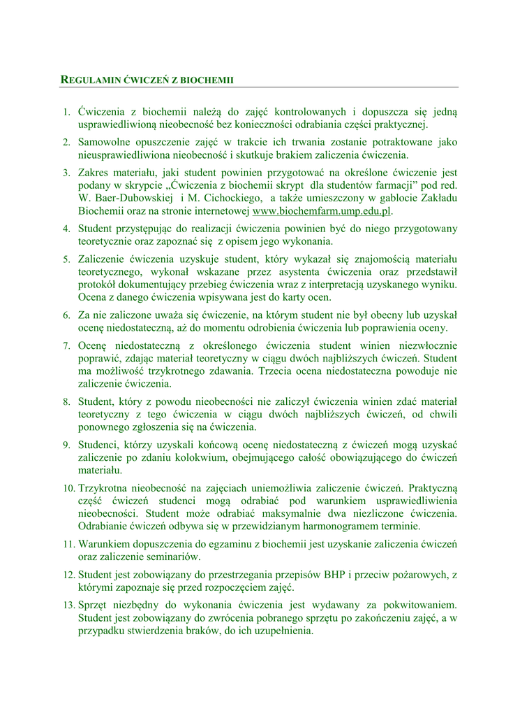 REGULAMIN ĆWICZEŃ Z BIOCHEMII