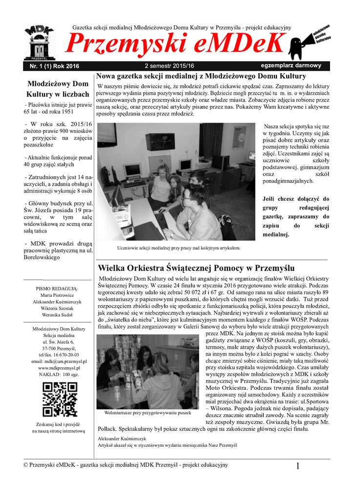 Przemyski eMDeK Gazetka sekcji medialnej Młodzieżowego Domu Kultury w Przemyślu - projekt edukacyjny Nr. 1 (1 ) Rok 201 6 Młodzieżowy Dom Kultury w liczbach 2 semestr 201 5/1 6 egzemplarz darmowy Nowa gazetka sekcji medialnej z Młodzieżowego Domu Kultury W naszym piśmie dowiecie się, że młodzież potrafi ciekawie spędzać czas. Zapraszamy do lektury pierwszego wydania pisma pozytywnej młodzieży. Będziecie mogli przeczytać tu m. in. o wydarzeniach organizowanych przez przemyskie szkoły oraz władze miasta. Zobaczycie zdjęcia robione przez - Placówka istnieje już prawie naszą sekcję, oraz przeczytać artykuły pisane przez nas. Pokażemy Wam kreatywne i aktywne 65 lat - od roku 1951 sposoby spędzania czasu przez młodzież. - W roku szk. 2015/16 Nasza sekcja spotyka się raz złożono prawie 900 wniosków w tygodniu. Uczymy się jak o przyjęcie na zajęcia pisać dobre artykuły oraz pozaszkolne poznajemy techniki robienia zdjęć. Uczestnikami zajęć są - Aktualnie funkcjonuje ponad uczniowie szkoły 40 grup zajęć stałych podstawowej. gimnazjum oraz szkół - Zatrudnionych jest 14 naponadgimnazjalnych. uczycieli, a zadania obsługi i administracji wykonuje 8 osób Jeśli chcesz dołączyć do - Główny budynek przy ul. grupy redagującej Św. Józefa posiada 19 pragazetkę, zapraszamy do cowni, w tym salę widowiskową ze sceną oraz zapisu do sekcji salą tańca medialnej. - MDK prowadzi drugą Uczniowie sekcji medialnej przy pracy nad kolejnym artykułem. pracownię plastyczną na ul. Borelowskiego Wielka Orkiestra Świątecznej Pomocy w Przemyślu PISMO REDAGUJĄ: Marta Piotrowicz Aleksander Kućmierczyk Wiktoria Szostak Weronika Sudoł Młodzieżowy Dom Kultury Sekcja medialna ul. Św. Józefa 6, 37-700 Przemyśl, tel/fax. 16 670-20-03 email: [email protected] www.mdkprzemysl.pl NAKŁAD: 100 egz. Zeskanuj kod i przejdź na naszą stronę internetową Młodzieżowy Dom Kultury od wielu lat angażuje się w organizację finalów Wielkiej Orkiestry Świątecznej Pomocy. W czasie 24 finału w styczniu 2016 przygotowano wiele atrakcji. Podczas tegorocznej kwesty udało się zebrać 50 072 zł i 67 gr. Od samego rana na ulice miasta ruszyło 89 wolontariuszy z papierowymi puszkami, do których chętni mogli wrzucić datki. Tuż przed rozpoczęciem zbiórki odbyło się spotkanie z funkcjonariuszką policji, która pouczyła młodzież, jak zachować się w niebezpiecznych sytuacjach. Najbardziej wytrwali z wolontariuszy zbierali aż do „światełka do nieba”, które jest kulminacyjnym momentem każdego z finałów WOŚP. Podczas finału, który został zorganizowany w Galerii Sanowej do wyboru było wiele atrakcji przygotowanych przez MDK. Na jednym ze stoisk można było kupić gadżety związane z WOŚP (koszuli, gry, obrazki, termosy, małe atrapy dużych puszek wolontariuszy), na innym można było z kolei pograć w szachy. Osoby chcące zmierzyć sobie ciśnienie, miały taką możliwość przy stoisku szpitala wojewódzkiego. Czas umilały występy zespołów młodzieżowych z MDK i szkoły muzycznej w Przemyślu. Tradycyjnie już zagrała Moto Orkiestra. Podczas trwania finału został organizowany rajd samochodowy. Każdy z uczestników miał przejechać dwa okrążenia na trasie: ul.Sportowa – Wilsona. Pogoda jednak nie dopisała, padający Wolontariusze przy przygotowywaniu puszek deszcz znacznie utrudnił zawody. Na scenie zagrały też zespoły muzyczne. Gwiazdą była grupa Mr. Pollack. Spektakularny był pokaz sztucznych ogni na zakończenie głównej części finału. Aleksander Kućmierczyk Artykuł ukazał się w styczniowym wydaniu miesięcznika Nasz Przemyśl © Przemyski eMDeK - gazetka sekcji medialnej MDK Przemyśl - projekt edukacyjny 1 © Przemyski eMDeK - gazetka sekcji medialnej MDK Przemyśl - Nr 1 /201 6 www.mdkprzemysl.pl Królewski weekend w Przemyślu Weekend w połowie września przebiegał w mieście pod znakiem dobrej zabawy. 12 i 13 września, na Starym Mieście odbywało się IV Przemyskie Święto Ulic Kazimierzowskiej i Franciszkańskiej. Organizatorzy przygotowali bogaty program m.in. liczne koncerty, różnorodne konkursy oraz kolorowy korowód królewski. Wzdłuż dwóch ulic, które były bohaterkami święta, rozstawione przez kupców stragany kusiły przechodniów wieloma atrakcjami. W pierwszym dniu, na placu Niepodległości odbył się festiwal Hip-Hop Jam, który był blokiem koncertów skierowanych do młodszego pokolenia. Wystąpili: Kazen, Eroes oraz Bobek BZR. Festiwalowi towarzyszył pokaz grafitti. Powrócił król Kazimierz … Główne atrakcje czekały na mieszkańców w drugim dniu. W niedzielę świętowanie rozpoczął królewski korowód z udziałem samego Kazimierza Wielkiego. Władcy towarzyszyli rycerze, członkowie królewskiej świty, a nawet kat. W korowodzie uczestniczyła młodzież przemyskich grup artystycznych. Przed urzędem miejskim król został powitany przez zastępcę prezydenta Janusza Hamryszczaka, od którego otrzymał klucz do bram miasta. Malowanie twarzy przez nauczycieli MDK Ulice tętniły życiem … Nie dało się nie zauważyć licznych straganów, gdzie Przemyślanie mogli nie tylko zapoznać się z ofertą handlową, ale zobaczyć jak powstają rzeźby z drewna, czy rozegrać partię szachów. Odbyło się kilka konkursów, na najładniejszą koronę, witrynę sklepową oraz na najładniejszy balkon. W czasie święta pracownicy schroniska z Orzechowiec prowadzili zbiórkę karmy dla bezdomnych zwierząt. Odbywał się też pokaz sprzętu strażackiego. Zespół Guitar Project prowadzony przez p. Katarzynę Huget Gwiazdy małe i wielkie … Uczestnicy święta mieli okazję posłuchać muzyki wykonanej przez młodzież i artystów profesjonalnych. W koncertach popołudniowych na scenie zaprezentowali się m. in. uczniowie szkoły muzycznej, Młodzieżowego Domu Kultury oraz przemyskich szkół podstawowych. W części wieczornej wystąpili Reggae Gang System, znana 