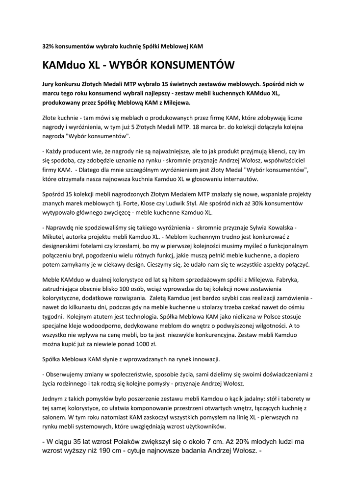 32% konsumentów wybrało kuchnię Spółki Meblowej KAM KAMduo XL - WYBÓR KONSUMENTÓW Jury konkursu Złotych Medali MTP wybrało 15 świetnych zestawów meblowych. Spośród nich w marcu tego roku konsumenci wybrali najlepszy - zestaw mebli kuchennych KAMduo XL, produkowany przez Spółkę Meblową KAM z Milejewa. Złote kuchnie - tam mówi się meblach o produkowanych przez firmę KAM, które zdobywają liczne nagrody i wyróżnienia, w tym już 5 Złotych Medali MTP. 18 marca br. do kolekcji dołączyła kolejna nagroda "Wybór konsumentów". - Każdy producent wie, że nagrody nie są najważniejsze, ale to jak produkt przyjmują klienci, czy im się spodoba, czy zdobędzie uznanie na rynku - skromnie przyznaje Andrzej Wołosz, współwłaściciel firmy KAM. - Dlatego dla mnie szczególnym wyróżnieniem jest Złoty Medal "Wybór konsumentów", które otrzymała nasza najnowsza kuchnia Kamduo XL w głosowaniu internautów. Spośród 15 kolekcji mebli nagrodzonych Złotym Medalem MTP znalazły się nowe, wspaniałe projekty znanych marek meblowych tj. Forte, Klose czy Ludwik Styl. Ale spośród nich aż 30% konsumentów wytypowało głównego zwycięzcę - meble kuchenne Kamduo XL. - Naprawdę nie spodziewaliśmy się takiego wyróżnienia - skromnie przyznaje Sylwia Kowalska Mikutel, autorka projektu mebli Kamduo XL. - Meblom kuchennym trudno jest konkurować z designerskimi fotelami czy krzesłami, bo my w pierwszej kolejności musimy myśleć o funkcjonalnym połączeniu brył, pogodzeniu wielu różnych funkcj, jakie muszą pełnić meble kuchenne, a dopiero potem zamykamy je w ciekawy design. Cieszymy się, że udało nam się te wszystkie aspekty połączyć. Meble KAMduo w dualnej kolorystyce od lat są hitem sprzedażowym spółki z Milejewa. Fabryka, zatrudniająca obecnie blisko 100 osób, wciąż wprowadza do tej kolekcji nowe zestawienia kolorystyczne, dodatkowe rozwiązania. Zaletą Kamduo jest bardzo szybki czas realizacji zamówienia nawet do kilkunastu dni, podczas gdy na meble kuchenne u stolarzy trzeba czekać nawet do ośmiu tygodni. Kolejnym atutem jest technologia. Spółka Meblowa KAM jako nieliczna w Polsce stosuje specjalne kleje wodoodporne, dedykowane meblom do wnętrz o podwyższonej wilgotności. A to wszystko nie wpływa na cenę mebli, bo ta jest niezwykle konkurencyjna. Zestaw mebli Kamduo można kupić już za niewiele ponad 1000 zł. Spółka Meblowa KAM słynie z wprowadzanych na rynek innowacji. - Obserwujemy zmiany w społeczeństwie, sposobie życia, sami dzielimy się swoimi doświadczeniami z życia rodzinnego i tak rodzą się kolejne pomysły - przyznaje Andrzej Wołosz. Jednym z takich pomysłów było poszerzenie zestawu mebli Kamdou o kącik jadalny: stół i taborety w tej samej kolorystyce, co ułatwia komponowanie przestrzeni otwartych wnętrz, łączących kuchnię z salonem. W tym roku natomiast KAM zaskoczył wszystkich pomysłem na linię XL - pierwszych na rynku mebli systemowych, które uwzględniają wzrost użytkowników. - W ciągu 35 lat wzrost Polaków zwiększył się o około 7 cm. Aż 20% młodych ludzi ma wzrost wyższy niż 190 cm - cytuje najnowsze badania Andrzej Wołosz. - - Trend ten ma ogromne znaczenie w projektowaniu mebli kuchennych. Standardową wysokość dolnych i górnych szafek, do której przyzwyczailiśmy się przez ostatnie dekady, musieliśmy zatem dopasować do wysokości jej użytkowników. Osoby, które mają do 170 cm wzrostu mogą z powodzeniem pracować przy blacie roboczym umiejscowionym na wysokości 86 cm, ale już osobom wyższym wygodniej będzie przygotowywać posiłki, gdy blat znajdzie się na wysokości 91 cm. W meblach Kamduo XL, można tę wysokość ustawić za pomocą regulowanych nóżek o wysokości 10 i 15 cm. Także szafki górne zestawu XL "urosły" i są wyższe od standardowych o 28 cm, co pozwoliło na zwiększenie ich pojemności aż o 40%. Dzięki temu cała zabudowa w sposób estetyczny sięga po sam sufit, co dotychczas możliwe było tylko w drogich meblach na zamówienie. - Wydaje się, że w produkcji mebli trudno jest odkryć coś nowego, zaskoczyć konsumentów, ale nam się to udaje i przynosi wiele satysfakcji. Może to nasza wysoczyzna elbląska ma taką dobrą aurę dla odkrywców. Przecież zaledwie 18 km stąd we Fromborku Mikołaj Kopernik odkrył, że ziemia obraca się wokół słońca - śmieje się Andrzej Wołosz.