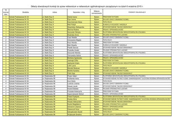 Składy obwodowych komisji do spraw referendum w referendum ogólnokrajowym zarządzonym na dzień 6 września 2015 r. Nr komisji obw. Siedziba Adres Nazwisko i imię Miejsce zamieszkania PODMIOT ZGŁASZAJĄCY 1 Szkoła Podstawowa Nr 33 ul. Matki Ewy 9 Derda Iwona Bytom PREZYDENT BYTOMIA 1 Szkoła Podstawowa Nr 33 ul. Matki Ewy 9 Dyro Iwona Bytom SOJUSZ LEWICY DEMOKRATYCZNEJ 1 Szkoła Podstawowa Nr 33 ul. Matki Ewy 9 Kaczmarczyk Alicja Bytom TWÓJ RUCH 1 Szkoła Podstawowa Nr 33 ul. Matki Ewy 9 Mak Patryk Bytom FUNDACJA WOLNOŚĆ I NADZIEJA 1 Szkoła Podstawowa Nr 33 ul. Matki Ewy 9 Sierpińska Aleksandra Bytom STOWARZYSZENIE "MŁODZI DEMOKRACI" 1 Szkoła Podstawowa Nr 33 ul. Matki Ewy 9 Słonina Rubina Bytom PRAWO I SPRAWIEDLIWOŚĆ 1 Szkoła Podstawowa Nr 33 ul. Matki Ewy 9 Szczurek Olimpia Bytom PLATFORMA OBYWATELSKA RZECZYPOSPOLITEJ POLSKIEJ 1 Szkoła Podstawowa Nr 33 ul. Matki Ewy 9 Świerdza Anna Bytom POLSKIE STRONNICTWO LUDOWE 2 Szkoła Podstawowa Nr 33 ul. Matki Ewy 9 Czyż Natalia Bytom SOJUSZ LEWICY DEMOKRATYCZNEJ 2 Szkoła Podstawowa Nr 33 ul. Matki Ewy 9 Giczewska Magda Bytom TWÓJ RUCH 2 Szkoła Podstawowa Nr 33 ul. Matki Ewy 9 Kurz Wanda Bytom PREZYDENT BYTOMIA 2 Szkoła Podstawowa Nr 33 ul. Matki Ewy 9 Mak Klaudia Bytom FUNDACJA WOLNOŚĆ I NADZIEJA 2 Szkoła Podstawowa Nr 33 ul. Matki Ewy 9 Pawlik Danuta Bytom STOWARZYSZENIE "MŁODZI DEMOKRACI" 2 Szkoła Podstawowa Nr 33 ul. Matki Ewy 9 Pustułka Anatol Bytom POLSKIE STRONNICTWO LUDOWE 2 Szkoła Podstawowa Nr 33 ul. Matki Ewy 9 Szczurek Mariola Bytom PLATFORMA OBYWATELSKA RZECZYPOSPOLITEJ POLSKIEJ 2 Szkoła Podstawowa Nr 33 ul. Matki Ewy 9 Tarnowska Halina Bytom PRAWO I SPRAWIEDLIWOŚĆ 3 Szkoła Podstawowa Nr 33 ul. Matki Ewy 9 Brońska Agnieszka Bytom PRAWO I SPRAWIEDLIWOŚĆ 3 Szkoła Podstawowa Nr 33 ul. Matki Ewy 9 Jastrząb Zofia Bytom PREZYDENT BYTOMIA 3 Szkoła Podstawowa Nr 33 ul. Matki Ewy 9 Jędrysiak Edyta Bytom PLATFORMA OBYWATELSKA RZECZYPOSPOLITEJ POLSKIEJ 3 Szkoła Podstawowa Nr 33 ul. Matki Ewy 9 Letki Laura Bytom TWÓJ RUCH 3 Szkoła Podstawowa Nr 33 ul. Matki Ewy 9 Mendel Mateusz Bytom FUNDACJA WOLNOŚĆ I NADZIEJA 3 Szkoła Podstawowa Nr 33 ul. Matki Ewy 9 Michlik Karolina Bytom SOJUSZ LEWICY DEMOKRATYCZNEJ 3 Szkoła Podstawowa Nr 33 ul. Matki Ewy 9 Palik Kaja Bytom STOWARZYSZENIE "MŁODZI DEMOKRACI" 4 Szkoła Podstawowa Nr 54 ul. Reptowska 86 Fiszer Adam Bytom PLATFORMA OBYWATELSKA RZECZYPOSPOLITEJ POLSKIEJ 4 Szkoła Podstawowa Nr 54 ul. Reptowska 86 Kuliberda Irena Bytom STOWARZYSZENIE PATRIOTYCZNE I SAMORZĄDOWE "OJCZYZNA RODZINA SPRAWIEDLIWOŚĆ" 4 Szkoła Podstawowa Nr 54 ul. Reptowska 86 Kurz Daria Bytom TWÓJ RUCH 4 Szkoła Podstawowa Nr 54 ul. Reptowska 86 Lewicka Jolanta Bytom SOJUSZ LEWICY DEMOKRATYCZNEJ 4 Szkoła Podstawowa Nr 54 ul. Reptowska 86 Nowak Jacek Bytom STOWARZYSZENIE "MŁODZI DEMOKRACI" 4 Szkoła Podstawowa Nr 54 ul. Reptowska 86 Nurek Elżbieta Bytom POLSKIE STRONNICTWO LUDOWE 4 Szkoła Podstawowa Nr 54 ul. Reptowska 86 Przybyła Katarzyna Bytom PREZYDENT BYTOMIA 4 Szkoła Podstawowa Nr 54 ul. Reptowska 86 Szpernalowski Michał Bytom PRAWO I SPRAWIEDLIWOŚĆ 5 Szkoła Podstawowa Nr 54 ul. Reptowska 86 Fiszer Krystyna Bytom PLATFORMA OBYWATELSKA RZECZYPOSPOLITEJ POLSKIEJ 5 Szkoła Podstawowa Nr 54 ul. Reptowska 86 Kwoka Alina Bytom STOWARZYSZENIE PATRIOTYCZNE I SAMORZĄDOWE "OJCZYZNA RODZINA SPRAWIEDLIWOŚĆ" 5 Szkoła Podstawowa Nr 54 ul. Reptowska 86 Nowak Aleksandra Bytom STOWARZYSZENIE "MŁODZI DEMOKRACI" 5 Szkoła Podstawowa Nr 54 ul. Reptowska 86 Nurek Magdalena Bytom POLSKIE STRONNICTWO LUDOWE 5 Szkoła Podstawowa Nr 54 ul. Reptowska 86 Schramm Lilianna Bytom PRAWO I SPRAWIEDLIWOŚĆ 5 Szkoła Podstawowa Nr 54 ul. Reptowska 86 Szewczuk Ilona Bytom PREZYDENT BYTOMIA 5 Szkoła Podstawowa Nr 54 ul. Reptowska 86 Szkopkowski Dawid Bytom TWÓJ RUCH 5 Szkoła Podstawowa Nr 54 ul. Reptowska 86 Wojtaszek Ewelina Bytom SOJUSZ LEWICY DEMOKRATYCZNEJ 6 Dom Pomocy Społecznej "Kombatant" ul. Stolarzowicka 33 Bojakowska Angelika Bytom PREZYDENT BYTOMIA 6 Dom Pomocy Społecznej "Kombatant" ul. Stolarzowicka 33 Breguła Stanisława Bytom PRAWO I SPRAWIEDLIWOŚĆ 6 Dom Pomocy Społecznej "Kombatant" ul. Stolarzowicka 33 Grula Magdalena Bytom TWÓJ RUCH 6 Dom Pomocy Społecznej "Kombatant" ul. Stolarzowicka 33 Sicińska Izabela Bytom POLSKIE STRONNICTWO LUDOWE 6 Dom Pomocy Społecznej "Kombatant" ul. Stolarzowicka 33 Staniszewska Marta Bytom PLATFORMA OBYWATELSKA RZECZYPOSPOLITEJ POLSKIEJ 6 Dom Pomocy Społecznej "Kombatant" ul. Stolarzowicka 33 Szkutnik Dorota Bytom STOWARZYSZENIE PATRIOTYCZNE I SAMORZĄDOWE "OJCZYZNA RODZINA SPRAWIEDLIWOŚĆ" 6 Dom Pomocy Społecznej "Kombatant" ul. Stolarzowicka 33 Wiśniewska Genowefa Bytom SOJUSZ LEWICY DEMOKRATYCZNEJ 7 Zespół Szkół Ogólnokształcących Nr 5 ul. Nickla 19 Glosz Elżbieta Bytom STOWARZYSZENIE "MŁODZI DEMOKRACI" 7 Zespół Szkół Ogólnokształcących Nr 5 ul. Nickla 19 Kucza Bronisława Bytom POLSKIE STRONNICTWO LUDOWE 7 Zespół Szkół Ogólnokształcących Nr 5 ul. Nickla 19 Lewicka Marta Bytom SOJUSZ LEWICY DEMOKRATYCZNEJ 7 Zespół Szkół Ogólnokształcących Nr 5 ul. Nickla 19 Madeja Aleksandra Bytom PLATFORMA OBYWATELSKA RZECZYPOSPOLITEJ POLSKIEJ 7 Zespół Szkół Ogólnokształcących Nr 5 ul. Nickla 19 Michalska Magdalena Bytom STOWARZYSZENIE PATRIOTYCZNE I SAMORZĄDOWE "OJCZYZNA RODZINA SPRAWIEDLIWOŚĆ" 7 Zespół Szkół Ogólnokształcących Nr 5 ul. Nickla 19 Skalska Gabriela Bytom PREZYDENT BYTOMIA 7 Zespół Szkół Ogólnokształcących Nr 5 ul. Nickla 19 Stania Joanna Bytom TWÓJ RUCH 7 Zespół Szkół Ogólnokształcących Nr 5 ul. Nickla 19 Szubrowski Andrzej Bytom PRAWO I SPRAWIEDLIWOŚĆ 8 Zespół Szkół Ogólnokształcących Nr 5 ul. Nickla 19 Czajkowska Barbara Bytom POLSKIE STRONNICTWO LUDOWE 8 Zespół Szkół Ogólnokształcących Nr 5 ul. Nickla 19 Maruszczak Justyna Bytom PLATFORMA OBYWATELSKA RZECZYPOSPOLITEJ POLSKIEJ 8 Zespół Szkół Ogólnokształcących Nr 5 ul. Nickla 19 Pepłowska Magdal