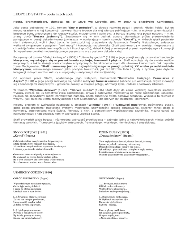 LEOPOLD STAFF – poeta trzech epok Poeta, dramatopisarz, tłumacz, ur. w 1878 we Lwowie, zm. w 1957 w Skarżysku Kamiennej. Jako poeta debiutował w 1901 tomem "Sny o potędze", w okresie rozkwitu poezji i poetyki Młodej Polski. Był on mocno osadzony w tej konwencji i zawierał liczne typowe dla niej wiersze (obfitujące m.in. w motywy tajemniczości i bezsensu bytu, zniechęcenia do rzeczywistości, mizoginizmu i walki płci, z bardzo istotną rolą poezji nastroju - m.in. znany utwór "Deszcz jesienny"). Znajdowały się w nim jednak utwory stanowiące próbę przezwyciężenia panującego w poezji dekadentyzmu (zwłaszcza w otwierającym tomik sonecie "Kowal"), w których głosił postulaty siły i aktywności, woli i chęci życia. W twórczości tej przejawiała się fascynacja filozofią Nietzschego, zwłaszcza wątkami związanymi z pojęciem "woli mocy" i koncepcją nadczłowieka (Staff pojmował ją w swoisty, niesprzeczny z chrześcijańskimi wartościami współczucia i litości sposób), dzięki której przełamywał prymat wynikającego z koncepcji Schopenhauerowskiej modernistycznego pesymizmu oraz postawy dekadenckiej. Począwszy od tomów "Gałąź kwitnąca" (1908) i "Uśmiechy godzin" (1910) w jego poezji zaczęły przeważać tendencje klasyczne, wyrażające się w poszukiwaniu spokoju, harmonii i piękna. Staff odwołuje się do świata realiów antycznych, a także stosuje wiele chwytów artystycznych charakterystycznych dla utworów klasycznych. Jak napisała Irena Maciejewska, "Staff uznawany jest za najwybitniejszego w poezji polskiej XX wieku przedstawiciela klasycyzmu, rozumianego zarówno jako poetyka twórczości, jak też filozofia ładu i zgody z życiem, jako dążenie integracji różnych nurtów kultury europejskiej - antycznej i chrześcijańskiej. Od wydania przez Staffa, opatrzonego jego wstępem, tłumaczenia "Kwiatków świętego Franciszka z Asyżu" (1910) w jego poezji zaczynają się nasilać motywy franciszkańskie (obecne już wcześniej), często zlewając się z tendencjami klasycznymi - głoszenie pokory w miejsce potęgi, afirmacji życia, radości i pochwały istnienia. W tomach "Wysokie drzewa" (1932) i "Barwa miodu" (1936) Staff dąży do coraz większej zwięzłości środków wyrazu, zwraca się ku tematyce życia codziennego, zrywa z patetyczną metaforyką na rzecz codziennego konkretu. Pojawia się specyficzny rodzaj żartobliwego humoru, poeta akcentuje swoją postawę sceptyka. Wynikało to również z wpływu, jaki mieli na Staffa zaprzyjaźnieni z nim Skamandryci, dla których był mistrzem i patronem. Kolejny przełom w twórczości następuje w zbiorach "Wiklina" (1954) i "Dziewięć muz"(wyd. pośmiertne 1958), gdzie poeta przełamał tradycyjne systemy metryczne, unowocześnił sposób obrazowania, stworzył mniej dbałą o harmonię, autoironiczną wizję świata. Pierwszy z nich, z perspektywy współczesnego czytelnika, można uznać za najwybitniejszy i najdojrzalszy tom w twórczości Lepolda Staffa. Staff prowadził także bogatą i różnorodną twórczość przekładową – zajmuje jedno z najwybitniejszych miejsc pośród tłumaczy polskich. Tłumaczył z języków antycznych, francuskiego, włoskiego, niemieckiego i angielskiego. SNY O POTĘDZE [1901] „Kowal”(fragm.) DZIEŃ DUSZY [1903] „Deszcz jesienny” (fragm.) Całą bezkształtną masę kruszców drogocennych, Które zaległy piersi mej głąb nieodgadłą, Jak wulkan z swych otchłani wyrzucam bezdennych I ciskam ją na twarde, stalowe kowadło. To w szyby deszcz dzwoni, deszcz dzwoni jesienny I pluszcze jednaki, miarowy, niezmienny, Dżdżu krople padają i tłuką w me okno... Jęk szklany... płacz szklany... a szyby w mgle mokną I światła szarego blask sączy się senny... O szyby deszcz dzwoni, deszcz dzwoni jesienny... Grzmotem młota w nią walę w radosnej otusze, Bo wykonać mi trzeba dzieło wielkie, pilne, Bo z tych kruszców dla siebie serce wykuć muszę, Serce hartowne, mężne, serce dumne, silne. UŚMIECHY GODZIN [1910] OGRÓD PRZEDZIWNY (fragm.) NIEWINNOŚĆ (fragm.) W przedziwnym mieszkam ogrodzie, Gdzie żyją kwiaty i dzieci I gdzie po słońca zachodzie Uśmiech nam z oczu świeci. [...] Soczysta, mokra trawa Źdźbeł czułe ciałka suszy. Wiatr zdrowy jak zabawa... Śmiech w zachwyconej duszy... [...] Żywim rój ptaków, co budzi Ze snu nas rannym powiewem, Ucząc nas iść między ludzi Z dobrą nowiną i śpiewem. [...] Skowronek, ranka serce, W błękitach szczęściem bije. Kwieciste łąk kobierce Są boże i niczyje. [...] I pielęgnujem murawę, Plewiąc z niej chwasty i osty, By każdy, patrząc na trawę, Duszą, jak trawa, był prosty. Precz z głowy myśli żeną. Jak dziecko, gdzieś przed laty, Oczyma myślę jeno: ...Niebiosa, słońce, kwiaty... GAŁĄŹ KWITNĄCA [1908] PRZEDŚPIEW BARWA MIODU [1936] ARS POETICA Czciciel gwiazd i mądrości, miłośnik ogrodów, Wyznawca snów i piękna i uczestnik godów, Na które swych wybrańców sprasza sztuka boska: Znam gorycz i zawody, wiem, co ból i troska, Złuda miłości, zwątpień mrok, tęsknot rozbicia, A jednak śpiewać będę wam pochwałę życia Bo żyłem długo w górach i mieszkałem w lasach. Pamięcią swe dni chmurne i dni w słońca krasach Przechodzę, jakby jakieś wielkie, dziwne miasta, Z myślą ciężką, jak z dzbanem na głowie niewiasta, A dzban wino ukrywa i łzy w swojej cieśni. Kochałem i wiem teraz, skąd się rodzą pieśni; Widziałem konających w nadziejnej otusze I kobiety przy studniach brzemienne, jak grusze; Szedłem przez pola żniwne i mogilne kopce, Żyłem i z rzeczy ludzkich nic nie jest mi obce. Przeto myśli me, które stoją przy mnie w radzie, Choć smutne, są pogodne jako starcy w sadzie. I uczę miłowania, radości w uśmiechu, W łzach widzieć słodycz smutną, dobroć chorą w grzechu, I pochwalam tajń życia w pieśni i w milczeniu, Pogodny mądrym smutkiem i wprawny w cierpieniu. Echo z dna serca, nieuc