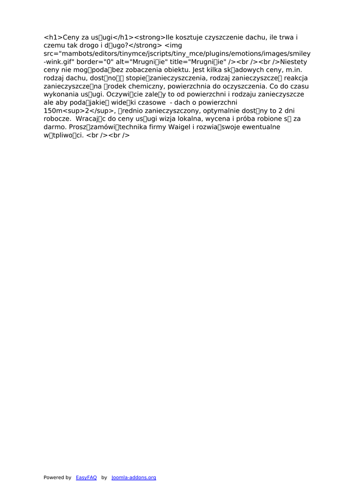 <h1>Ceny za us�ugi</h1><strong>Ile kosztuje czyszczenie dachu, ile trwa i czemu tak drogo i d�ugo?</strong> <img src="mambots/editors/tinymce/jscripts/tiny_mce/plugins/emotions/images/smiley -wink.gif" border="0" alt="Mrugni�ie" title="Mrugni�ie" /><br /><br />Niestety ceny nie mog�poda�bez zobaczenia obiektu. Jest kilka sk�adowych ceny, m.in. rodzaj dachu, dost�no�� stopie�zanieczyszczenia, rodzaj zanieczyszcze� reakcja zanieczyszcze�na �rodek chemiczny, powierzchnia do oczyszczenia. Co do czasu wykonania us�ugi. Oczywi�cie zale�y to od powierzchni i rodzaju zanieczyszcze ale aby poda�jakie� wide�ki czasowe - dach o powierzchni 150m<sup>2</sup>, �rednio zanieczyszczony, optymalnie dost�ny to 2 dni robocze. Wracaj�c do ceny us�ugi wizja lokalna, wycena i próba robione s� za darmo. Prosz�zamówi�technika firmy Waigel i rozwia�swoje ewentualne w�tpliwo�ci. <br /><br /> Powered by EasyFAQ by Joomla-addons.org