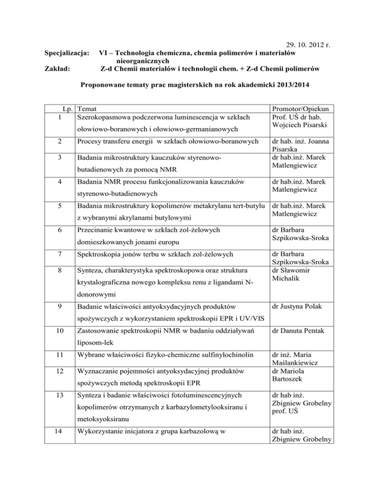 Specjalizacja: Zakład: 29. 10. 2012 r. VI – Technologia chemiczna, chemia polimerów i materiałów nieorganicznych Z-d Chemii materiałów i technologii chem. + Z-d Chemii polimerów Proponowane tematy prac magisterskich na rok akademicki 2013/2014 1 Lp. Temat Szerokopasmowa podczerwona luminescencja w szkłach ołowiowo-boranowych i ołowiowo-germanianowych 2 Procesy transferu energii w szkłach ołowiowo-boranowych 3 Badania mikrostruktury kauczuków styrenowobutadienowych za pomocą NMR 4 Badania NMR procesu funkcjonalizowania kauczuków styrenowo-butadienowych Promotor/Opiekun Prof. UŚ dr hab. Wojciech Pisarski dr hab. inż. Joanna Pisarska dr hab.inż. Marek Matlengiewicz dr hab.inż. Marek Matlengiewicz 5 Badania mikrostruktury kopolimerów metakrylanu tert-butylu dr hab.inż. Marek Matlengiewicz z wybranymi akrylanami butylowymi 6 Przecinanie kwantowe w szkłach zol-żelowych domieszkowanych jonami europu 7 Spektroskopia jonów terbu w szkłach zol-żelowych 8 Synteza, charakterystyka spektroskopowa oraz struktura krystalograficzna nowego kompleksu renu z ligandami N- dr Barbara Szpikowska-Sroka dr Barbara Szpikowska-Sroka dr Sławomir Michalik donorowymi 9 Badanie właściwości antyoksydacyjnych produktów dr Justyna Polak spożywczych z wykorzystaniem spektroskopii EPR i UV/VIS 10 Zastosowanie spektroskopii NMR w badaniu oddziaływań dr Danuta Pentak liposom-lek 11 Wybrane właściwości fizyko-chemiczne sulfinylochinolin 12 Wyznaczanie pojemności antyoksydacyjnej produktów spożywczych metodą spektroskopii EPR 13 Synteza i badanie właściwości fotoluminescencyjnych kopolimerów otrzymanych z karbazylometylooksiranu i dr inż. Maria Maślankiewicz dr Mariola Bartoszek dr hab inż. Zbigniew Grobelny prof. UŚ metoksyoksiranu 14 Wykorzystanie inicjatora z grupa karbazolową w dr hab inż. Zbigniew Grobelny polimeryzacji tlenku propylenu 15 16 17 18 19 prof. UŚ Modyfikacja chemiczna polistyrenu związkami zawierającymi dr hab inż. Ewa Schab-Balcerzak atomy krzemu prof. UŚ opiekun: mgr inż. (Urszula Kucia) Małgorzata Wiącek dr hab inż. Ewa Synteza (poli)azometinodiimidów oraz badanie ich Schab-Balcerzak właściwości termicznych i optycznych. prof. UŚ opiekun: mgr Grucela-Zając dr hab inż. Ewa Właściwości optyczne warstw polimerów fotochromowych Schab-Balcerzak Praca do realizacji w CMPW PAN w Zabrzu prof. UŚ opiekun: mgr inż. (Agnelika Mrowiec) Magdalena Wójtowicz dr hab inż. Ewa Badania kopolimerów blokowych 4-metylo-2-oksetanonu i Schab-Balcerzak tlenku etylu metodą cheomartogrfaii cieczowej prof. UŚ opiekun: dr Michał Praca do realizacji w CMPW PAN w Zabrzu Kawalec Synteza i charakterystyka nowych monomerów do otrzymania dr hab inż. Ewa Schab-Balcerzak modyfikowanych poliimidów prof. UŚ opiekun: dr Bożena Praca do realizacji w CMPW PAN w Zabrzu Jarząbek (Patrycja Gamza)