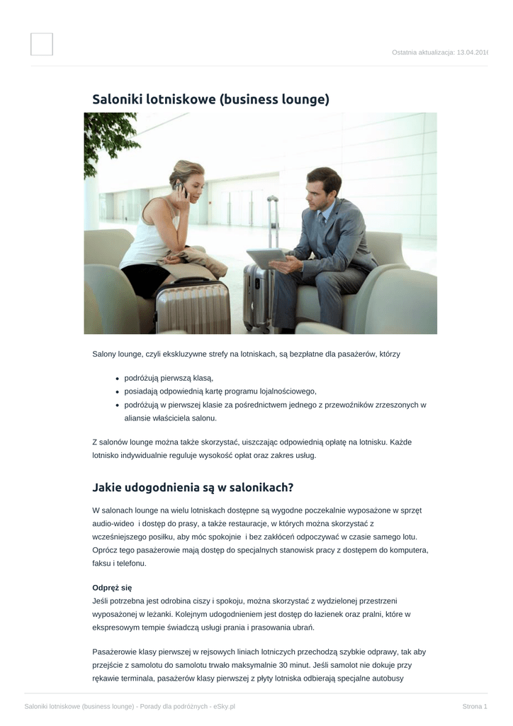 Ostatnia aktualizacja: 13.04.2016 Saloniki lotniskowe (business lounge) Salony lounge, czyli ekskluzywne strefy na lotniskach, są bezpłatne dla pasażerów, którzy podróżują pierwszą klasą, posiadają odpowiednią kartę programu lojalnościowego, podróżują w pierwszej klasie za pośrednictwem jednego z przewoźników zrzeszonych w aliansie właściciela salonu. Z salonów lounge można także skorzystać, uiszczając odpowiednią opłatę na lotnisku. Każde lotnisko indywidualnie reguluje wysokość opłat oraz zakres usług. Jakie udogodnienia są w salonikach? W salonach lounge na wielu lotniskach dostępne są wygodne poczekalnie wyposażone w sprzęt audio-wideo i dostęp do prasy, a także restauracje, w których można skorzystać z wcześniejszego posiłku, aby móc spokojnie i bez zakłóceń odpoczywać w czasie samego lotu. Oprócz tego pasażerowie mają dostęp do specjalnych stanowisk pracy z dostępem do komputera, faksu i telefonu. Odpręż się Jeśli potrzebna jest odrobina ciszy i spokoju, można skorzystać z wydzielonej przestrzeni wyposażonej w leżanki. Kolejnym udogodnieniem jest dostęp do łazienek oraz pralni, które w ekspresowym tempie świadczą usługi prania i prasowania ubrań. Pasażerowie klasy pierwszej w rejsowych liniach lotniczych przechodzą szybkie odprawy, tak aby przejście z samolotu do samolotu trwało maksymalnie 30 minut. Jeśli samolot nie dokuje przy rękawie terminala, pasażerów klasy pierwszej z płyty lotniska odbierają specjalne autobusy Saloniki lotniskowe (business lounge) - Porady dla podróżnych - eSky.pl Strona 1 pierwszej klasy lub limuzyny. Saloniki VIP to luksusowo wyposażone salony, gdzie pasażerowie mogą oczekiwać na lot. Często salony VIP posiadają odrębny punkt kontroli bezpieczeństwa. W salonach takich można organizować spotkania biznesowe; zazwyczaj jest w nich dostęp do Internetu czy sprzętów biurowych. Jest to usługa płatna, wymagająca wcześniejszej rezerwacji. To może Cię zainteresować: Ostrzeżenia MSZ dla podróżnych Jak poprawić błąd na bilecie lotniczym? Ile miejsc zostało w samolocie? Zobacz również: Saloniki lotniskowe (business lounge) - Porady dla podróżnych - eSky.pl Strona 2