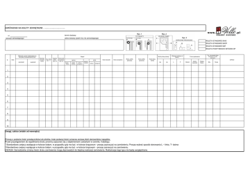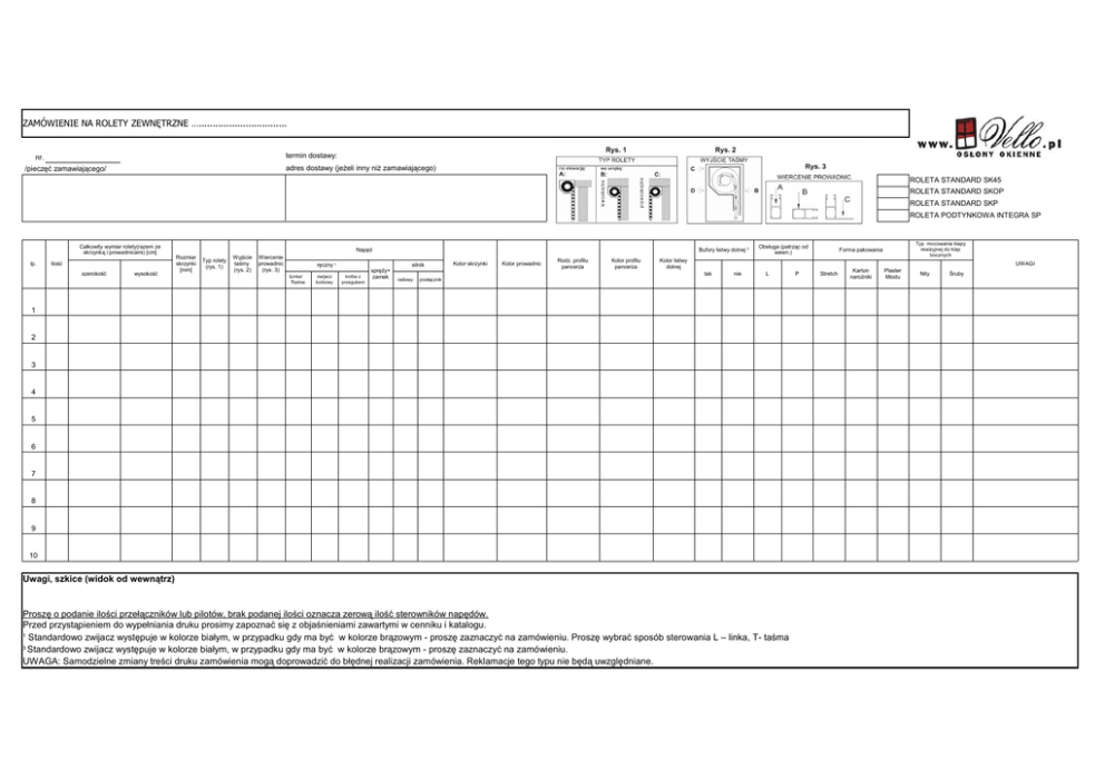 ZAMÓWIENIE NA ROLETY ZEWNĘTRZNE …................................ termin dostawy: nr. adres dostawy (jeżeli inny niż zamawiającego) /pieczęć zamawiającego/ ROLETA STANDARD SK45 ROLETA STANDARD SKOP ROLETA STANDARD SKP ROLETA PODTYNKOWA INTEGRA SP Całkowity wymiar rolety(razem ze skrzynką i prowadnicami) [cm] lp. Ilość szerokość wysokość Napęd Rozmiar skrzynki [mm] Typ rolety (rys. 1) Wyjście taśmy (rys. 2) Wiercenie prowadnic (rys. 3) ręczny 1 Linka/ Taśma zwijacz korbowy korba z przegubem spręży+ zamek Bufory listwy dolnej 2 silnik Kolor skrzynki Kolor prowadnic Rodz. profilu pancerza Kolor profilu pancerza Typ mocowania klapy rewizyjnej do klap bocznych Forma pakowania Kolor listwy dolnej UWAGI tak radiowy Obsługa (patrząc od wewn.) nie L przełącznik 1 2 3 4 5 6 7 8 9 10 Uwagi, szkice (widok od wewnątrz) Proszę o podanie ilości przełączników lub pilotów, brak podanej ilości oznacza zerową ilość sterowników napędów. Przed przystąpieniem do wypełniania druku prosimy zapoznać się z objaśnieniami zawartymi w cenniku i katalogu. 1 Standardowo zwijacz występuje w kolorze białym, w przypadku gdy ma być w kolorze brązowym - proszę zaznaczyć na zamówieniu. Proszę wybrać sposób sterowania L – linka, T- taśma 3 Standardowo zwijacz występuje w kolorze białym, w przypadku gdy ma być w kolorze brązowym - proszę zaznaczyć na zamówieniu. UWAGA: Samodzielne zmiany treści druku zamówienia mogą doprowadzić do błędnej realizacji zamówienia. Reklamacje tego typu nie będą uwzględniane. P Stretch Karton narożniki Plaster Miodu Nity Śruby