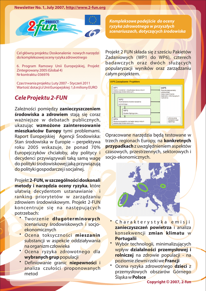 Newsletter No. 1, July 2007, http://www.2-fun.org Kompleksowe podejœcie do oceny ryzyka zdrowotnego w przysz³ych scenariuszach, dotycz¹cych œrodowiska Cel g³ówny projektu: Doskonalenie nowych narzêdzi do kompleksowej oceny ryzyka zdrowotnego 6. Program Ramowy Unii Europejskiej, Projekt Zintegrowany 2005 (Global 4) Nr kontraktu: 036976 Projekt 2 FUN sk³ada siê z szeœciu Pakietów Zadaniowych (WP1 do WP6), czterech badawczych oraz dwóch s³u¿¹cych popularyzacji wyników oraz zarz¹dzaniu ca³ym projektem. Czas trwania projektu: Luty 2007 – Styczeñ 2011 Wartoœæ dotacji z Unii Europejskiej: 1,6 miliony EURO Cele Projektu 2-FUN Zale¿noœci pomiêdzy zanieczyszczeniem œrodowiska a zdrowiem staj¹ siê coraz wa¿niejsze w debatach publicznych, ukazuj¹c wzmo¿one zainteresowanie mieszkañców Europy tymi problemami. Raport Europejskiej Agencji Œrodowiska: Stan œrodowiska w Europie – perpektywa roku 2005 wskazuje, ¿e ponad 70% Europejczyków chcia³oby, aby politycy i decydenci przywi¹zywali tak¹ sam¹ wagê do polityki œrodowiskowej jak¹ przywi¹zuj¹ do polityki gospodarczej i socjalnej. Projekt 2-FUN, w szczególnoœci doskonali metody i narzêdzia oceny ryzyka, które u³atwi¹ decydentom ustanawianie i ranking priorytetów w zarz¹dzaniu zdrowiem œrodowiskowym. Projekt 2-FUN koncentruje siê na nastêpuj¹c ych potrzebach: ? Tworzenie d³ugoterminow ych scenariuszy œrodowiskowych i socjoekonomicznych ? Ocena toksycznoœci mieszanin substancji w aspekcie oddzia³ywania na organizm cz³owieka ? Ocena ryzyka zdrowotnego dla wybranych grup populacji ? Definiowanie granic niepewnoœci i analiza czu³oœci proponowanych metod Opracowane narzêdzia bêd¹ testowane w trzech regionach Europy, na konkretnych przypadkach z uwzglêdnieniem aspektów czasowych, przestrzennych, sektorowych i socjo-ekonomicznych. ? Charakterystyka emisji zanieczyszczeñ powietrza i analiza konsekwencji zmian klimatu w Portugalii ? Wybór technologii, minimalizuj¹cych wp³yw dzia³alnoœci przemys³owej i rolniczej na zdrowie populacji - na poziomie zlewni rzeki we Francji ? Ocena ryzyka zdrowotnego dzieci z przemys³owych obszarów Górnego Œl¹ska w Polsce Copyright © 2007, 2-fun Newsletter No. 1, July 2007, http://www.2-fun.org Kompleksowe podejœcie do oceny ryzyka zdrowotnego w przysz³ych scenariuszach, dotycz¹cych œrodowiska 2-FUN inicjuje powstanie platformy dyskusyjnej i wymiany doœwiadczeñ pomiêdzy zainteresowanymi stronami (naukowcy, decydenci i spo³eczeñstwo) w celu monitorowania i kreowania inicjatyw naukowych, dotycz¹cych zagadnieñ œrodowiska, zdrowia i oceny ryzyka zdrowotnego. 2-FUN inicjuje tak¿e kontakty z czterema innymi projektami 6. Programu Ramowego UE dotycz¹cymi oceny ryzyka zdrowotnego. ? INTARESE ? Facilia AB: Software development company, Sweden ? IETU: Instytut Ekologii Terenów Uprzemys³owionych, Polska ? IPHO: Ostrava Institute of Public Health, Czech Republic ? FFCUL: Foundation the Sciences Faculty of the University of Lisbon, Portugal ? UCSC: Catholic Holy Heart University, Italy ? UNIVE: Venice Ca Foscari University, Italy ? VITO: Flemish I nstitute for Technological Research, Belgium. ? HEIMTSA ? NOMIRACLE ? ENVIRISK Informacje zawarte w ulotce prezentuj¹ wy³¹cznie pogl¹dy autorów. Wspólnota Europejska nie ponosi odpowiedzialnoœci za wykorzystanie zawartych w niej treœci. Partnerzy 12 partnerów z 9 krajów europejskich: ? INERIS: National Institute for Industrial Environment and Risks, France (co-ordinator: Frédéric Y. Bois, [email protected]) ? EDF: Electricité de France ? JRC: European Commission Joint Research Centre, Ispra, Italy ? UFZ: Helmholtz Centre for Environmental Research, Germany ? DTU: Danish Technical University, Denmark Copyright © 2007, 2-fun