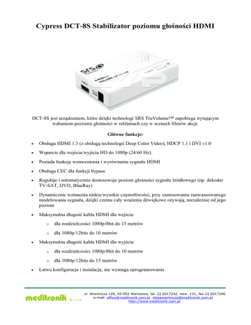 Cypress DCT-8S Stabilizator poziomu głośności HDMI DCT-8S jest urządzeniem, które dzięki technologi SRS TruVolume™ zapobiega irytującym wahaniom poziomu głośności w reklamach czy w scenach filmów akcji. Główne funkcje: Obsługa HDMI 1.3 (z obsługą technologii Deep Color Video), HDCP 1.1 i DVI v1.0 Wsparcie dla wejścia/wyjścia HD do 1080p (24/60 Hz). Posiada funkcję wzmocnienia i wyrównania sygnału HDMI Obsługa CEC dla funkcji bypass Reguluje i automatycznie dostosowuje poziom głośności sygnału źródłowego (np. dekoder TV-SAT, DVD, BlueRay) Dynamicznie wzmacnia niskie/wysokie częstotliwości, przy zastosowaniu zaawansowanego modelowania sygnału, dzięki czemu cały wrażenia dźwiękowe ożywają, niezależnie od jego poziom Maksymalna długość kabla HDMI dla wejścia: o dla rozdzielczości 1080p/8bit do 15 metrów o dla 1080p/12bits do 10 metrów Maksymalna długość kabla HDMI dla wyjścia: o dla rozdzielczości 1080p/8bit do 10 metrów o dla 1080p/12bits do 15 metrów Łatwa konfiguracja i instalacja, nie wymaga oprogramowania ul. Wiertnicza 129, 02-952 Warszawa, tel. 22 6517242, wew. 131, fax 22 6517246 e-mail: [email protected] [email protected] http://www.meditronik.com.pl Specyfikacja techniczna: Port wejścia 1 x HDMI Format sygnału audio wejścia HDMI: 2 kanały (tylko PCM 32k/44,1k/48k) Port wyjścia 1 x HDMI Format sygnału audio wyjścia HDMI: 2 kanały Zasilanie 5V/1A DC Temperatura pracy 0 ° C ~ 40 ° C Temperatura przechowywania -20 ° C ~ 60 ° C Wilgotność względna 20 ~ 90% RH (bez kondensacji) Pobór mocy 3W Zawartość opakowania: regulator sygnału audio SRS TruVolume™ w HDMI, zasilacz 5V, instrukcja obsługi Specyfikacja producenta (źródło opisu): [link] ul. Wiertnicza 129, 02-952 Warszawa, tel. 22 6517242, wew. 131, fax 22 6517246 e-mail: [email protected] [email protected] http://www.meditronik.com.pl