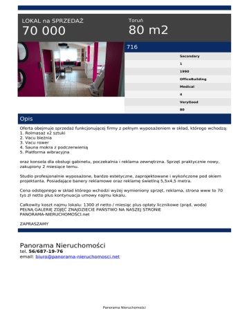 Toruń LOKAL na SPRZEDAŻ 80 m2 70 000 716 Secondary 1 1990 OfficeBuilding Medical 4 VeryGood 80 Opis Oferta obejmuje sprzedaż funkcjonującej firmy z pełnym wyposażeniem w skład, którego wchodzą: 1. Rolmasaż x2 sztuki 2. Vacu bieżnia 3. Vacu rower 4. Sauna mokra z podczerwienią 5. Platforma wibracyjna oraz konsola dla obsługi gabinetu, poczekalnia i reklama zewnętrzna. Sprzęt praktycznie nowy, zakupiony 2 miesiące temu. Studio profesjonalnie wyposażone, bardzo estetyczne, zaprojektowane i wykończone pod okiem projektanta. Posiadające banery reklamowe oraz reklamę świetlną 5,5x4,5 metra. Cena odstępnego w skład którego wchodzi wyżej wymieniony sprzęt, reklama, strona www to 70 tys zł netto plus kontynuacja umowy najmu lokalu. Całkowity koszt najmu lokalu: 1300 zł netto / miesiąc plus opłaty licznikowe (prąd, woda) PEŁNĄ GALERIĘ ZDJĘĆ ZNAJDZIECIE PAŃSTWO NA NASZEJ STRONIE PANORAMA-NIERUCHOMOŚCI.net ZAPRASZAMY Panorama Nieruchomości tel. 56/687-19-76 email: [email protected] Panorama Nieruchomości Powered by TCPDF (www.tcpdf.org)