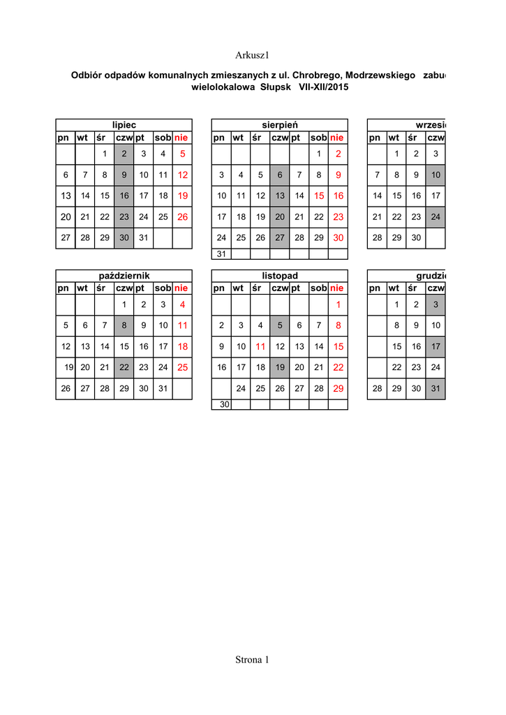 Arkusz1 Odbiór odpadów komunalnych zmieszanych z ul. Chrobrego, Modrzewskiego zabudowa wielolokalowa Słupsk VII-XII/2015 lipiec pn wt śr czw pt sob nie 1 2 3 4 5 sierpień pn wt śr czw pt sob nie 1 2 8 9 wrzesień pn wt śr czw 1 2 3 7 8 9 10 6 7 8 9 10 11 12 3 4 5 6 7 13 14 15 16 17 18 19 10 11 12 13 14 15 16 14 15 16 17 20 21 22 23 24 25 26 17 18 19 20 21 22 23 21 22 23 24 27 28 29 30 31 24 25 26 27 28 29 30 28 29 30 31 październik pn wt śr czw pt sob nie 1 2 3 4 pn wt śr listopad czw pt sob nie grudzień pn wt śr czw 1 1 2 3 5 6 7 8 9 10 11 2 3 4 5 6 7 8 7 8 9 10 12 13 14 15 16 17 18 9 10 11 12 13 14 15 14 15 16 17 19 20 21 22 23 24 25 16 17 18 19 20 21 22 21 22 23 24 28 29 30 31 23 24 25 26 27 28 29 28 29 30 31 26 27 30 Strona 1 Arkusz1 iego zabudowa wrzesień pt sob nie 4 5 6 11 12 13 18 19 20 25 26 27 grudzień pt sob nie 4 5 6 11 12 13 18 19 20 25 26 27 Strona 2