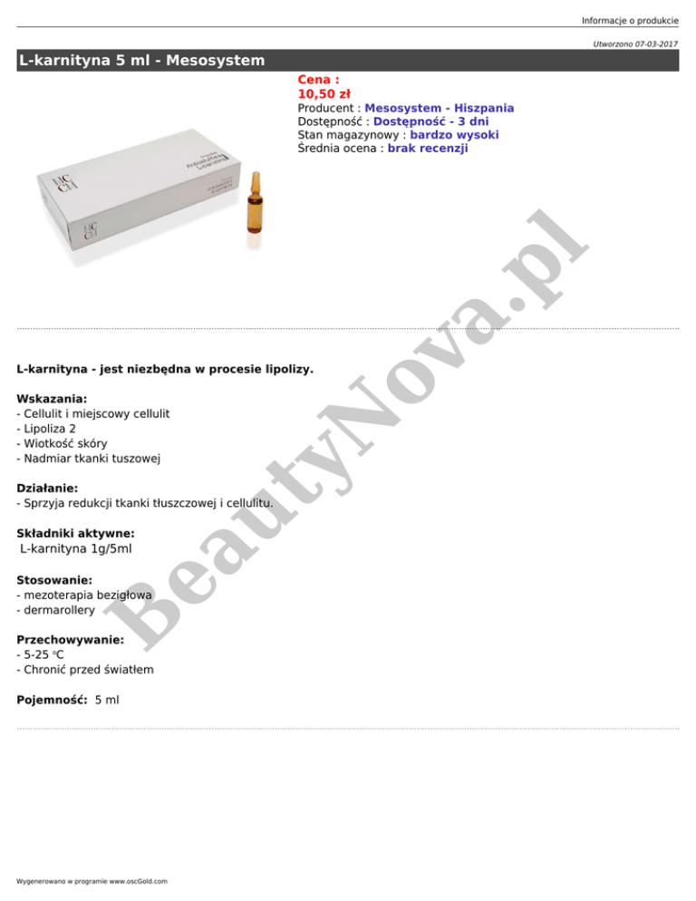 Informacje o produkcie Utworzono 07-03-2017 L-karnityna 5 ml - Mesosystem Cena : 10,50 zł Wskazania: - Cellulit i miejscowy cellulit - Lipoliza 2 - Wiotkość skóry - Nadmiar tkanki tuszowej yN L-karnityna - jest niezbędna w procesie lipolizy. ea L-karnityna 1g/5ml ut Działanie: - Sprzyja redukcji tkanki tłuszczowej i cellulitu. Składniki aktywne: B Stosowanie: - mezoterapia bezigłowa - dermarollery Przechowywanie: - 5-25 oC - Chronić przed światłem Pojemność: 5 ml Wygenerowano w programie www.oscGold.com ov a. pl Producent : Mesosystem - Hiszpania Dostępność : Dostępność - 3 dni Stan magazynowy : bardzo wysoki Średnia ocena : brak recenzji