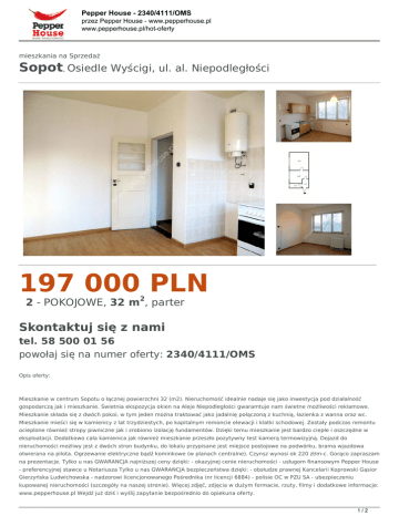 Pepper House - 2340/4111/OMS przez Pepper House - www.pepperhouse.pl www.pepperhouse.pl/hot-oferty mieszkania na Sprzedaż Sopot, Osiedle Wyścigi, ul. al. Niepodległości 197 000 PLN 2 - POKOJOWE, 32 m2, parter Skontaktuj się z nami tel. 58 500 01 56 powołaj się na numer oferty: 2340/4111/OMS Opis oferty: Mieszkanie w centrum Sopotu o łącznej powierzchni 32 (m2). Nieruchomość idealnie nadaje się jako inwestycja pod działalność gospodarczą jak i mieszkanie. Świetnia ekspozycja okien na Aleje Niepodległości gwaramtuje nam świetne możliwości reklamowe. Mieszkanie składa się z dwóch pokoi, w tym jeden można traktować jako jadalnię połączoną z kuchnią, łazienka z wanna oraz wc. Mieszkanie mieści się w kamienicy z lat trzydziestych, po kapitalnym remoncie elewacji i klatki schodowej. Zostały podczas remontu ocieplone również stropy piwniczne jak i zrobiono izolację fundamentów. Dzięki temu mieszkanie jest bardzo ciepłe i oszczędne w eksploatacji. Dodatkowo cała kamienica jak również mieszkanie przeszło pozytywny test kamerą termowizyjną. Dojazd do nieruchomości możliwy jest z dwóch stron budynku, do lokalu przypisane jest miejsce postojowe na podwórku, brama wjazdowa otwierana na pilota. Ogrzewanie elektryczne bądź kominkowe (w planach centralne). Czynsz wynosi ok 220 zł/m-c. Gorąco zapraszam na prezentacje. Tylko u nas GWARANCJA najniższej ceny dzięki: - okazyjnej cenie nieruchomości - usługom finansowym Pepper House - preferencyjnej stawce u Notariusza Tylko u nas GWARANCJA bezpieczeństwa dzięki: - obsłudze prawnej Kancelarii Koprowski Gąsior Gierzyńska Ludwichowska - nadzorowi licencjonowanego Pośrednika (nr licencji 6884) - polisie OC w PZU SA - ubezpieczeniu kupowanej nieruchomości (szczegóły na naszej stronie). Więcej zdjęć, zdjęcia w dużym formacie, rzuty, filmy i dodatkowe informacje: www.pepperhouse.pl Wejdź już dziś i wyślij zapytanie bezpośrednio do opiekuna oferty. 1/2 Pepper House - 2340/4111/OMS przez Pepper House - www.pepperhouse.pl www.pepperhouse.pl/hot-oferty 2/2 Powered by TCPDF (www.tcpdf.org)