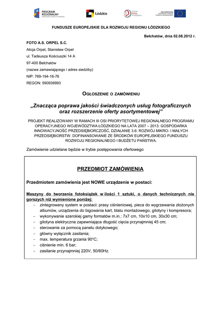 FUNDUSZE EUROPEJSKIE DLA ROZWOJU REGIONU ŁÓDZKIEGO Bełchatów, dnia 02.08.2012 r. FOTO A.S. ORPEL S.C. Alicja Orpel, Stanisław Orpel ul. Tadeusza Kościuszki 14 A 97-400 Bełchatów (nazwa zamawiającego i adres siedziby) NIP: 769-194-16-76 REGON: 590939993 OGŁOSZENIE O ZAMÓWIENIU „Znacząca poprawa jakości świadczonych usług fotograficznych oraz rozszerzenie oferty asortymentowej” PROJEKT REALIZOWANY W RAMACH III OSI PRIORYTETOWEJ REGIONALNEGO PROGRAMU OPERACYJNEGO WOJEWÓDZTWA ŁÓDZKIEGO NA LATA 2007 – 2013: GOSPODARKA INNOWACYJNOŚĆ PRZEDSIĘBIORCZOŚĆ, DZIAŁANIE 3.6: ROZWÓJ MIKRO- I MAŁYCH PRZEDSIĘBIORSTW. DOFINANSOWANIE ZE ŚRODKÓW EUROPEJSKIEGO FUNDUSZU ROZWOJU REGIONALNEGO I BUDŻETU PAŃSTWA. Zamówienie udzielane będzie w trybie postępowania ofertowego PRZEDMIOT ZAMÓWIENIA Przedmiotem zamówienia jest NOWE urządzenie w postaci: Maszyny do tworzenia fotoksiążek w ilości 1 sztuki, o danych technicznych nie gorszych niż wymienione poniżej: zintegrowany system w postaci: prasy ciśnieniowej, pieca do wygrzewania złożonych albumów, urządzenia do bigowania kart, blatu montażowego, gilotyny i kompresora; wykonywanie szerokiej gamy formatów m.in.: 7x7 cm, 10x10 cm, 30x30 cm; gilotyna elektryczna zapewniająca długość cięcia przynajmniej 45 cm; sterowanie za pomocą panelu dotykowego; główny wyłącznik zasilania; max. temperatura grzania 90oC; ciśnienie min. 6 bar; zasilanie przynajmniej 220V, 50/60Hz. FUNDUSZE EUROPEJSKIE DLA ROZWOJU REGIONU ŁÓDZKIEGO Prosimy o przedstawienie ceny oferty w postaci tabeli: Lp Przedmiot zamówienia Jednostka miary Ilość 1 Maszyna do tworzenia fotoksiążek szt. 1 Razem n/d n/d n/d Cena jednostkowa netto Wartość netto n/d Stawka VAT (%) Wartość VAT Wartość brutto n/d Opis kryteriów, którymi firma będzie się kierowała przy wyborze oferty oraz znaczenie tych kryteriów Maksymalna liczba punktów możliwych do uzyskania – 100 Lp. Rodzaj Kryterium Punktacja 1 Cena Od 0 do 70 2 Gwarancja (w miesiącach) Od 0 do 20 3 Czas reakcji serwisowej (w dniach roboczych) Od 0 do 10 Sposób oceny Oferent proponujący najniższą cenę otrzyma maksymalną liczbę punktów tj. 70. Kolejnym oferentom będą przyznawane punkty w następujący sposób: Liczba punktów badanej oferty = stosunek ceny w ofercie z najniższą ceną do ceny badanej oferty mnożony przez 70. Oferent proponujący najdłuższy okres gwarancji otrzyma maksymalną liczbę punktów tj. 20. Kolejnym oferentom będą przyznawane punkty w następujący sposób: Liczba punktów badanej oferty = stosunek okresu gwarancji w badanej ofercie do okresu gwarancji w ofercie z najdłuższą gwarancją mnożony przez 20. Oferent proponujący najkrótszy czas reakcji serwisowej otrzyma maksymalną liczbę punktów tj. 10. Kolejnym oferentom będą przyznawane punkty w następujący sposób: Liczba punktów badanej oferty = stosunek czasu reakcji serwisowej z oferty proponującej najkrótszy czas reakcji serwisowej do czasu reakcji serwisowej badanej oferty mnożony przez 10. OPIS WARUNKÓW UDZIAŁU W POSTĘPOWANIU OFERTOWYM Celem zapewnienia możliwości porównania ofert, prosimy by przesłana przez Państwa oferta zawierała Państwa dane kontaktowe. FUNDUSZE EUROPEJSKIE DLA ROZWOJU REGIONU ŁÓDZKIEGO Ponadto, prosimy o podanie terminu dostawy przedmiotu zamówienia, czasu udzielonej gwarancji, jak również czasu reakcji serwisowej. Oferty powinny zawierać datę wystawienia i datę obowiązywania (lub termin związania ofertą). Oferty powinny być podpisane i opatrzone pieczątką firmową. Każda strona oferty powinna być parafowana. Termin wykonania zamówienia: zamówienie powinno być zrealizowane – dostawa przedmiotu zamówienia do siedziby zamawiającego – najpóźniej do dnia 30.09.2012 r. Ostateczny termin składania ofert: ostateczny termin składania ofert upływa w dniu 17.08.2012 r., o godzinie 15:00 Oferty wraz ze szczegółową specyfikacją należy składać osobiście lub listownie na adres: FOTO A.S. ORPEL S.C. Alicja Orpel, Stanisław Orpel ul. Tadeusza Kościuszki 14 A 97-400 Bełchatów Oferty składane listownie lub osobiście prosimy umieścić w dwóch zaklejonych kopertach, z adnotacją na wewnętrznej kopercie „Otworzyć dnia 17.08.2012 r. ” Data i miejsce otwarcia ofert: ul. Tadeusza Kościuszki 14A, 97-400 Bełchatów, 17.08.2012, godz. 16:00 Osoba do kontaktu w ramach zamówienia: Stanisław Orpel tel. +48 44 632 90 26, e-mail: [email protected], W przypadku podania wartości ofert w walucie obcej, wartość zamówienia będzie przeliczana na złotówki według średniego kursu NBP z dnia otwarcia ofert. Poprzez złożenie oferty Oferent wyraża zgodę na podanie do wiadomości pozostałych Oferentów szczegółów oferty. Oferent ma prawo nie wyrazić zgody na podanie do wiadomości szczegółów technicznych przedmiotu zamówienia. FUNDUSZE EUROPEJSKIE DLA ROZWOJU REGIONU ŁÓDZKIEGO Beneficjent zastrzega sobie prawo do zmiany warunków udzielenia zamówienia oraz do unieważnienia postępowania. Oferty muszą zawierać datę wystawienia i datę obowiązywania (lub termin związania ofertą). Oferty muszą być podpisane i opatrzone pieczątką firmowa