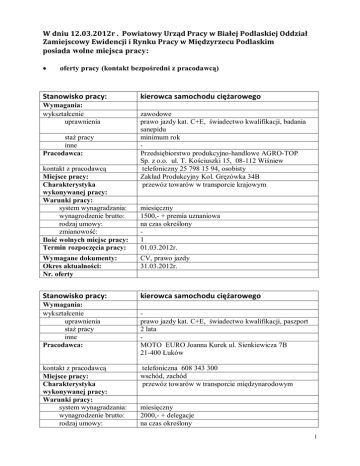 W dniu 12.03.2012r . Powiatowy Urząd Pracy w Białej Podlaskiej Oddział Zamiejscowy Ewidencji i Rynku Pracy w Międzyrzecu Podlaskim posiada wolne miejsca pracy: oferty pracy (kontakt bezpośredni z pracodawcą) Stanowisko pracy: Wymagania: wykształcenie uprawnienia staż pracy inne Pracodawca: kontakt z pracodawcą Miejsce pracy: Charakterystyka wykonywanej pracy: Warunki pracy: system wynagradzania: wynagrodzenie brutto: rodzaj umowy: zmianowość: Ilość wolnych miejsc pracy: Termin rozpoczęcia pracy: kierowca samochodu ciężarowego zawodowe prawo jazdy kat. C+E, świadectwo kwalifikacji, badania sanepidu minimum rok Przedsiębiorstwo produkcyjno-handlowe AGRO-TOP Sp. z o.o. ul. T. Kościuszki 15, 08-112 Wiśniew telefoniczny 25 798 15 94, osobisty Zakład Produkcyjny Kol. Gręzówka 34B przewóz towarów w transporcie krajowym miesięczny 1500,- + premia uznaniowa na czas określony 1 01.03.2012r. Wymagane dokumenty: Okres aktualności: Nr. oferty CV, prawo jazdy 31.03.2012r. Stanowisko pracy: kierowca samochodu ciężarowego Wymagania: wykształcenie uprawnienia staż pracy inne Pracodawca: kontakt z pracodawcą Miejsce pracy: Charakterystyka wykonywanej pracy: Warunki pracy: system wynagradzania: wynagrodzenie brutto: rodzaj umowy: prawo jazdy kat. C+E, świadectwo kwalifikacji, paszport 2 lata MOTO EURO Joanna Kurek ul. Sienkiewicza 7B 21-400 Łuków telefoniczna 608 343 300 wschód, zachód przewóz towarów w transporcie międzynarodowym miesięczny 2000,- + delegacje na czas określony 1 zmianowość: Ilość wolnych miejsc pracy: Termin rozpoczęcia pracy: ruch ciągły 2 od zaraz Wymagane dokumenty: Okres aktualności: Nr. oferty cv 25.03.2012r. Stanowisko pracy: kierowca samochodu ciężarowego Wymagania: wykształcenie uprawnienia staż pracy inne Pracodawca: prawo jazdy kat.C+E, świadectwo kwalifikacji mile widziany MP – TRANS Puchacz Mariusz ul. Filaretów 19 21-400 Łuków kontakt z pracodawcą Miejsce pracy: Charakterystyka wykonywanej pracy: Warunki pracy: system wynagradzania: wynagrodzenie brutto: rodzaj umowy: zmianowość: Ilość wolnych miejsc pracy: Termin rozpoczęcia pracy: telefoniczna 798-89-98 wschód, zachód przewóz towarów w transporcie międzynarodowym Wymagane dokumenty: Okres aktualności: Nr. oferty cv 22.03.2012r. Stanowisko pracy: kierowca autobusu Wymagania: wykształcenie uprawnienia staż pracy inne Pracodawca: kontakt z pracodawcą Miejsce pracy: Charakterystyka wykonywanej pracy: Warunki pracy: system wynagradzania: wynagrodzenie brutto: miesięczny 1.500,na czas określony ruch ciągły 2 01.03.2012r. prawo jazdy kat. D , świadectwo kwalifikacji mile widziany osoba kontaktowa PHU WERSPOL Wąsiewicz Stanisław Gołaszyn 15A 21-400 Łuków telefoniczna 697 088 360 kraj przewóz osób na terenie kraju miesięczny 1.500,2 rodzaj umowy: zmianowość: Ilość wolnych miejsc pracy: Termin rozpoczęcia pracy: na czas określony wg grafiku 3 01.03.2012r. Wymagane dokumenty: Okres aktualności: Nr. oferty cv 26.03.2012r. Stanowisko pracy: kierowca samochodu ciężarowego Wymagania: wykształcenie uprawnienia staż pracy inne Pracodawca: kontakt z pracodawcą Miejsce pracy: Charakterystyka wykonywanej pracy: Warunki pracy: system wynagradzania: wynagrodzenie brutto: rodzaj umowy: zmianowość: Ilość wolnych miejsc pracy: Termin rozpoczęcia pracy: zawodowe prawo jazdy kat. C + E, świadectwo kwalifikacji mile widziany Firma Transportowo-Handlowa LT-TRANS Leszek Turski Dębowica 67 21-404 Trzebieszów telefoniczna 25 7960793, 606 405 366 Dębowica 67 przewóz osób towarów w transporcie międzynarodowym po krajach UE miesięczny 1.600,na czas określony ruch ciągły 1 05.03.2012r. Wymagane dokumenty: Okres aktualności: Nr. oferty cv 31.03.2012r. Stanowisko pracy: elektromechanik pojazdów samochodowych Wymagania: wykształcenie uprawnienia staż pracy inne Pracodawca: kontakt z pracodawcą Miejsce pracy: Charakterystyka wykonywanej pracy: Warunki pracy: system wynagradzania: wynagrodzenie brutto: zawodowe elektromechaniczne prawo jazdy kat.B mile widziany obsługa komputera, programów serwisowych PPH AGRO – TOP Kol. Gręzówka 34B 21-400 Łuków osobista, telefoniczna 25 798 15 94 w.120 Kol. Gręzówka naprawa samochodów ciężarowych miesięczny 1500,- + premia 3 rodzaj umowy: zmianowość: Ilość wolnych miejsc pracy: Termin rozpoczęcia pracy: na czas określony dwie zmiany 1 01.03.2012r. Wymagane dokumenty: Okres aktualności: Nr. oferty cv 27.03.2012r. Stanowisko pracy: kierowca samochodu ciężarowego Wymagania: wykształcenie uprawnienia staż pracy inne Pracodawca: prawo jazdy kat. C+E, świadectwo kwalifikacji, psychotesty mile widziany SZAR-TRANS Łukasik Patryk ul. Kruczkowskiego 27 21-400 Łuków kontakt z pracodawcą Miejsce pracy: Charakterystyka wykonywanej pracy: Warunki pracy: system wynagradzania: wynagrodzenie brutto: rodzaj umowy: zmianowość: Ilość wolnych miejsc pracy: Termin rozpoczęcia pracy: osobista, telefoniczna 600 043 390 wschód, zachód przewóz towarów w transporcie międzynarodowym Wymagane dokumenty: Okres aktualności: Nr. oferty cv 27.03.2012r. Stanowisko pracy: elektryk Wymagania: wykształcenie uprawnienia staż pracy inne Pracodawca: kontakt z pracodawcą Miejsce pracy: Charakterystyka wykonywanej pracy: Warunki pracy: zawodowe mile widziany Zakład Mięsny „Wierzejki”J.M. Zdanowscy osobisty w godz. 7,00- 16,00 Płudy 21, 21-404 Trzebieszów naprawa maszyn i urządzeń znajdujących się w działach produkcyjnych miesięczny i od przejechanych kilometrów ok.5000,na czas określony ruch ciągły 1 01.03.2012r. 4 system wynagradzania: wynagrodzenie brutto: rodzaj umowy: zmianowość: Ilość wolnych miejsc pracy: Termin rozpoczęcia pracy: miesięczny 1500,na okres określony dwie zmiany 2 01.03.2012r. Wymagane dokumenty: Okres aktualności: cv 15.03.2012r Stanowisko pracy: strażnik Wymagania: wykształcenie uprawnienia staż pracy inne Pracodawca: kontakt z pracodawcą Miejsce pracy: 