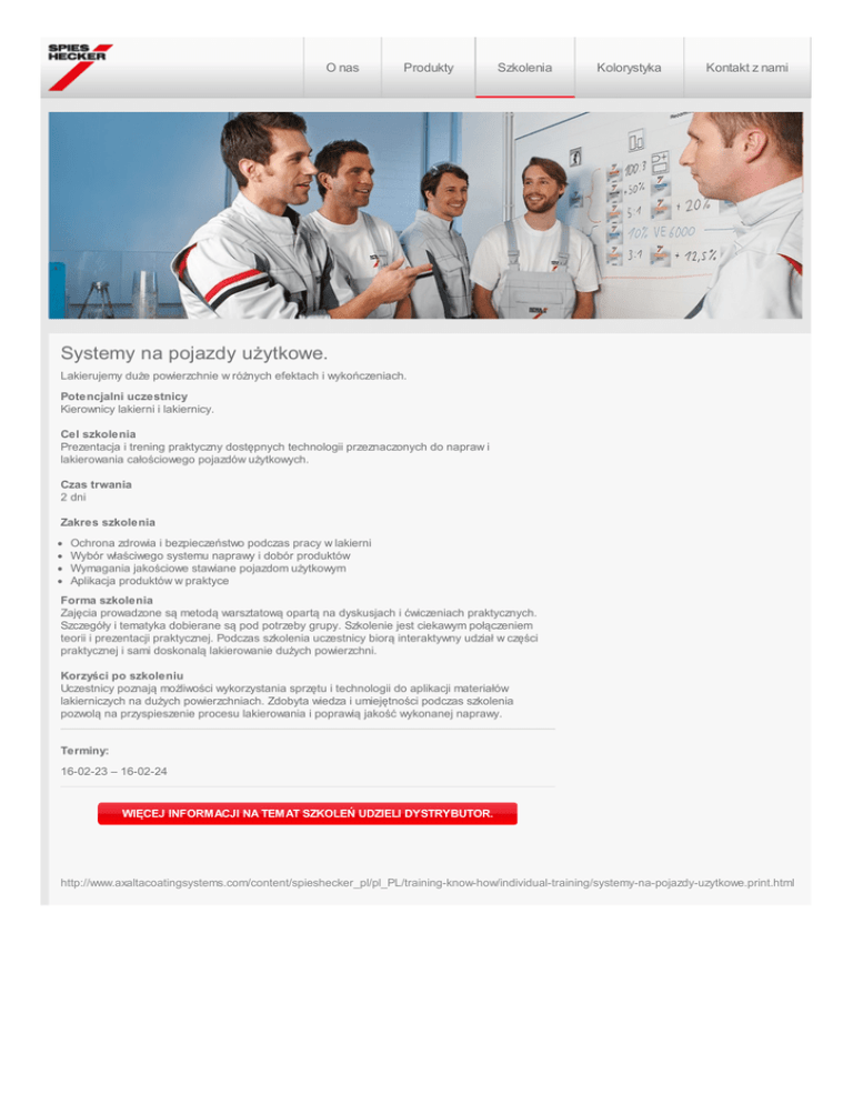 O nas Produkty Szkolenia Kolorystyka Kontakt z nami Systemy na pojazdy użytkowe. Lakierujemy duże powierzchnie w różnych efektach i wykończeniach. Potencjalni uczestnicy Kierownicy lakierni i lakiernicy. Cel szkolenia Prezentacja i trening praktyczny dostępnych technologii przeznaczonych do napraw i lakierowania całościowego pojazdów użytkowych. Czas trwania 2 dni Zakres szkolenia Ochrona zdrowia i bezpieczeństwo podczas pracy w lakierni Wybór właściwego systemu naprawy i dobór produktów Wymagania jakościowe stawiane pojazdom użytkowym Aplikacja produktów w praktyce Forma szkolenia Zajęcia prowadzone są metodą warsztatową opartą na dyskusjach i ćwiczeniach praktycznych. Szczegóły i tematyka dobierane są pod potrzeby grupy. Szkolenie jest ciekawym połączeniem teorii i prezentacji praktycznej. Podczas szkolenia uczestnicy biorą interaktywny udział w części praktycznej i sami doskonalą lakierowanie dużych powierzchni. Korzyści po szkoleniu Uczestnicy poznają możliwości wykorzystania sprzętu i technologii do aplikacji materiałów lakierniczych na dużych powierzchniach. Zdobyta wiedza i umiejętności podczas szkolenia pozwolą na przyspieszenie procesu lakierowania i poprawią jakość wykonanej naprawy. Terminy: 16-02-23 – 16-02-24 WIĘCEJ INFORMACJI NA TEMAT SZKOLEŃ UDZIELI DYSTRYBUTOR. http://www.axaltacoatingsystems.com/content/spieshecker_pl/pl_PL/training-know-how/individual-training/systemy-na-pojazdy-uzytkowe.print.html