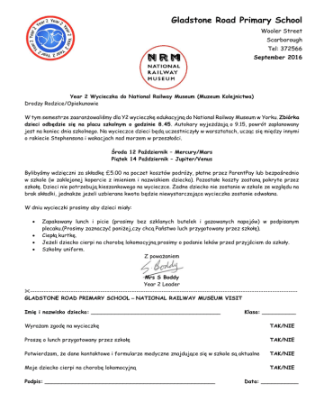 Gladstone Road Primary School Wooler Street Scarborough Tel: 372566 September 2016 Year 2 Wycieczka do National Railway Museum (Muzeum Kolejnictwa) Drodzy Rodzice/Opiekunowie W tym semestrze zaaranżowaliśmy dla Y2 wycieczkę edukacyjną do National Railway Museum w Yorku. Zbiórka dzieci odbędzie się na placu szkolnym o godzinie 8.45. Autokary wyjeżdżają o 9.15, powrót zaplanowany jest na koniec dnia szkolnego. Na wycieczce dzieci będą uczestniczyły w warsztatach, ucząc się między innymi o rakiecie Stephensona i wakacjach nad morzem w przeszłości. Środa 12 Październik – Mercury/Mars Piątek 14 Październik – Jupiter/Venus Bylibyśmy wdzięczni za składkę £5.00 na poczet kosztów podróży, płatne przez ParentPay lub bezpośrednio w szkole (w zaklejonej kopercie z imieniem i nazwiskiem dziecka). Pozostałe koszty zostaną pokryte przez szkołę. Dzieci nie potrzebują kieszonkowego na wycieczce. Żadne dziecko nie zostanie w szkole ze względu na brak składki, jednakże jeżeli uzbierana kwota będzie niewystarczająca wycieczka zostanie odwołana. W dniu wycieczki prosimy aby dzieci miały: Zapakowany lunch i picie (prosimy bez szklanych butelek i gazowanych napojów) w podpisanym plecaku.(Prosimy zaznaczyć poniżej,czy chcą Państwo luch przygotowany przez szkołę). Ciepłą kurtkę. Jeżeli dziecko cierpi na chorobę lokomocyjną prosimy o podanie leków przed przyjściem do szkoły. Szkolny uniform. Z poważaniem Mrs S Boddy Year 2 Leader ---------------------------------------------------------------------------------------------------------------------GLADSTONE ROAD PRIMARY SCHOOL – NATIONAL RAILWAY MUSEUM VISIT Imię i nazwisko dziecka: ______________________________________ Klasa: __________ Wyrażam zgodę na wycieczkę TAK/NIE Proszę o lunch przygotowany przez szkołę TAK/NIE Potwierdzam, że dane kontaktowe i formularze medyczne znajdujące się w szkole są aktualne TAK/NIE Moje dziecko cierpi na chorobę lokomocyjną TAK/NIE Podpis: __________________________________________________ Data: ___________