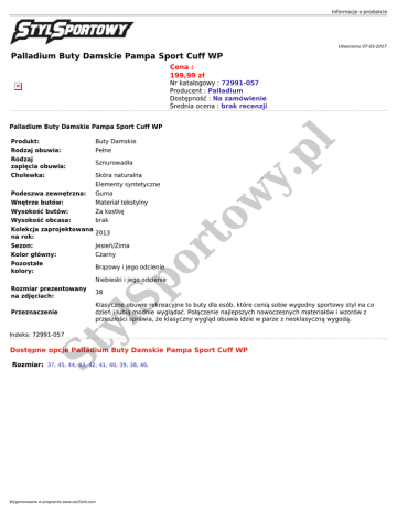 Informacje o produkcie Utworzono 07-03-2017 Palladium Buty Damskie Pampa Sport Cuff WP Cena : 199,99 zł Nr katalogowy : 72991-057 Producent : Palladium Dostępność : Na zamówienie Średnia ocena : brak recenzji Buty Damskie Rodzaj obuwia: Pełne Rodzaj zapięcia obuwia: Sznurowadła Cholewka: Skóra naturalna Elementy syntetyczne Guma Wnętrze butów: Materiał tekstylny Wysokość butów: Za kostkę Wysokość obcasa: brak Kolekcja zaprojektowana 2013 na rok: or to w Podeszwa zewnętrzna: y. Produkt: pl Palladium Buty Damskie Pampa Sport Cuff WP Sezon: Jesień/Zima Kolor główny: Czarny Pozostałe kolory: Brązowy i jego odcienie Rozmiar prezentowany na zdjęciach: 38 Klasyczne obuwie rekreacyjne to buty dla osób, które cenią sobie wygodny sportowy styl na co dzień i lubią modnie wyglądać. Połączenie najlepszych nowoczesnych materiałów i wzorów z przeszłości sprawia, że klasyczny wygląd obuwia idzie w parze z neoklasyczną wygodą. St y Przeznaczenie lS p Niebieski i jego odcienie Indeks: 72991-057 Dostępne opcje Palladium Buty Damskie Pampa Sport Cuff WP Rozmiar: 37, 45, 44, 43, 42, 41, 40, 39, 38, 46. Wygenerowano w programie www.oscGold.com