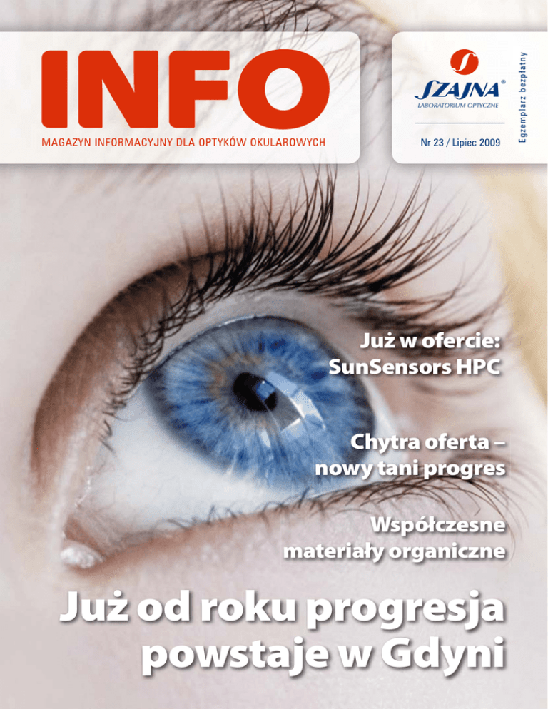 Nr 23 / Lipiec 2009 Już w ofercie: SunSensors HPC Chytra oferta – nowy tani progres Współczesne materiały organiczne Już od roku progresja powstaje w Gdyni Egzemplarz bezpłatny MAGAZYN INFORMACYJNY DLA OPTYKÓW OKULAROWYCH MAGAZYN INFORMACYJNY DLA OPTYKÓW OKULAROWYCH Nr 23 / Lipiec 2009 Egzemplarz bezpłatny lipiec 2009 Szanowni Klienci, Drodzy Czytelnicy, Oferta produktów z logo SZAJNA jest niewątpliwie najszybciej rozwijającą się w Polsce. Dynamika rozwoju naszej firmy, połączona z wysoką jakością oraz niezwykle konkurencyjnymi cenami, jest z pewnością zaskoczeniem dla wielu osób. Gdy inni ograniczają ofertę oraz Już w ofercie: SunSensors HPC Chytra oferta – nowy tani progres Współczesne materiały organiczne Już od roku progresja powstaje w Gdyni podnoszą ceny my oferujemy naszym Klientom coraz to nowsze możliwości technologiczne i jeszcze doskonalsze produkty. Minął już rok od kiedy, jako pierwsze laboratorium optyczne w Polsce, rozpoczęliśmy produkcję soczewek progresywnych w technologii FreeForm. Ciągle rozwijana grupa soczewek VEO zyskała w tym okresie nie tylko kilka nowych wersji materiałowych (ostatnią nowością są VEO 1.60 SunSensors HPC oraz VEO 1.67 SunSensors HPC), lecz również nowe decentrowane konstrukcje. Skupiamy się jednak nie tylko na najbardziej wyszukanych produktach, lecz rozwijamy ofertę na wszystkich jej płaszczyznach. Z tego też względu zachęcamy do NR 23 / LIPIEC 2009 INFO Magazyn Informacyjny dla Optyków Okularowych Redaktor wydania: Michał Szajna Zespół redakcyjny: Wojciech Czyż Diana Mazurowska Agnieszka Neumann Magdalena Onoszko Marcin Rakoczy Michał Szajna wypróbowania naszej nowej soczewki progresywnej FOX. Ta nowoczesna konstrukcja kierowana jest do osób szukających markowych soczewek progresywnych w atrakcyjnej cenie i stanowi niezwykle mocny argument w rękach każdego Optyka, by przekonać użytkownika szkieł bifokalnych do wyboru pierwszych w jego życiu progresów. Tempa pracy nie zwalniamy również latem. Każda para soczewek recepturowych wykonywana jest w niedłużej niż 72h, a przypadku progresywnych VEO to tylko 48h. To chyba kolejny dobry argumenty by spędzić te wakacje z nami. Z poważaniem Michał Szajna DZIAŁ MARKETINGU Nowości Wydawca: SZAJNA Laboratorium Optyczne Adres redakcji: SZAJNA laboratorium Optyczne ul. Długa 1A, 81-622 Gdynia tel. (058) 624 77 47 fax (058) 624 77 40 [email protected] Skład i druk: Drukarnia Siódemka www.drukarniasiodemka.eu str. 5 str. 6 str. 7 Oferta str. 8 str. 10 str. 11 str. 12 str. 13 Technologia Z życia firmy Wszystkie prawa zastrzeżone. str. 4 str. 14 str. 16 str. 18 Zmienione nazwy produktów Skrócony cennik soczewek SZAJNA Chytra oferta – nowy tani progres Nowa soczewka dwuogniskowa FT-25 Zmieniony certyfikat Transitions VI Dłużej pakujemy. Teraz do 16.30! Akcesoria na lato Cennik elektroniczny Najkrótsze czasy realizacji w Polsce Nowość: SunSensors HPC Nowa wersja VEO z decentracją Od roku progresja powstaje w Gdyni Ruszył program profesjonalista VEO VEO SunSensors HPC Balans dla oka niewidzącego Zmieniona książeczka VEO Baw się kolorami z naszymi SOLAR’ami Dwuogniskowe soczewki fotochromowe Optymalizacja soczewek recepturowych Materiały organiczne (część 1) Teczka, fura i komóra. Jesteś zainteresowany? Bądź ekologiczny razem z nami Zapisz się do newslettera i bądź zawsze na bieżąco Nowości Zmienione nazwy produktów Na bieżąco rozwijamy istniejące produkty, modyfikując je zarówno w przestrzeni technologicznej jak i marketingowej. Część z naszych Klientów zdążyła już zauważyć, iż kilka tygodni temu na opakowaniach soczewek pojawiły się nowe nazwy produktów. D o dobrze znanych grup PROFIT („ekonomiczne” organiczne soczewki magazynowe), PRIMA (organiczne soczewki magazynowe o podwyższonym standardzie) oraz VEO (organiczne soczewki progresywne w technologii FreeForm) dołączyły 3 nowe kategorie produktów (PRIMAGLAS, OPTIPLAST, OPTIGLAS). Pod nazwą PRIMAGLAS kryją się bardzo popularne magazynowe soczewki mineralne o podwyższonym standardzie (bezbarwne i fotochromowe). Największe zmiany objęły nazewnictwo soczewek recepturowych. Dokonaliśmy tu podziału na dwie duże kategorie – OPTIPLAST (organiczne Rx) oraz OPTIGLAS (mineralne Rx). Nazwy poszczególnych konstrukcji i materiałów (np. Koliber, Omega RECEPTUROWE (Rx) MAGAZYNOWE (m) RODZAJ SOCZEWEK NAZWA HANDLOWA GRUPY SOCZEWEK EKONOMICZNE ORGANICZNE PROFIT ORGANICZNE O PODWYŻSZONYM STANDARDZIE PRIMA MINERALNE O PODWYŻSZONYM STANDARDZIE PRIMAGLAS ORGANICZNE OPTIPLAST MINERALNE OPTIGLAS PROGRESYWNE TECHNOLOGIA FreeForm czy Transitions) nie uległy żadnym zmianom i są po prostu jednym z elementów nowego nazewnictwa (np. OPTIPLAST 1.50 Koliber). Jednym z głównych celów zmian było widoczne oddzielenie soczewek magazynowych (PROFIT, PRIMA, PRIMAGLAS) od soczewek recepturowych (OPTIPLAST, OPTIGLAS oraz VEO). Biorąc do ręki opakowanie naszych soczewek czy też cennik od razu widzimy z jakimi soczewkami mamy do czynienia. W znaczący sposób powinno podnieść to komfort pracy wszystkich Klientów. Dodatkowo nasza oferta zyskała niepowtarzalną przejrzystość, którą na żywo sprawdzić można w nowym Cenniku Soczewek SZAJNA. BEZBARWNE FOTOCHROMOWE POLARYZACYJNE VEO (FreeForm) Skrócony cennik soczewek SZAJNA D ostępny jest już nowy cennik soczewek SZAJNA. Prezentuje on w skrócony sposób przekrój naszej oferty i stanowi uzupełnienie obowiązującego Katalogu. Co niezwykle ważne, zawarte w nim ceny pozostają na niezmienionym, bardzo atrakcyjnym poziomie. Cennik przygotowany został z myślą o właścicielach oraz osobach zarządzających salonami optycznymi, dla których stanowi on źródło informacji o cenach zakupu netto soczewek. Uwzględnione zostały w nim również zmienione nazwy produktów oraz nowości, które trafiają właśnie do oferty, a o których szerzej piszemy w tym numerze INFO. Nowy ce