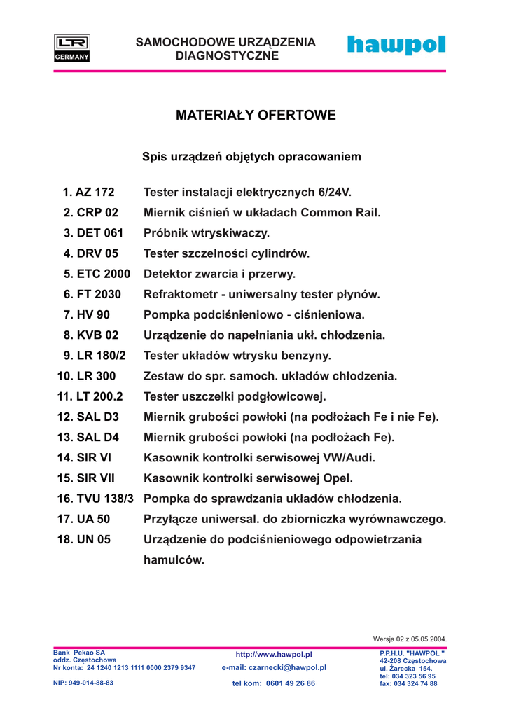 SAMOCHODOWE URZ¥DZENIA DIAGNOSTYCZNE MATERIA£Y OFERTOWE Spis urz¹dzeñ objêtych opracowaniem 1. AZ 172 Tester instalacji elektrycznych 6/24V. 2. CRP 02 Miernik ciœnieñ w uk³adach Common Rail. 3. DET 061 Próbnik wtryskiwaczy. 4. DRV 05 Tester szczelnoœci cylindrów. 5. ETC 2000 Detektor zwarcia i przerwy. 6. FT 2030 Refraktometr - uniwersalny tester p³ynów. 7. HV 90 Pompka podciœnieniowo - ciœnieniowa. 8. KVB 02 Urz¹dzenie do nape³niania uk³. ch³odzenia. 9. LR 180/2 Tester uk³adów wtrysku benzyny. 10. LR 300 Zestaw do spr. samoch. uk³adów ch³odzenia. 11. LT 200.2 Tester uszczelki podg³owicowej. 12. SAL D3 Miernik gruboœci pow³oki (na pod³o¿ach Fe i nie Fe). 13. SAL D4 Miernik gruboœci pow³oki (na pod³o¿ach Fe). 14. SIR VI Kasownik kontrolki serwisowej VW/Audi. 15. SIR VII Kasownik kontrolki serwisowej Opel. 16. TVU 138/3 Pompka do sprawdzania uk³adów ch³odzenia. 17. UA 50 Przy³¹cze uniwersal. do zbiorniczka wyrównawczego. 18. UN 05 Urz¹dzenie do podciœnieniowego odpowietrzania hamulców. Wersja 02 z 05.05.2004. Bank Pekao SA oddz. Czêstochowa Nr konta: 24 1240 1213 1111 0000 2379 9347 NIP: 949-014-88-83 http://www.hawpol.pl e-mail: [email protected] tel kom: 0601 49 26 86 P.P.H.U. "HAWPOL " 42-208 Czêstochowa ul. ¯arecka 154. tel: 034 323 56 95 fax: 034 324 74 88 Tester instalacji elektrycznej AZ 172 (Power Probe). Producent - Leitenberger Autotestgeräte GmbH (RFN). Tester AZ 172 pozwala szybko diagnozowaæ samochodowe instalacje elektryczne pracuj¹ce przy napiêciach od 6V do 24V. Prze³¹cznik g³ówny Dwukolorowa dioda LED Grot Bezpiecznik automatyczny Przed przyst¹pieniem do pracy nale¿y pod³¹czyæ urz¹dzenie do zacisków akumulatora badanego pojazdu. Nastêpnie dotykaj¹c grotem AZ 172 do dowolnego punktu instalacji mo¿emy natychmiast w sposób pewny okreœliæ jego polaryzacjê. Sygnalizowane jest to przez diodê LED œwiec¹c¹ na czerwono (zasilanie +) lub zielono (masa -). Prze³¹cznik g³ówny urz¹dzenia pozwala podaæ w razie potrzeby zasilanie plusowe lub minusowe na grot AZ 172, a tym samym sprawdziæ (uruchomiæ) wybrany podzespó³ elektryczny bez u¿ycia dodatkowych przewodów. Urz¹dzenie posiada w³asne zabezpieczenie przed zwarciem, które pozwala równie¿ w bardzo prosty sposób na wykrywanie "s³abej masy" lub zwarcia w instalacji. Wykorzystuj¹c dodatkowy przewód masowy AZ172 (z krokodylkiem) mo¿na te¿ sprawdzaæ ci¹g³oœæ po³¹czenia. AZ 172 D³ugi przewód zasilaj¹cy (6 m) daje mo¿liwoœæ testowania ca³ej instalacji elektrycznej bez ci¹g³ego szukania nastêpnych pewnych punktów masy. Stabilna plastikowa obudowa zapewnia d³ug¹ ¿ywotnoœæ urz¹dzenia. Do testera do³¹czona jest instrukcja w jêzyku polskim wyczerpuj¹co opisuj¹ca poszczególne przypadki zastosowañ. Miernik ciœnienia w uk³adach Common Rail CRP 02. Producent - Leitenberger Autotestgeräte GmbH (RFN). Silniki nowej generacji z zasobnikowym systemem wtryskowym (Common Rail) pracuj¹ przy ciœnieniu systemowym miêdzy 1000 i 1200 bar. Aby w tych warunkach umo¿liwiæ sprawdzenie ciœnienia i szczelnoœci skonstruowano elektroniczne urz¹dzenie CRP 02.1. Tester ³¹czony jest bezpoœrednio do sensora Common Rail przy pomocy specjalnych adapterów. Wartoœæ wystêpuj¹cego ciœnienia odczytujemy na wyœwietlaczu LED. W³aœciwoœci: - mo¿liwoœæ po³¹czenia ze wszystkimi sensorami przy pomocy do³¹czonych adapterów - zakres pomiarowy 0..1500 bar - rozdzielczoœæ pomiarowa 10 bar - sygnalizacja wyst¹pienia b³êdu (czerwona LED n.p. przy braku przejœcia lub zwarciu) Parametry techniczne: - zasilanie bateria : 9V - d³ugoœæ przewodu (bez adapteru) : 1,2 m - wymiary obudowy : 78 x 149 x 30 mm - waga : 300 g - wyœwietlacz LCD, wysokoœæ cyfr 12 mm CRP 02.1 Zawartoœæ dostawy: Urz¹dzenie podstawowe CRP 02 Adapter CRPA 01 samochody Mercedes Adapter CRPA 02 samochody BMW (uniwersalny) Adapter CRPA 03 samochody francuskie i w³oskie Opakowanie - stabilna walizka z tworzywa sztucznego Próbnik wtryskiwaczy DET 061. Producent - Leitenberger Autotestgeräte GmbH (RFN). Próbnik DET 061 pozwala na sprawdzenie nastêpuj¹cych w³aœciwoœci wtryskiwaczy do silników wysokoprê¿nych: n Ciœnienie otwarcia wtryskiwacza n Formê wtryskiwanego paliwa n Rozpylenie paliwa n Szczelnoœæ wtryskiwacza n Sposób - "chrapania" wtryskiwacza Precyzyjny manometr urz¹dzenia wyposa¿ony jest w dodatkow¹ wskazówkê "wleczon¹", która zatrzymuje siê przy otwarciu wtryskiwacza i pozwala odczytaæ wartoœæ ciœnienia otwarcia ju¿ po zakoñczeniu próby (nie ma koniecznoœci jednoczesnego obserwowania formy rozpylanego paliwa i odczytywania wskazania wartoœci ciœnienia na manometrze). DET 061 Dodatkow¹ zalet¹ DET061 jest mo¿liwoœæ zmiany po³o¿enia dŸwigni wspó³pracuj¹cej 3 z pomp¹ (pojemnoœæ skokowa 35 cm ) dla u³atwienia obs³ugi urz¹dzenia. Próbnik dostarczany jest z przewodem stalowym i adapterem pozwalaj¹cymi na badanie wtryskiwaczy o gwintach M14x1,5 i M12x1,5. Parametry techniczne Œrednica manometru Zakres ciœnieñ Pojemnoœæ zasobnika Pojemnoœæ skokowa Ciê¿ar próbnika : f 100 mm : 0 - 400 bar 3 : 330 cm 3 : 25 cm : 5,5 kg Tester szczelnoœci cylindrów DRV 05. Producent - Leitenberger Autotestgeräte GmbH (RFN). Tester s³u¿y do lokalizacji strat ciœnienia w cylindrach silników benzynowych i wysokoprê¿nych. Przed wykonaniem testu nale¿y pod³¹czyæ urz¹dzenie do warsztatowej sieci sprê¿onego powietrza, w której ciœnienie zawiera siê w przedziale od 6 do 12 bar. Nastêpnie skalujemy tester DRV 05 na spadek ciœnienia w wysokoœci 23% wskazanie na granicy bia³ego i zielonego pola na precyzyjnym manometrze NG 80. Jeœli w czasie testu wskazówka manometru pokazuje powy¿ej 23% oznacza to, ¿e dopuszczalna utrala szczelnoœci cylindra zosta³a przekroczona. W takim przypadku nale¿y zlokalizowaæ i usun¹æ przyczynê. Wiêkszoœæ nieszczelnoœci mo¿na zlokalizowaæ os³uchuj¹c miejsca, gdzie wy