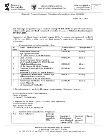 Gdańsk, 15.12.2016r. Dot. Przetargu nieograniczonego o wartości poniżej 209 000 EURO na prace konserwatorskorestauratorskie przy zabytkach ruchomych z kościoła św. Jana w Gdańsku: Kaplica Żeglarzy, ZP/NCK/1/2016. Na podstawie art. 92 ust. 2 ustawy z dnia 29 stycznia 2004 r. Prawo zamówień publicznych (t.j. Dz. U. z 2015r., poz. 2164, z późn. zm.), zw. dalej „ustawą”, zamawiający informuje o wynikach postępowania. 1. W postępowaniu wpłynęły następujące oferty: Nr Nazwa i adres wykonawcy oferty 1 Konserwator Dzieł Sztuki mgr Agnieszka Sikorska Ul. Grobla III 1/6, C/8, 80-840 Gdańsk 2 Okoń Leonarda Studio Artystyczno-Konserwatorskie Ul. Wojska Polskiego 8, 85-171 Bydgoszcz 3 Fiala Łukasz Zakarczemny Ul. Turystyczna 92, 80-680 Gdańsk 4 Pracownia Konserwacji Dzieł Sztuki M.M. Sieńkowscy Rotmanka, ul. Lipowa 12, 83-010 Straszyn 5 Dyplomowany Konserwator Zabytków mgr Sztuki Izabela Huk-Malinowska Ul. Borówkowa 9, 80-299 Nowy Świat 6 Konserwacje Dzieł Sztuki Prace Budowlane Danuta Majewska Ul. Dauna 23, 30-566 Kraków Cena oferty brutto (PLN) 118.000,00 Okres gwarancji 193.602,00 60 m-cy 180.810,00 60 m-cy 162.360,00 60 m-cy 168.936,81 60 m-cy 166.050,00 60 m-cy 60 m-cy 2. Na podstawie art. 24 ust. 1 pkt. 12 ustawy z postępowania wykluczono wykonawcę: Konserwacje Dzieł Sztuki Prace Budowlane Danuta Majewska Ul. Dauna 23, 30-566 Kraków 3. Na podstawie art. 90 ust. 3 ustawy odrzucono ofertę wykonawcy: Konserwator Dzieł Sztuki mgr Agnieszka Sikorska Ul. Grobla III 1/6, C/8, 80-840 Gdańsk 4. Poz. Pozostałe oferty sklasyfikowano następująco: Nazwa wykonawcy punktacja Kryterium 1 – cena oferty 50% Kryterium 2doświadczenie osoby kierującej pracami – 40% Kryterium 3- okres gwarancji 10% Razem: 1 2 3 4 Pracownia Konserwacji Dzieł Sztuki M.M. Sieńkowscy Okoń Leonarda Studio ArtystycznoKonserwatorskie Fiala Łukasz Zakarczemny Dyplomowany Konserwator Zabytków mgr Sztuki Izabela Huk-Malinowska 50 40 10 100 41,93 16,84 10 68,77 44,90 48,05 10,53 4,21 10 10 65,42 62,26 Uzasadnienie punktacji: W przypadku oferty nr 5 - Dyplomowany Konserwator Zabytków mgr Sztuki Izabela HukMalinowska, do oceny w kryterium nr 2 przyjęto jedynie 2 realizacje wskazane przez wykonawcę w ofercie. Tylko w przypadku zamówień wskazanych w poz. 1 i 2 wykazu wiadomo, że zostały odebrane przy udziale właściwego (miejskiego/wojewódzkiego) konserwatora zabytków (z treści załączonych protokołów odbioru). W przypadku pozostałych zamówień wykonawca nie wskazał informacji na temat odbioru prac wymaganych we wzorze dokumentu stanowiącym załącznik nr 3 do SIWZ. W przypadku oferty nr 3 - Fiala Łukasz Zakarczemny, do oceny w kryterium nr 2 przyjęto 5 realizacji wskazanych przez wykonawcę w ofercie. Tylko w przypadku 5 zamówień wiadomo, że zostały odebrane przy udziale właściwego (miejskiego/wojewódzkiego) konserwatora zabytków (z treści wykazu i załączonych protokołów odbioru). W przypadku pozostałych zamówień wykonawca nie wskazał informacji na temat odbioru prac wymaganych we wzorze dokumentu stanowiącym załącznik nr 3 do SIWZ. W pozostałych ofertach uwzględniono wszystkie wymienione w ofertach realizacje. 5. Dokonano wyboru oferty najkorzystniejszej: Pracownia Konserwacji Dzieł Sztuki M.M. Sieńkowscy Rotmanka, ul. Lipowa 12, 83-010 Straszyn za cenę: 162.360,00 zł Uzasadnienie: Oferta uzyskała najwyższą ocenę w oparciu o kryteria wskazane w SIWZ.