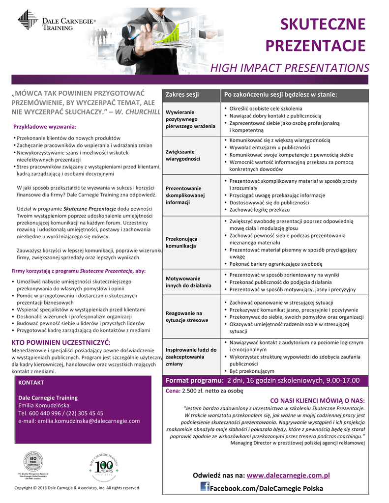 SKUTECZNE PREZENTACJE HIGH IMPACT PRESENTATIONS „MÓWCA TAK POWINIEN PRZYGOTOWAĆ Zakres sesji PRZEMÓWIENIE, B Y W YCZERPAĆ T EMAT, A LE NIE WYCZERPAĆ SŁUCHACZY.” – W. CHURCHILL Wywieranie Po zakończeniu sesji będziesz w stanie: • Określić osobiste cele szkolenia • Nawiązać dobry kontakt z publicznością pozytywnego • Zaprezentować siebie jako osobę profesjonalną pierwszego wrażenia i kompetentną Przykładowe wyzwania: • Przekonanie klientów do nowych produktów • Zachęcanie pracowników do wspierania i wdrażania zmian Zwiększanie • Niewykorzystywanie szans i możliwości wskutek wiarygodności nieefektywnych prezentacji • Stres pracowników związany z wystąpieniami przed klientami, kadrą zarządzającą i osobami decyzyjnymi jaki sposób przekształcić te wyzwania w sukces i korzyści Prezentowanie W finansowe dla firmy? D ale Carnegie Training zna odpowiedź. skomplikowanej informacji Udział w programie Skuteczne Prezentacje doda pewności Twoim wystąpieniom poprzez udoskonalenie umiejętności przekonującej komunikacji na każdym forum. Uczestnicy rozwiną i udoskonalą umiejętności, postawy i zachowania niezbędne u wyróżniającego się mówcy. Przekonująca komunikacja Zauważysz korzyści w lepszej komunikacji, poprawie wizerunku firmy, zwiększonej sprzedaży oraz lepszych wynikach. • Komunikować się z większą wiarygodnością • Wywołać entuzjazm u publiczności • Komunikować swoje kompetencje z pewnością siebie • Wzmocnić wartość informacyjną przekazu za pomocą konkretnych dowodów • Prezentować skomplikowany materiał w sposób prosty i zrozumiały • Przyciągać uwagę przekazując informacje • Dostosowywać się do publiczności • Zachować logikę przekazu • Zwiększyć swobodę prezentacji poprzez odpowiednią mowę ciała i modulację głosu • Zachować pewność siebie podczas prezentowania nieznanego materiału • Prezentować materiał pisemny w sposób przyciągający uwagę • Pokonać bariery ograniczające swobodę Firmy korzystają z programu Skuteczne Prezentacje, aby: Motywowanie • Umożliwić nabycie umiejętności skuteczniejszego innych do działania przekonywania do własnych pomysłów i opinii • Pomóc w przygotowaniu i dostarczaniu skutecznych prezentacji biznesowych • Wspierać specjalistów w wystąpieniach przed klientami Reagowanie na • Doskonalić wizerunek i profesjonalizm organizacji sytuacje stresowe • Budować pewność siebie u liderów i przyszłych liderów • Przygotować kadrę zarządzającą do kontaktów z mediami KTO POWINIEN UCZESTNICZYĆ: • Prezentować w sposób zorientowany na wyniki • Przekonać publiczność do podjęcia działania • Prezentować w sposób motywujący, jasny i precyzyjny • • • • Zachować opanowanie w stresującej sytuacji Przekazywać komunikat jasno, precyzyjnie i pozytywnie Przekonywać do siebie, swoich pomysłów oraz organizacji Okazywać umiejętność radzenia sobie w stresującej sytuacji • Nawiązywać kontakt z audytorium na poziomie logicznym i emocjonalnym • Wykorzystać strukturę wypowiedzi do zdobycia zaufania publiczności • Być przekonującym Format programu: 2 dni, 16 godzin szkoleniowych, 9.00-‐17.00 Cena: 2.500 zł. netto za osobę ludzi do Menedżerowie i specjaliści posiadający pewne doświadczenie Inspirowanie w wystąpieniach publicznych. Program jest szczególnie użyteczny zaakceptowania zmiany dla kadry kierowniczej, handlowców oraz wszystkich mających kontakt z mediami. KONTAKT Dale Carnegie Training Emilia Komudzińska Tel. 600 440 996 / (22) 305 45 45 e-‐mail: [email protected] CO NASI KLIENCI MÓWIĄ O NAS: “Jestem bardzo zadowolony z uczestnictwa w szkoleniu Skuteczne Prezentacje. W trakcie warsztatu przekonałem się, jak ważne w mojej codziennej pracy jest podniesienie skuteczności prezentowania. Nagrywanie wystąpień i ich projekcja znakomicie obnażyła moje słabości i pokazała błędy, które z pewnością będę się starał poprawić zgodnie ze wskazówkami przekazanymi przez trenera podczas coachingu.” Managing Director w prestiżowej polskiej agencji reklamowej Copyright © 2013 Dale Carnegie & Associates, Inc. All rights r eserved. Odwiedź nas na: www.dalecarnegie.com.pl Facebook.com/DaleCarnegie Polska