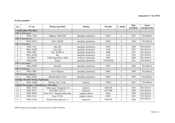 Załącznik Nr 7 do SIWZ Wykaz pojazdów Lp. Nr rej. Marka, typ/model Urząd Gminy Wierzbica OSP w Zalesicach 1. WRA 1V80 Magirus- Deutz FM OSP w Rzeczkowie 2. WRA EM73 DAF 1100TD OSP w Wierzbicy 3. WRA 31JY Star 200 4. WRA A56SJ Jelcz Star 5. WRA 28R1 Star 28/PM 18 6. WRA 42WE Star 7. WR 09625 Volkswagen Bora 1.6Kat 8. WRA51998 Scania OSP w Łączanach 9. WRA 22998 Star 266 OSP w Polanach 10. WRA 70R3 Iveco Magirus OSP Wierzbica Kolonia 11. WRA 23055 Renault GBA 2,2/24 Gminny Ośrodek Pomocy Społecznej 12. WRA 14400 Polonez Caro 1,6 kat. Zakład Wodociągów i Kanalizacji w Wierzbicy 13. WRA 18923 Volkswagen Transporter 2.0 14. WRA 5N17 FS-Lublin 3322/11 15. WRA 8M05 Ursus 4512 - koparko-ładowarka 16. WRA FA61 Ursus 3512K 17. WRA 27423 Skoda Felicia pick-up 1,3 Rodzaj Poj./ład. L. miejsc Rok produkcji Suma ubezpieczenia specjalny, pożarniczy 8224/ 6 1981 Nie dotyczy specjalny, pożarniczy 6240/ 6 1990 Nie dotyczy specjalny, pożarniczy specjalny, pożarniczy specjalny, pożarniczy specjalny, pożarniczy osobowy, operacyjny specjalny, pożarniczy 8143/ 8143/ 6800 8143 1598/12742/6520 8 4 2 2 5 6 1988 1987 1979 1976 2000 2013 specjalny, pożarniczy 8143/ 6 1988 Nie dotyczy specjalny, pożarniczy 6086/ 8 1988 Nie dotyczy specjalny, pożarniczy 6180/ 8 1993 Nie dotyczy osobowy 1598/0 5 2001 Nie dotyczy osobowy ciężarowy ciągnik rolniczy ciągnik rolniczy 1968/950 2417/900 3860/2500/- 8 9 1 1 1993 1998 1998 1993 ciężarowy 1289/550 2 2000 Nie dotyczy Nie dotyczy Nie dotyczy Nie dotyczy Nie dotyczy Nie dotyczy Nie dotyczy Nie dotyczy Nie dotyczy Nie dotyczy Nie dotyczy SIWZ ubezpieczenie majątku i innych interesów Gminy Wierzbica Strona 1 z 1