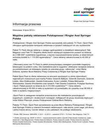 Ringier Axel Springer Polska Informacja prasowa Warszawa, 9 lipca 2012 r. Wspólne pakiety reklamowe Polskapresse i Ringier Axel Springer Polska Polskapresse i Ringier Axel Springer Polska wprowadziły dziś pakiety TV Pack i Sport Pack, oferujące ogólnopolskie kampanie reklamowe w tytułach należących do obu wydawnictw. Pakiet TV Pack oferuje reklamę o zasięgu ogólnopolskim w dodatkach telewizyjnych Tele Magazyn oraz Fakt TV. Wspólna oferta dwóch wiodących wydawnictw pozwoli na dotarcie do 2 488 000* czytelników tygodniowo, a łączne rozpowszechnianie tytułów, w skład których wchodzą dodatki to 1 115 000 egzemplarzy**. Cena reklamy całostronicowej to 40 000 zł netto. „Oferowany przez nas TV Pack to pakiet przewyższający zasięgiem pozostałe magazyny telewizyjne na polskim rynku. Dla marketerów jest to wygodne i efektywne narzędzie dotarcia za pośrednictwem aż dziewięciu tytułów do szerokiej grupy odbiorczej”, mówi Marta Dolecka, dyrektor Biura Reklamy Prasy Codziennej w Ringier Axel Springer Polska. Pakiet Sport Pack to oferta reklamowa na stronach sportowych w ośmiu dziennikach regionalnych zrzeszonych pod marką Polska: Dziennik Bałtycki, Dziennik Zachodni, Dziennik Łódzki, Głos Wielkopolski, Gazeta Krakowska, Kurier Lubelski, Polska Metropolia Warszawska, Gazeta Wrocławska oraz tytułach: Fakt Gazeta Codzienna, Przegląd Sportowy i Sport. Pakiet pozwoli na dotarcie do 4 215 000 czytelników***. Cena reklamy całostronicowej to 55 000 zł netto w wydaniach od poniedziałku do czwartku oraz 99 000 zł netto w wydaniu magazynowym. „Sport Pack to zasięgowe narzędzie przeznaczone dla marketerów poszukujących wygodnych, czytelnych i skutecznych rozwiązań, trafiających do grupy docelowej mężczyzn”, mówi Wiktor Pilarczyk, prezes Polskapresse Oddział Biuro Reklamy. Pakiety TV Pack i Sport Pack sprzedawane są przez Biura Reklamy Polskapresse i Ringier Axel Springer Polska w czterech formatach reklamowych: cała strona, junior page, pół strony i jedna trzecia strony. Cennik reklam w obu pakietach nie podlega rabatowaniu. * Źródło: PBC General, SMG/KRC, V 2011 - IV 2012 r., wskaźnik OTS1+, TV Pack: Tele Magazyn, Fakt TV ** Źródło: promocja wg. ZKDP, IV 2012 r., rozpowszechnianie płatne czwartki (Fakt Gazeta Codzienna), piątki (dzienniki z Tele Magazynem: Polska Dziennik Bałtycki, Polska Dziennik Łódzki, Polska Dziennik Zachodni, Polska Gazeta Krakowska, Polska Gazeta Wrocławska, Polska Głos Wielkopolski, Polska Kurier Lubelski, Polska Metropolia Warszawska). *** Źródło: PBC General, SMG/KRC, V 2011 - IV 2012 r., wskaźnik CDT piątek, z wyjątkiem Fakt CDT czwartek. Pakiet Sport Pack: Polska Dziennik Bałtycki, Polska Dziennik Łódzki, Polska Dziennik Zachodni, Polska Gazeta Krakowska, Polska Gazeta Wrocławska, Polska Głos Wielkopolski, Polska Kurier Lubelski, Polska Metropolia Warszawska, Przegląd Sportowy, Sport, Fakt. Kontakt: Ringier Axel Springer Polska Anna Gancarz-Luboń rzecznik prasowy Tel. +48 22 232 14 03 Kom. +48 500 121 967 [email protected] Polskapresse Magdalena Chudzikiewicz rzecznik prasowy Kom. +48 504 135 729 [email protected]
