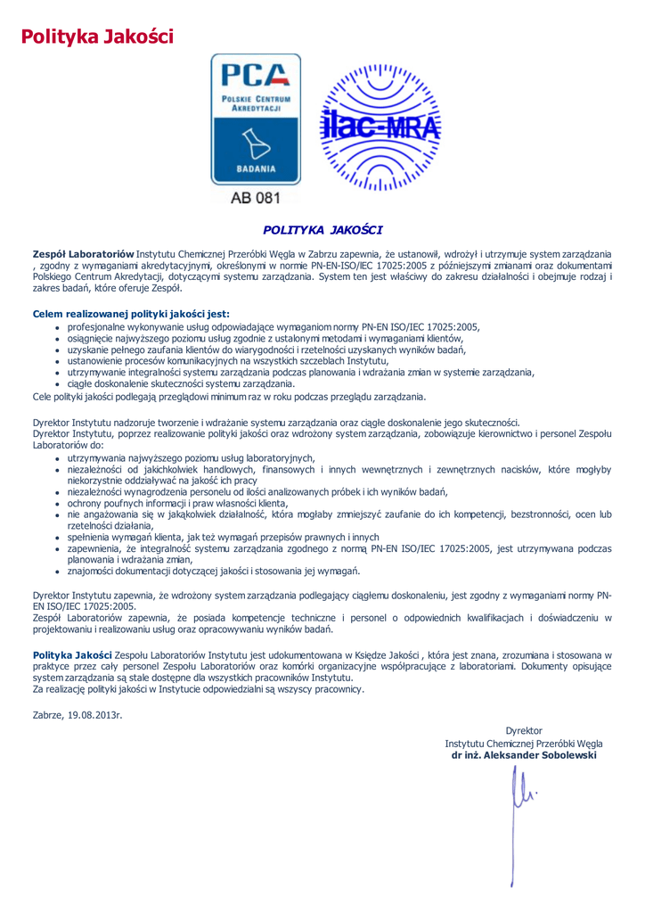 Polityka Jakości POLITYKA JAKOŚCI Zespół Laboratoriów Instytutu Chemicznej Przeróbki Węgla w Zabrzu zapewnia, że ustanowił, wdrożył i utrzymuje system zarządzania , zgodny z wymaganiami akredytacyjnymi, określonymi w normie PN-EN-ISO/lEC 17025:2005 z późniejszymi zmianami oraz dokumentami Polskiego Centrum Akredytacji, dotyczącymi systemu zarządzania. System ten jest właściwy do zakresu działalności i obejmuje rodzaj i zakres badań, które oferuje Zespół. Celem realizowanej polityki jakości jest: profesjonalne wykonywanie usług odpowiadające wymaganiom normy PN-EN ISO/IEC 17025:2005, osiągnięcie najwyższego poziomu usług zgodnie z ustalonymi metodami i wymaganiami klientów, uzyskanie pełnego zaufania klientów do wiarygodności i rzetelności uzyskanych wyników badań, ustanowienie procesów komunikacyjnych na wszystkich szczeblach Instytutu, utrzymywanie integralności systemu zarządzania podczas planowania i wdrażania zmian w systemie zarządzania, ciągłe doskonalenie skuteczności systemu zarządzania. Cele polityki jakości podlegają przeglądowi minimum raz w roku podczas przeglądu zarządzania. Dyrektor Instytutu nadzoruje tworzenie i wdrażanie systemu zarządzania oraz ciągłe doskonalenie jego skuteczności. Dyrektor Instytutu, poprzez realizowanie polityki jakości oraz wdrożony system zarządzania, zobowiązuje kierownictwo i personel Zespołu Laboratoriów do: utrzymywania najwyższego poziomu usług laboratoryjnych, niezależności od jakichkolwiek handlowych, finansowych i innych wewnętrznych i zewnętrznych nacisków, które mogłyby niekorzystnie oddziaływać na jakość ich pracy niezależności wynagrodzenia personelu od ilości analizowanych próbek i ich wyników badań, ochrony poufnych informacji i praw własności klienta, nie angażowania się w jakąkolwiek działalność, która mogłaby zmniejszyć zaufanie do ich kompetencji, bezstronności, ocen lub rzetelności działania, spełnienia wymagań klienta, jak też wymagań przepisów prawnych i innych zapewnienia, że integralność systemu zarządzania zgodnego z normą PN-EN ISO/IEC 17025:2005, jest utrzymywana podczas planowania i wdrażania zmian, znajomości dokumentacji dotyczącej jakości i stosowania jej wymagań. Dyrektor Instytutu zapewnia, że wdrożony system zarządzania podlegający ciągłemu doskonaleniu, jest zgodny z wymaganiami normy PNEN ISO/IEC 17025:2005. Zespół Laboratoriów zapewnia, że posiada kompetencje techniczne i personel o odpowiednich kwalifikacjach i doświadczeniu w projektowaniu i realizowaniu usług oraz opracowywaniu wyników badań. Polityka Jakości Zespołu Laboratoriów Instytutu jest udokumentowana w Księdze Jakości , która jest znana, zrozumiana i stosowana w praktyce przez cały personel Zespołu Laboratoriów oraz komórki organizacyjne współpracujące z laboratoriami. Dokumenty opisujące system zarządzania są stale dostępne dla wszystkich pracowników Instytutu. Za realizację polityki jakości w Instytucie odpowiedzialni są wszyscy pracownicy. Zabrze, 19.08.2013r. Dyrektor Instytutu Chemicznej Przeróbki Węgla dr inż. Aleksander Sobolewski