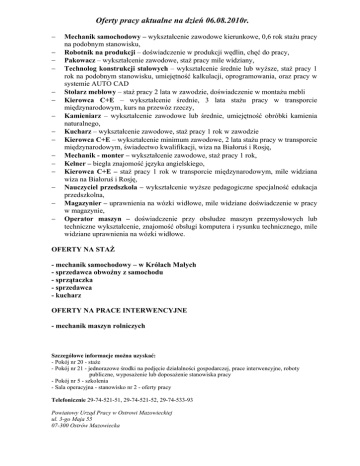 Oferty pracy aktualne na dzień 06.08.2010r. − − − − − − − − − − − − − − − Mechanik samochodowy – wykształcenie zawodowe kierunkowe, 0,6 rok stażu pracy na podobnym stanowisku, Robotnik na produkcji – doświadczenie w produkcji wędlin, chęć do pracy, Pakowacz – wykształcenie zawodowe, staż pracy mile widziany, Technolog konstrukcji stalowych – wykształcenie średnie lub wyższe, staż pracy 1 rok na podobnym stanowisku, umiejętność kalkulacji, oprogramowania, oraz pracy w systemie AUTO CAD Stolarz meblowy – staż pracy 2 lata w zawodzie, doświadczenie w montażu mebli Kierowca C+E – wykształcenie średnie, 3 lata stażu pracy w transporcie międzynarodowym, kurs na przewóz rzeczy, Kamieniarz – wykształcenie zawodowe lub średnie, umiejętność obróbki kamienia naturalnego, Kucharz – wykształcenie zawodowe, staż pracy 1 rok w zawodzie Kierowca C+E – wykształcenie minimum zawodowe, 2 lata stażu pracy w transporcie międzynarodowym, świadectwo kwalifikacji, wiza na Białoruś i Rosję, Mechanik - monter – wykształcenie zawodowe, staż pracy 1 rok, Kelner – biegła znajomość języka angielskiego, Kierowca C+E – staż pracy 1 rok w transporcie międzynarodowym, mile widziana wiza na Białoruś i Rosję, Nauczyciel przedszkola – wykształcenie wyższe pedagogiczne specjalność edukacja przedszkolna, Magazynier – uprawnienia na wózki widłowe, mile widziane doświadczenie w pracy w magazynie, Operator maszyn – doświadczenie przy obsłudze maszyn przemysłowych lub techniczne wykształcenie, znajomość obsługi komputera i rysunku technicznego, mile widziane uprawnienia na wózki widłowe. OFERTY NA STAŻ - mechanik samochodowy – w Królach Małych - sprzedawca obwoźny z samochodu - sprzątaczka - sprzedawca - kucharz OFERTY NA PRACE INTERWENCYJNE - mechanik maszyn rolniczych Szczegółowe informacje można uzyskać: - Pokój nr 20 - staże - Pokój nr 21 - jednorazowe środki na podjęcie działalności gospodarczej, prace interwencyjne, roboty publiczne, wyposażenie lub doposażenie stanowiska pracy - Pokój nr 5 - szkolenia - Sala operacyjna - stanowisko nr 2 - oferty pracy Telefonicznie 29-74-521-51, 29-74-521-52, 29-74-533-93 Powiatowy Urząd Pracy w Ostrowi Mazowieckiej ul. 3-go Maja 55 07-300 Ostrów Mazowiecka